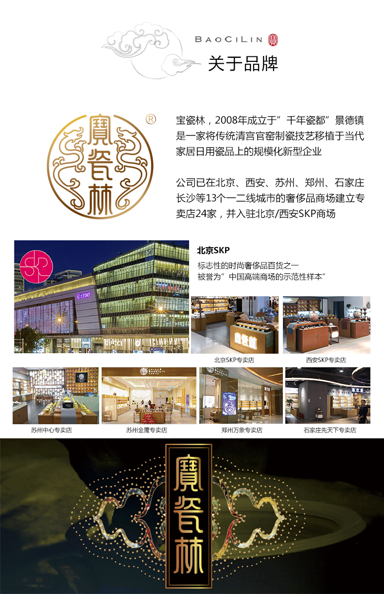 宝瓷林,2008年创立,是一家将传统清宫官窑制瓷技艺,移植于当代家居日用瓷品上的景德镇陶瓷骨干企业,是当下唯一一家代表“千年瓷都-景德镇”走向全球的陶瓷连锁品牌,被誉为陶瓷界的“国酒茅台”。