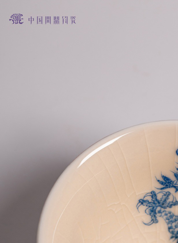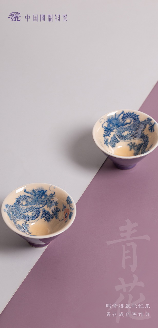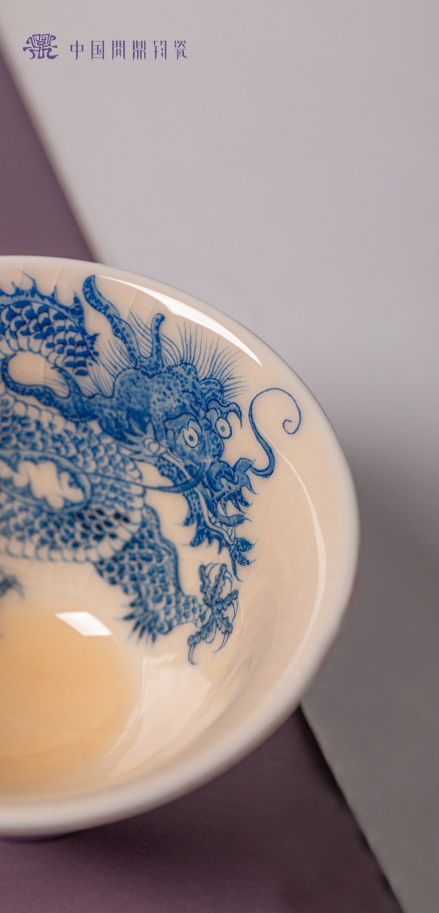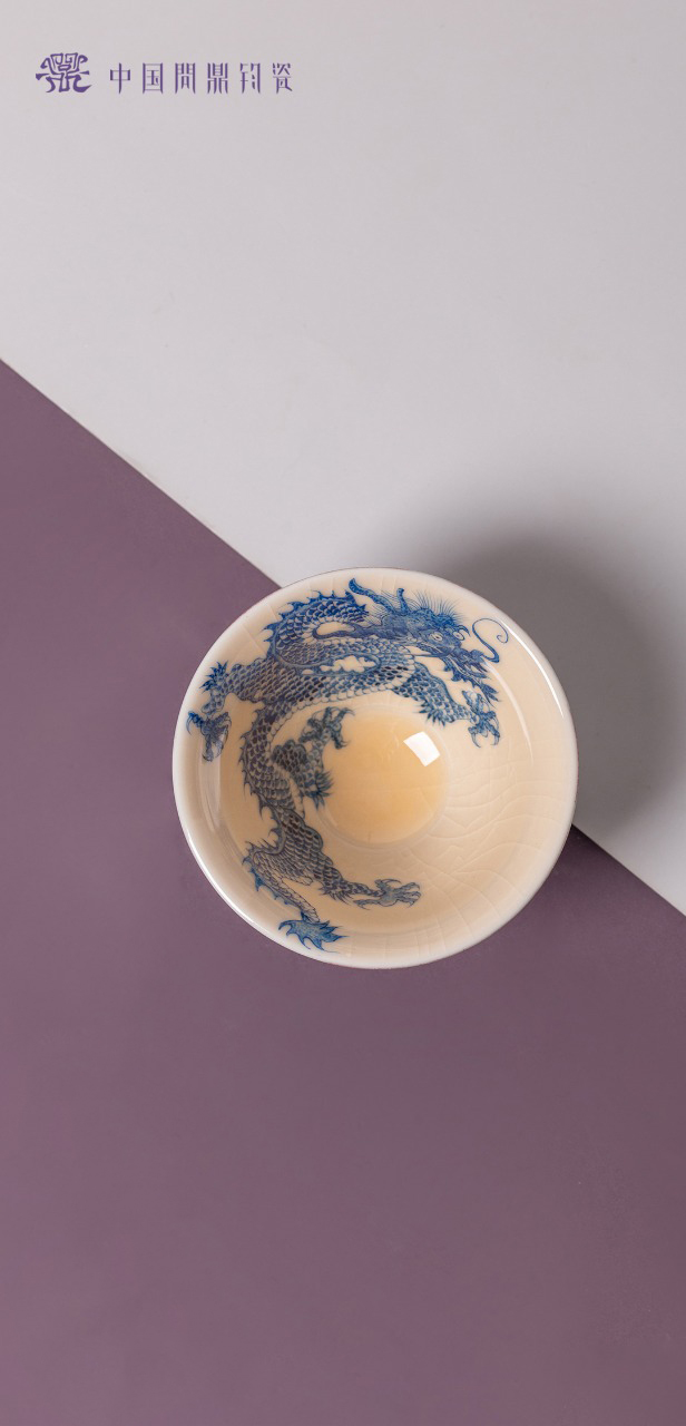 问鼎钧瓷鹅黄青花斗笠杯(龙腾四海)(缺货)