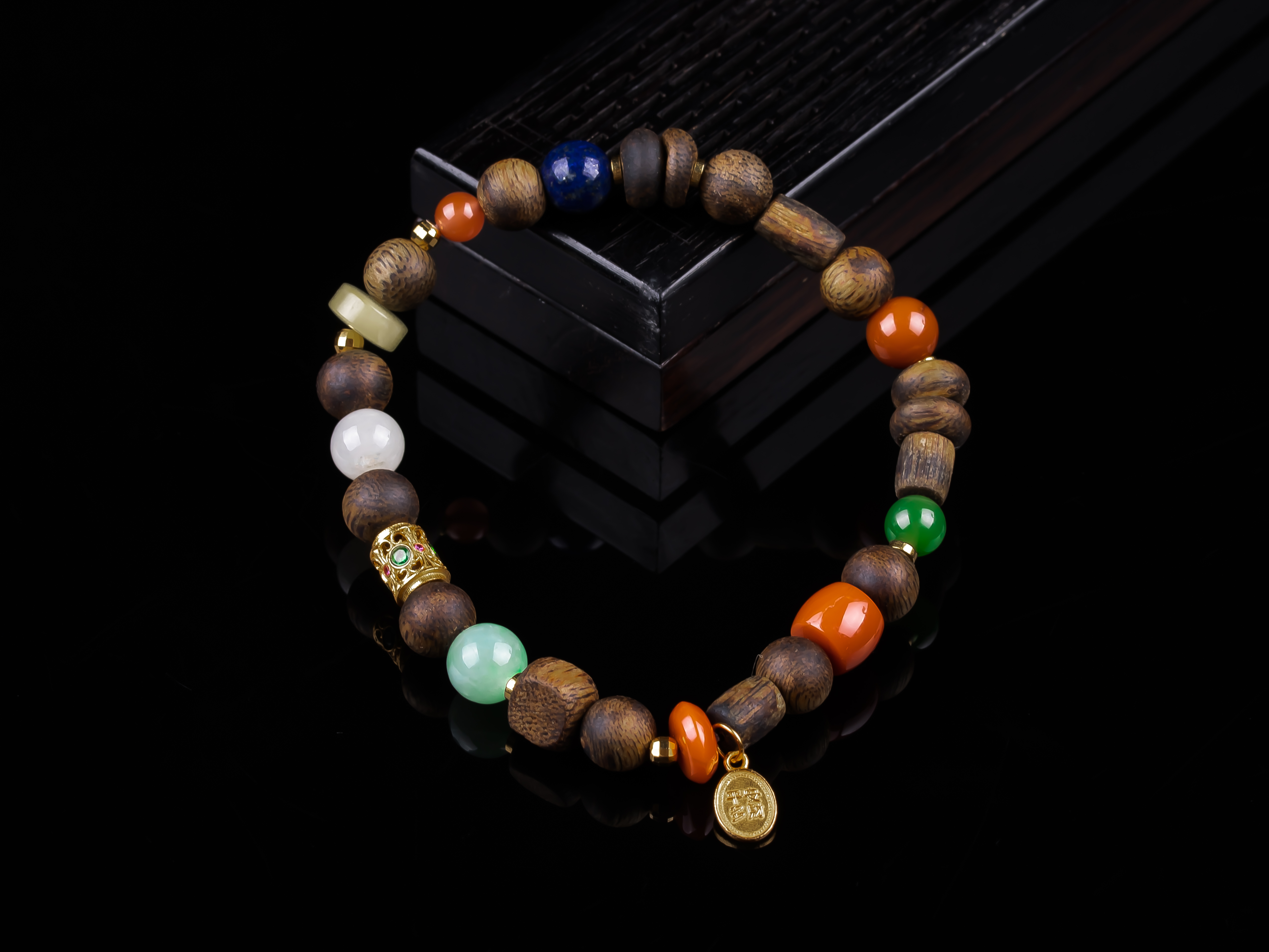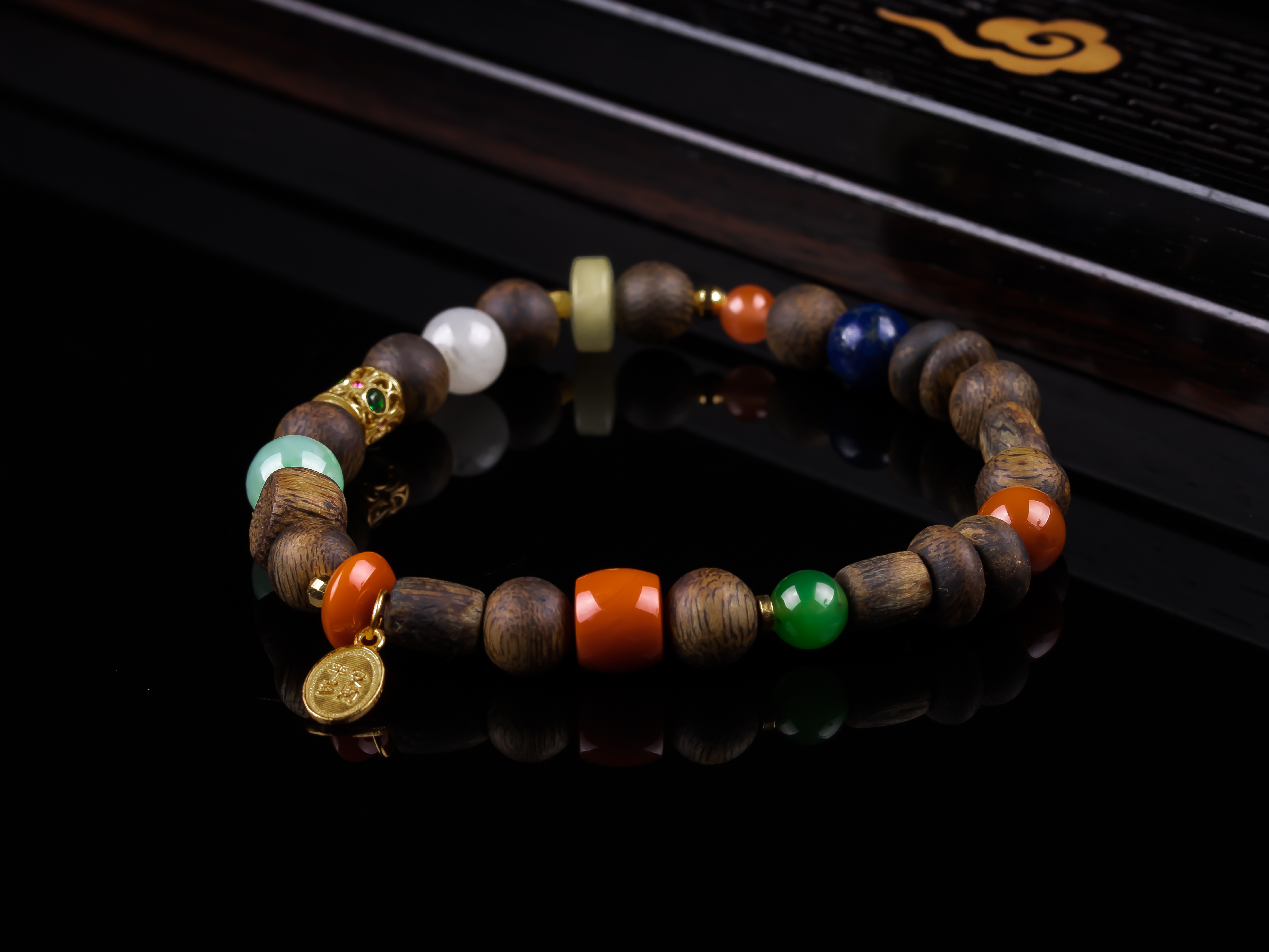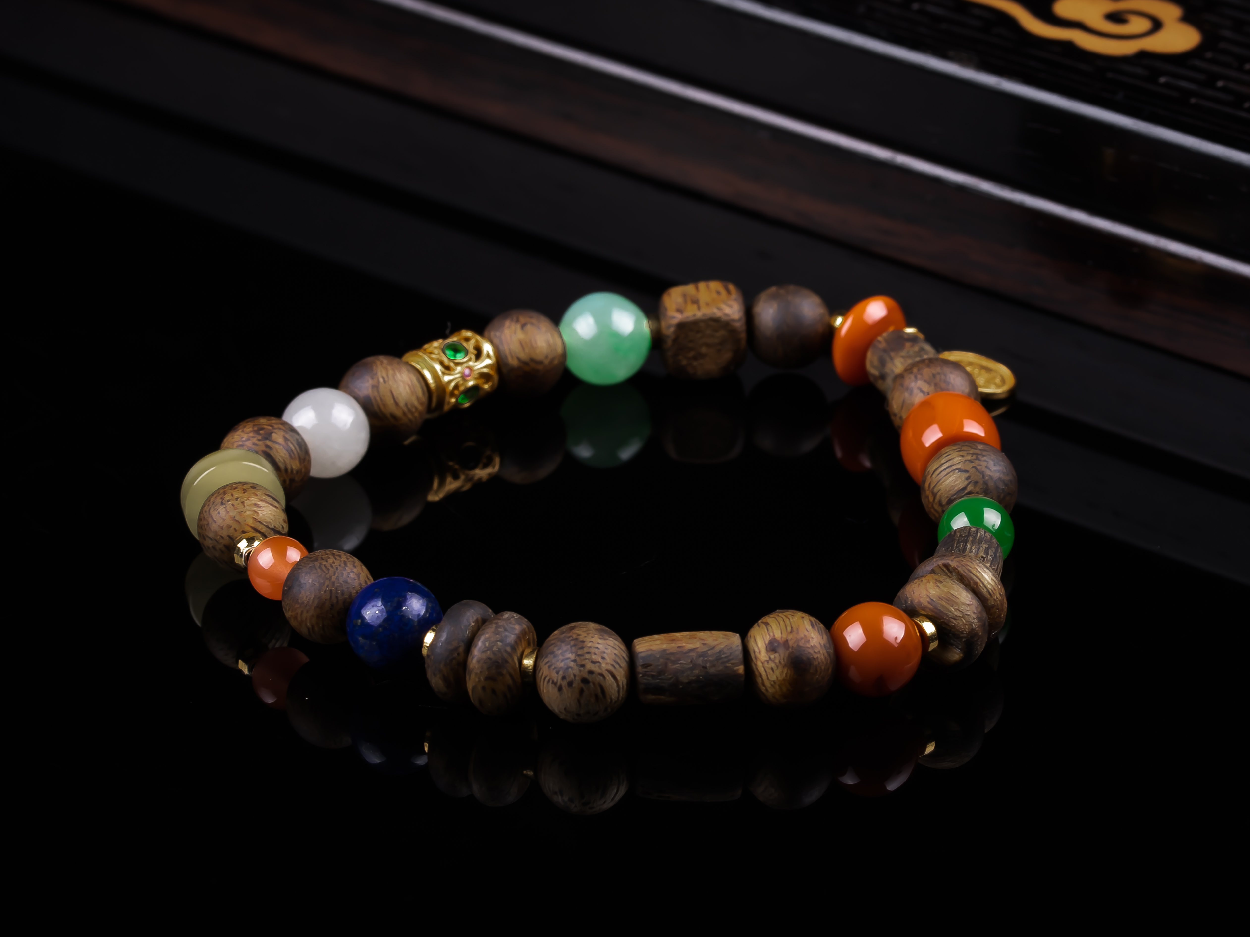 XY0336沉香+翡翠南红多宝随型手串,天然沉香约7.3mm,原色原味,香味自然清甜,圆珠与随形珠混搭,翡翠南红蜜蜡青金石银配饰混搭,这是一款打破常规、随性、随心自由的多宝手串,最适合追求个性风格的你。