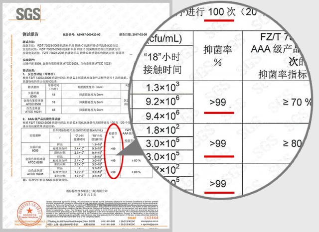 经过专业测评,100次工业洗涤后抗菌率依然大于99%