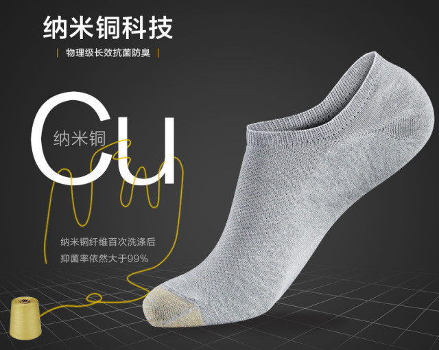 纳米铜成分直接融入纱线中,有极好的吸湿排汗的作用,让每根纱线都能持久有效的抑菌防臭~不仅如此,穿着它还可以驱散闷热,远离瘙痒,促进脚部伤口愈合,让脚部自由呼吸~