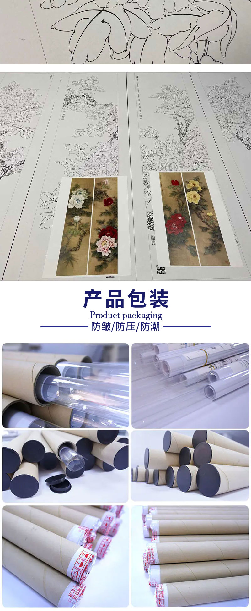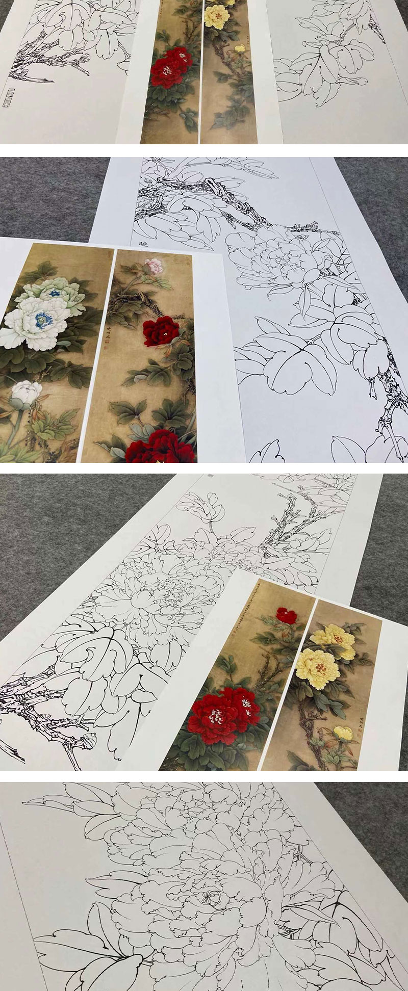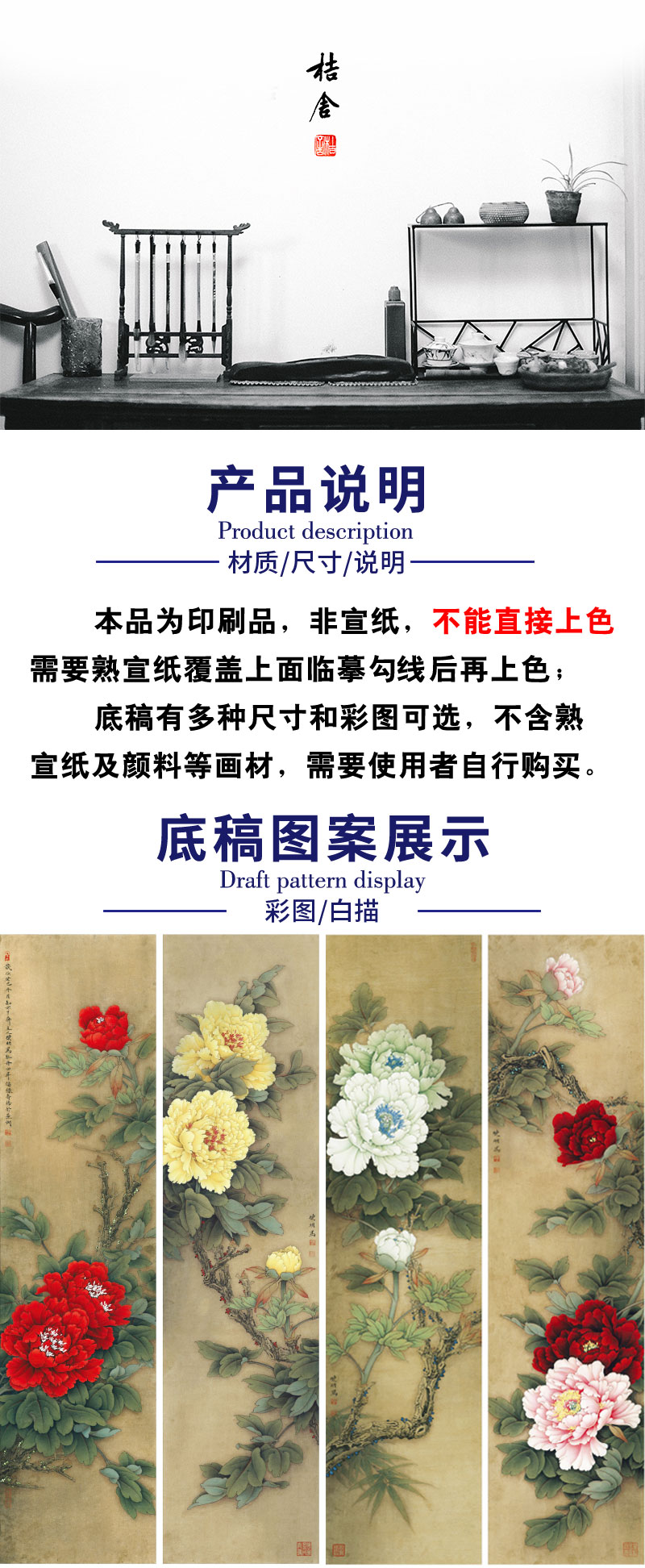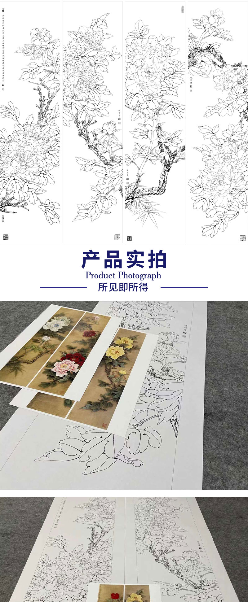【四条屏】李晓明工笔画白描稿《福禄喜寿》牡丹临摹勾线花鸟线稿KA28