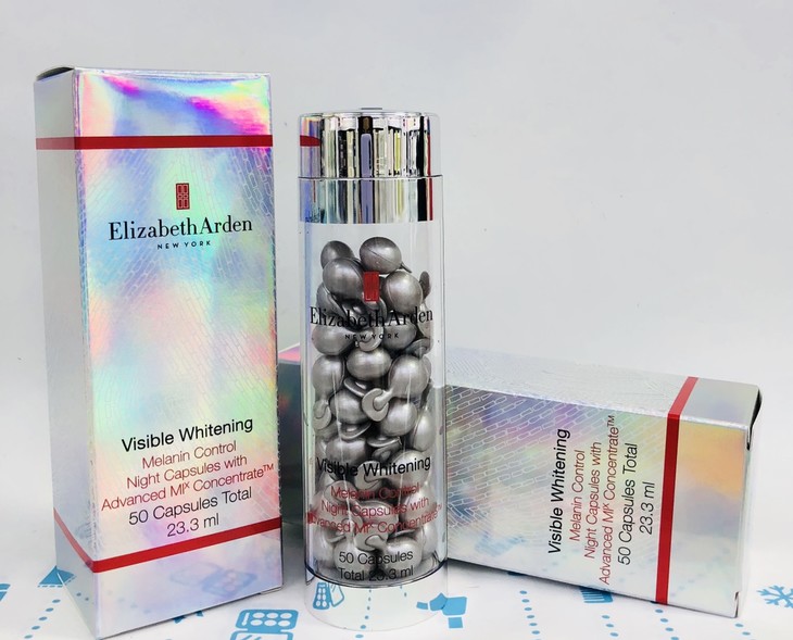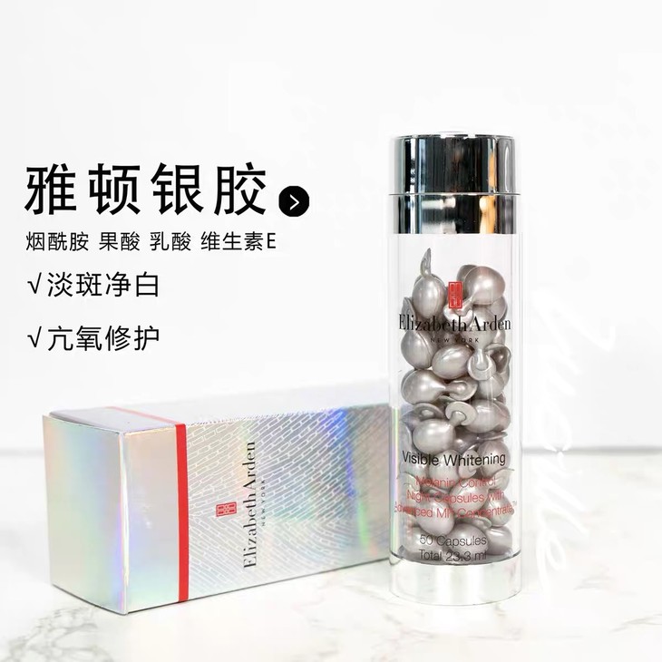 Elizabeth Arden雅顿美白夜间修护胶囊50粒👍银胶是一款主打美白效果的夜间修复精华🌙,蕴含独特的密集美白修护系统✨,有效抑制黑色素👊,帮助淡化色斑,暗斑,同时与肌肤中的天然胶原蛋白🥚、弹性蛋白共同协作,帮助肌肤更柔滑、透亮〽。VC还具有抗氧化能力呢。小小一颗可挤出来的量却很丰富💧,足够抹一整张脸,💆涂抹时可以在暗沉和痘印出加大量哦。