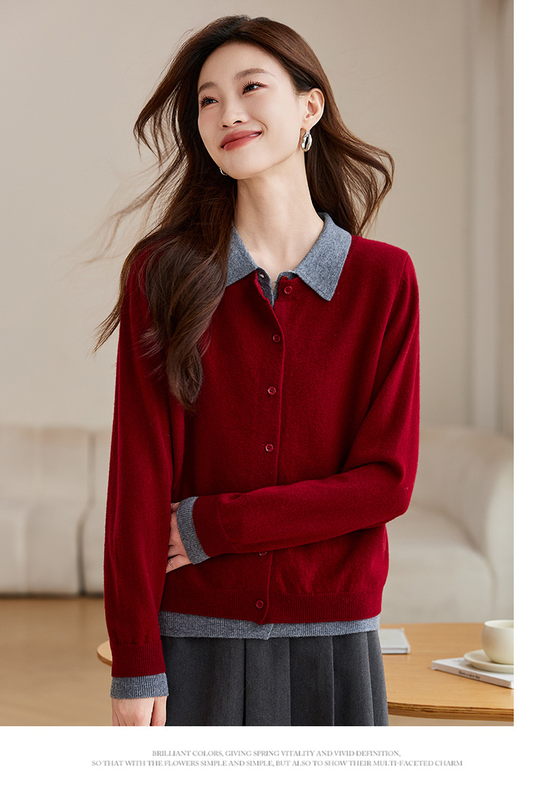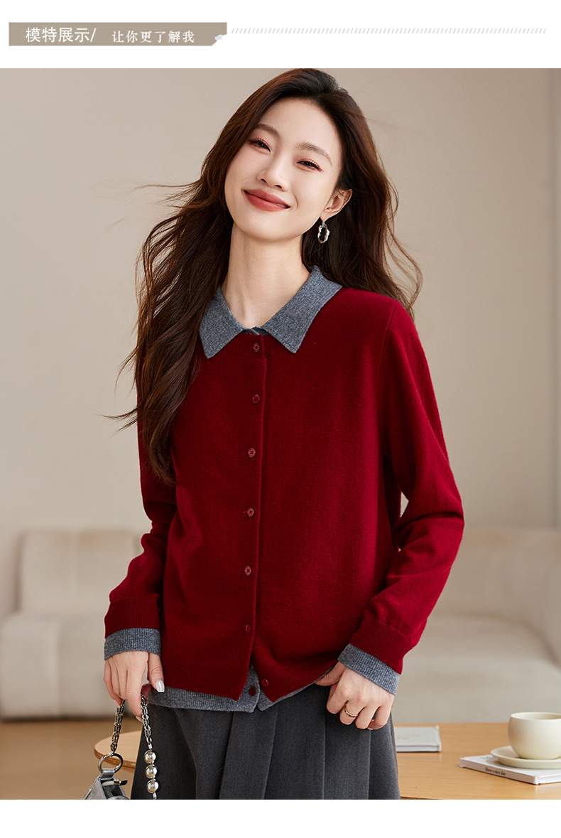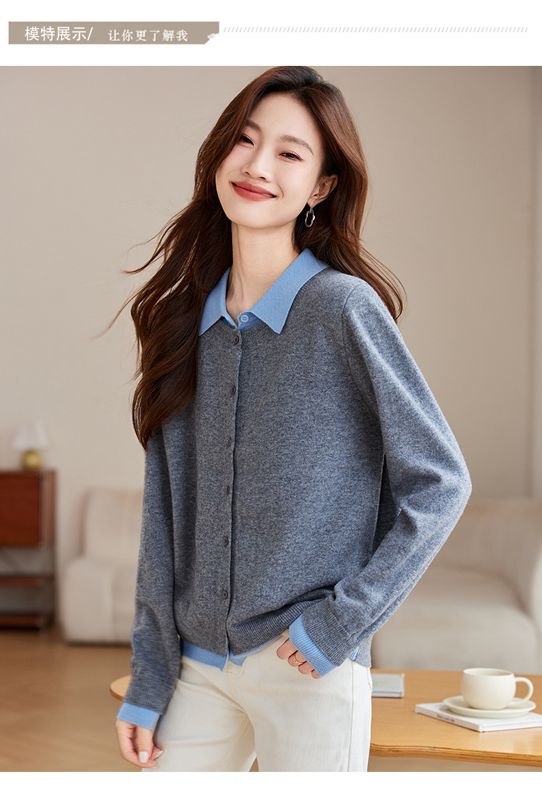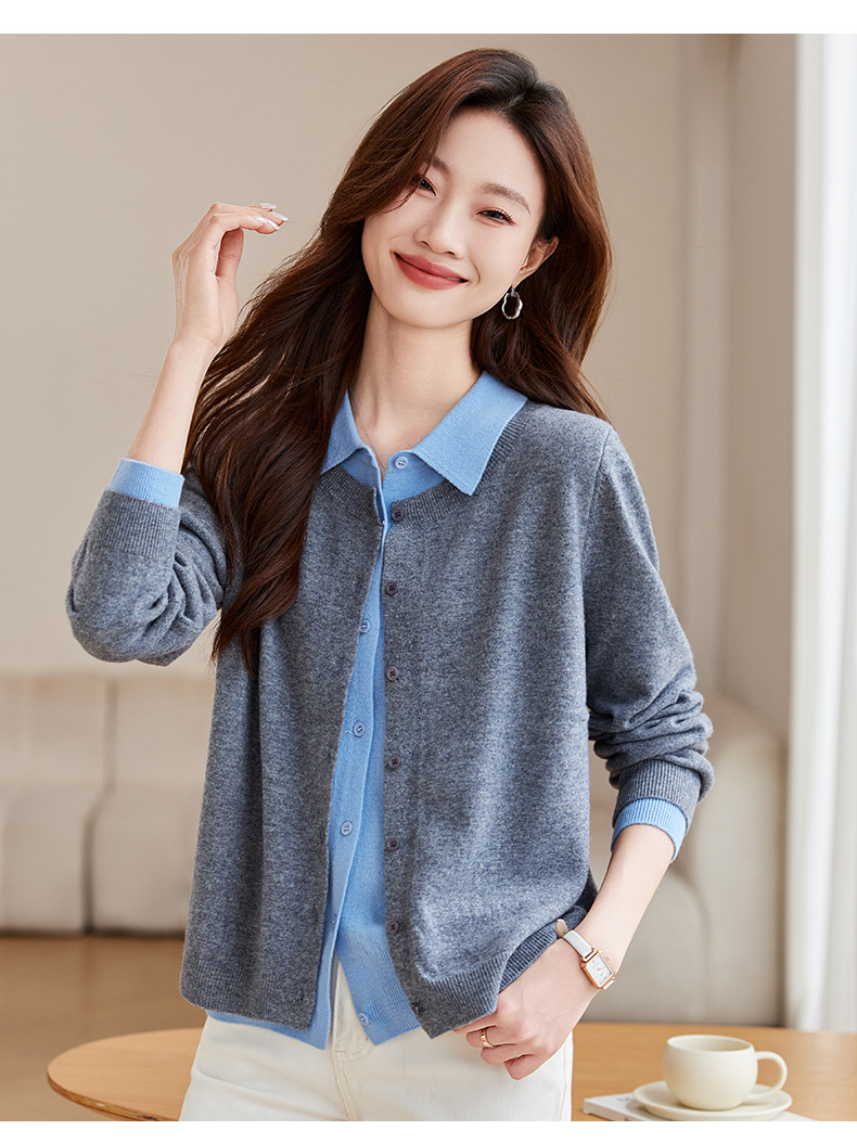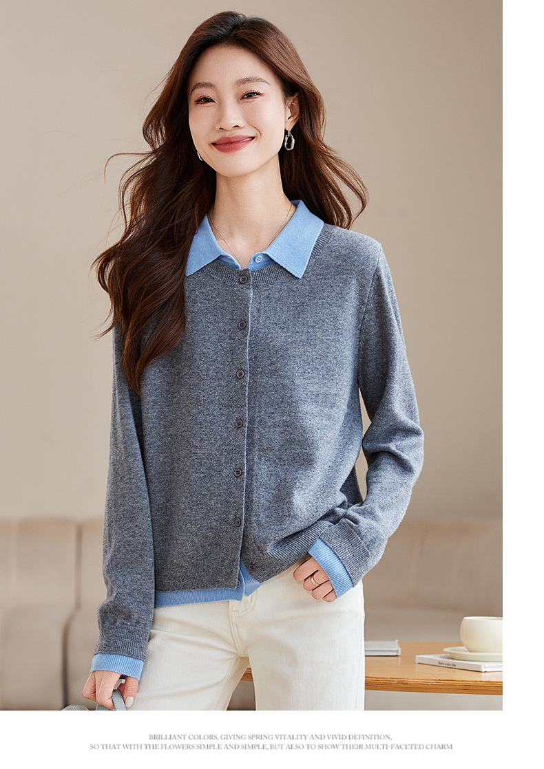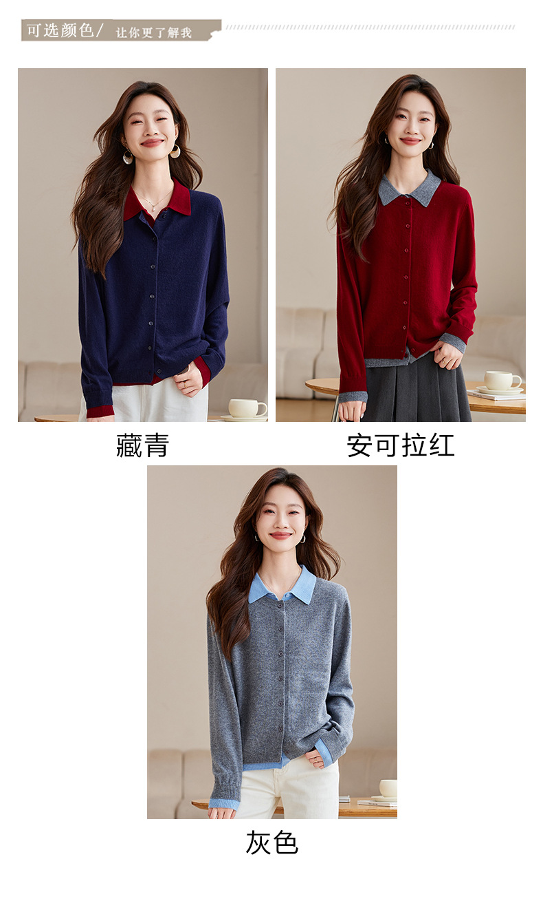CC-J970纯羊毛衫2024新款 短款假两件针织开衫衬衫领拼接毛衣外套女春秋