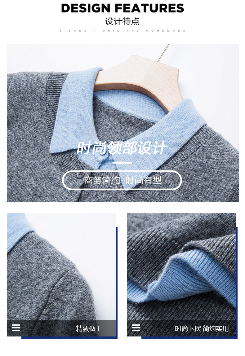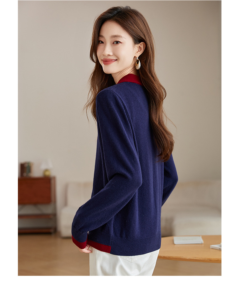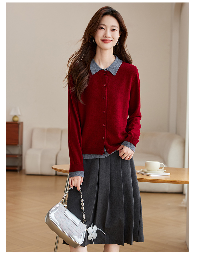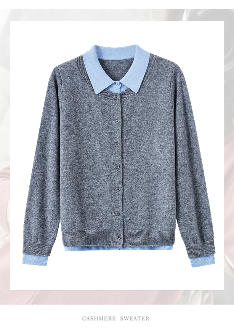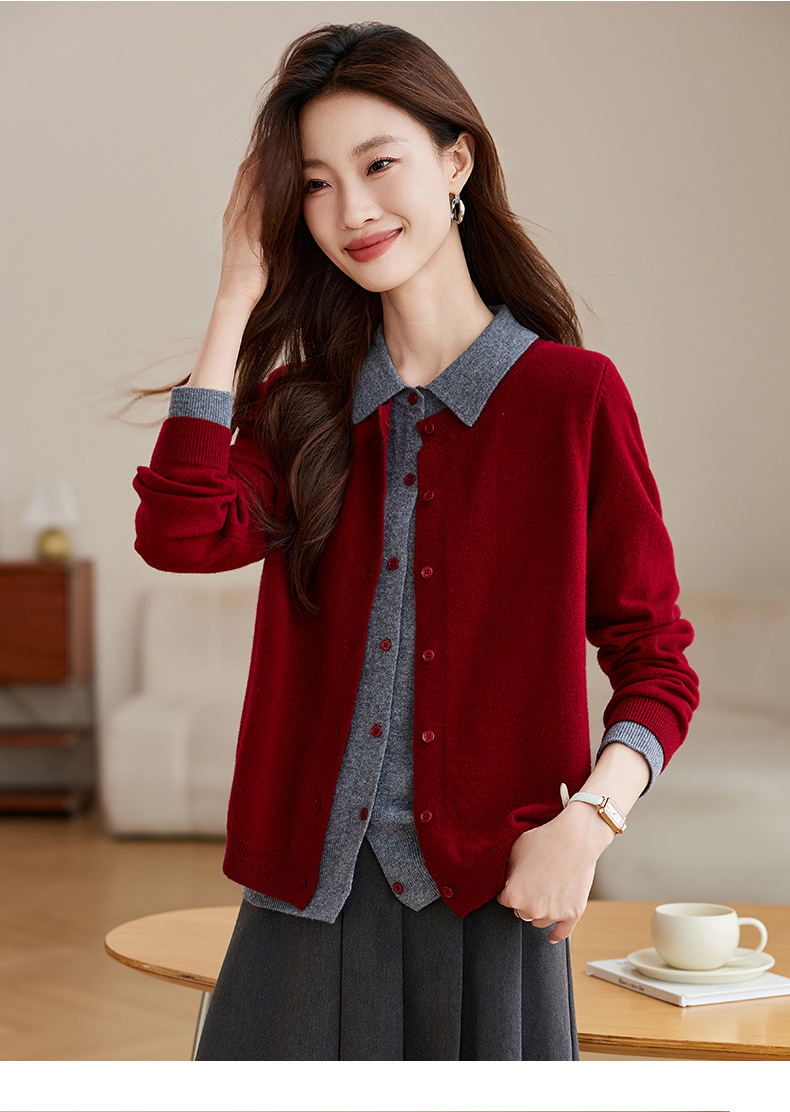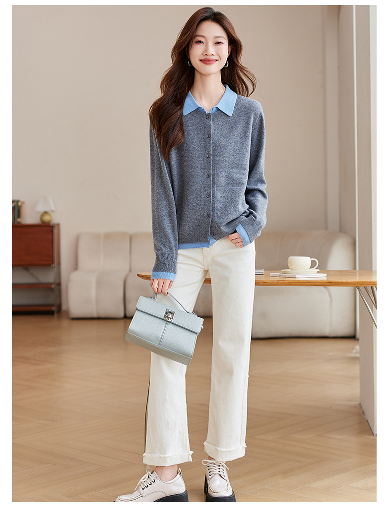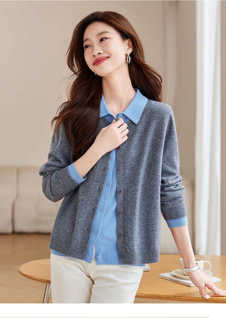 CC-J970纯羊毛衫2024新款 短款假两件针织开衫衬衫领拼接毛衣外套女春秋