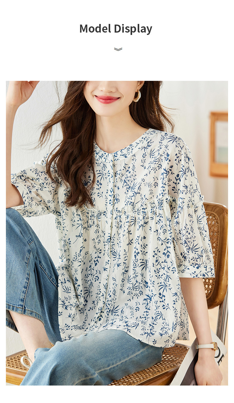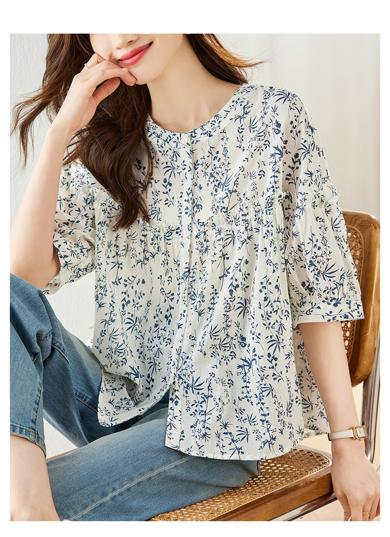 百媚生 纯棉青花瓷小碎花短袖衬衫女35085