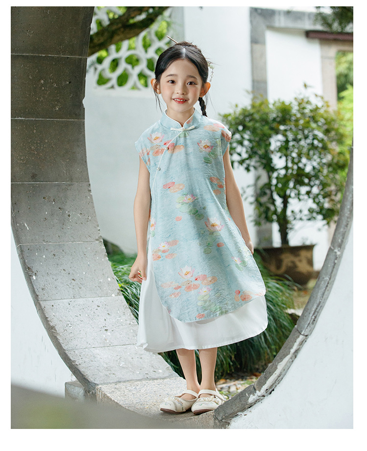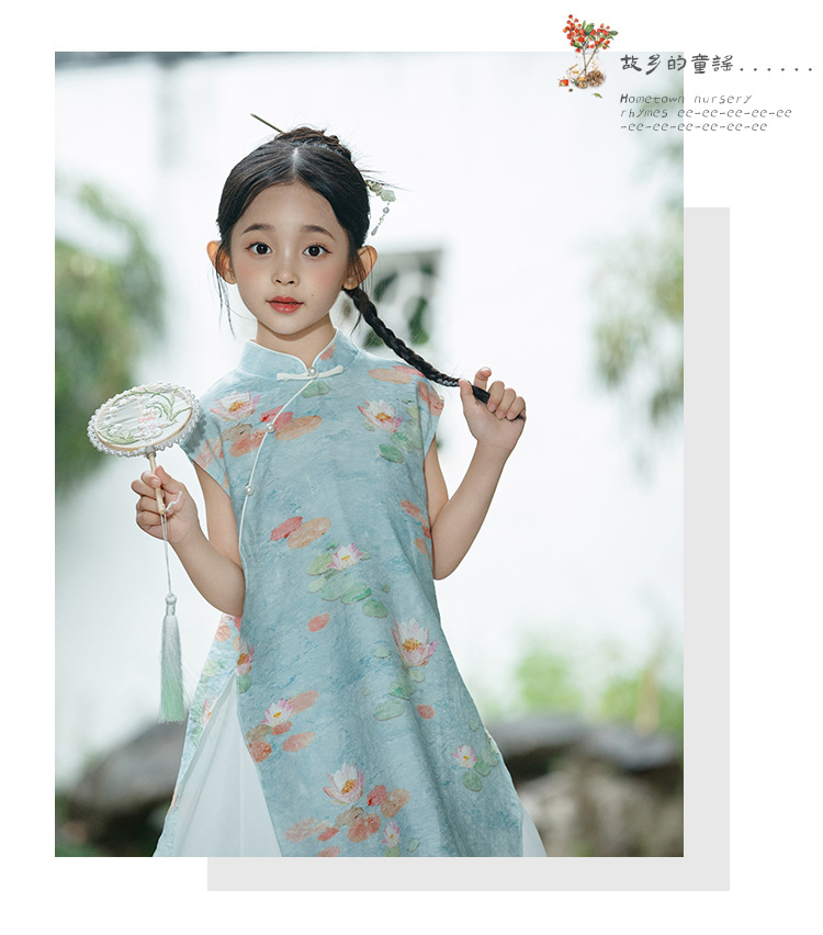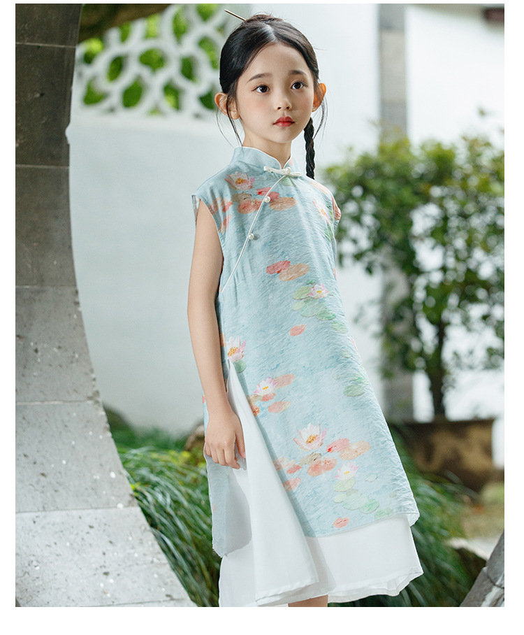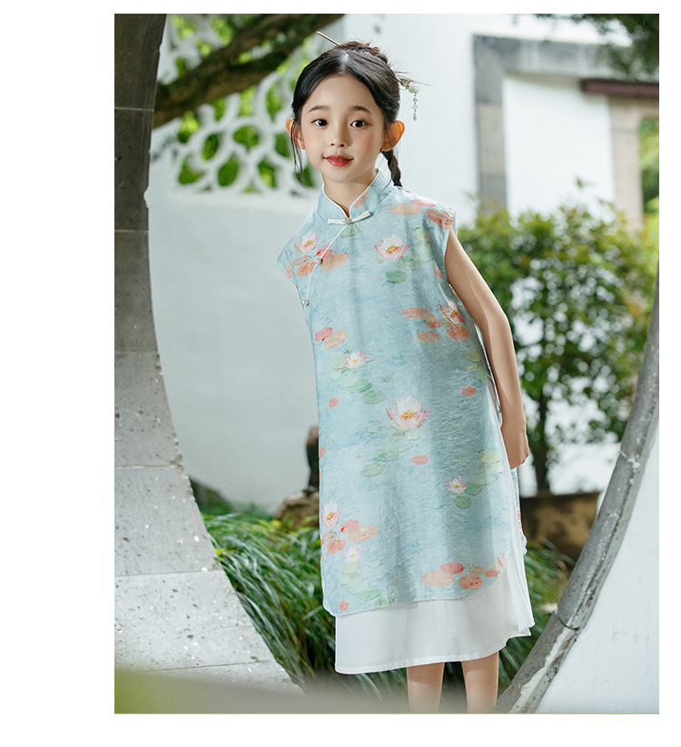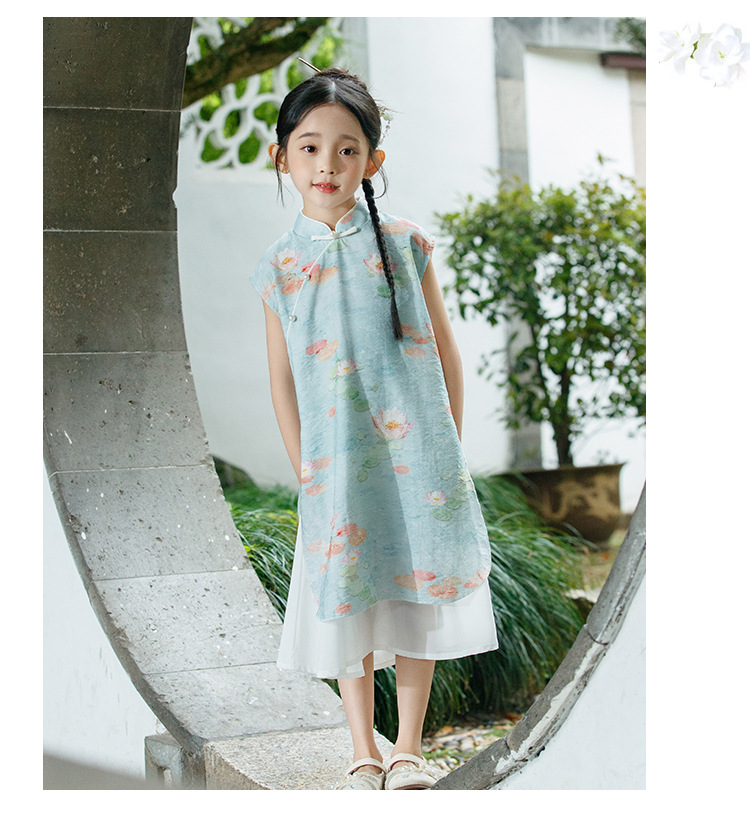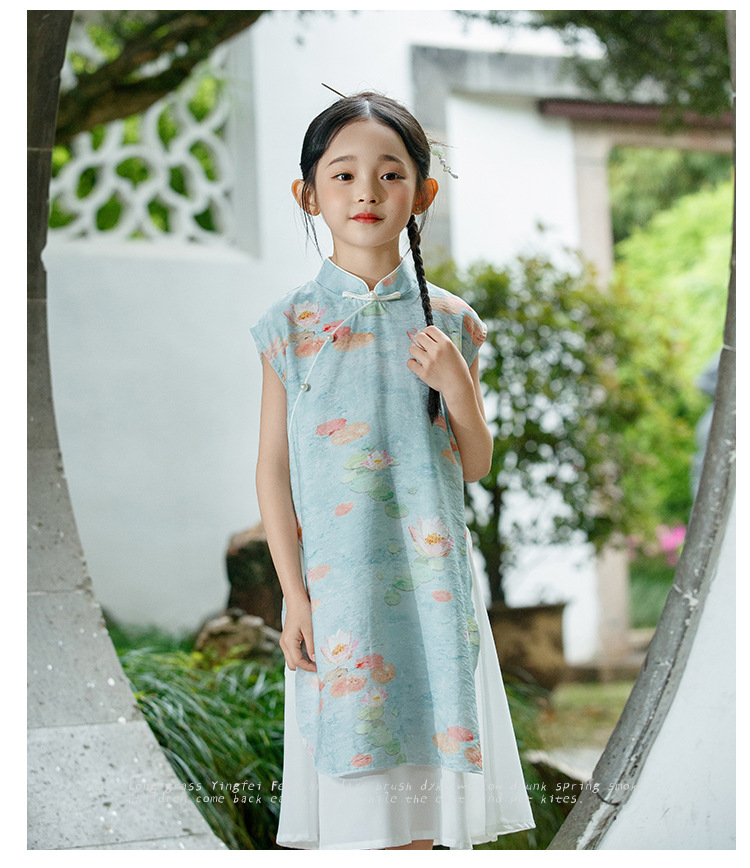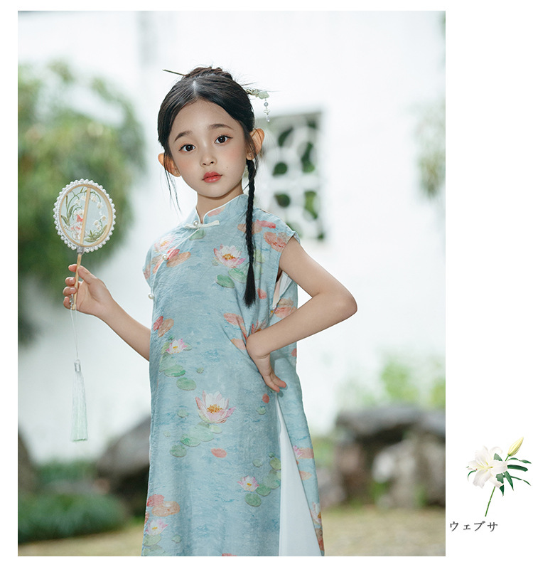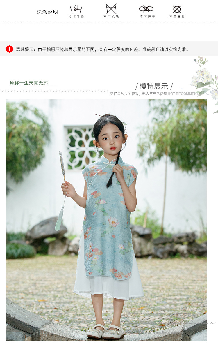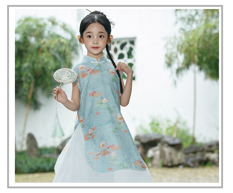 LSB3001女童新中式连衣裙绿色奥黛旗袍夏季2024新款小女孩中国风古风汉服