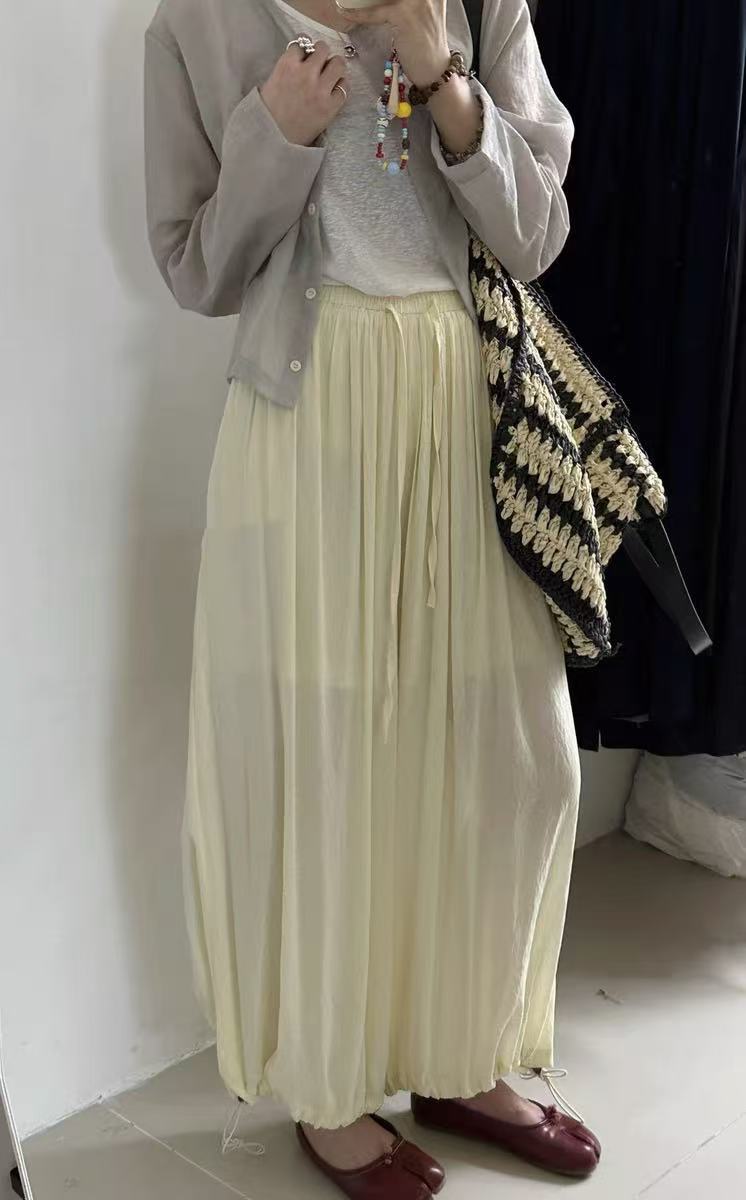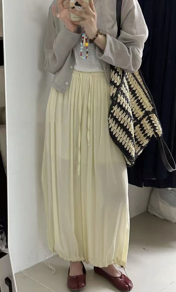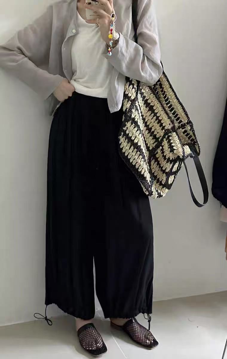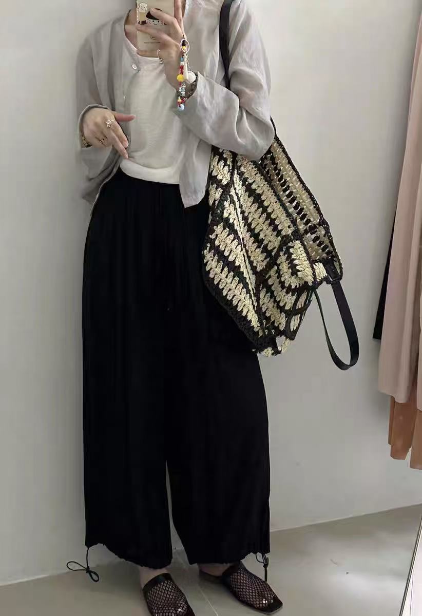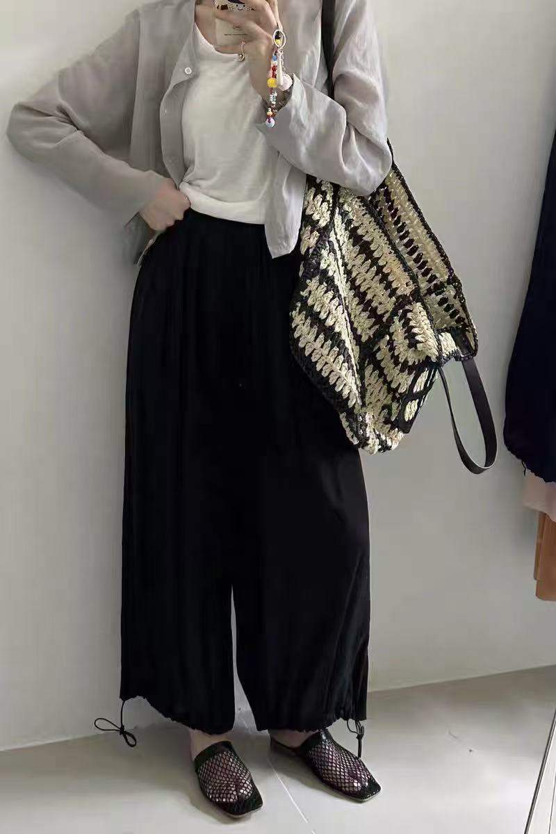 {休闲裤2025}96038 夏季薄款麻纱半内衬阔腿裤束脚裤灯笼裤-喜出