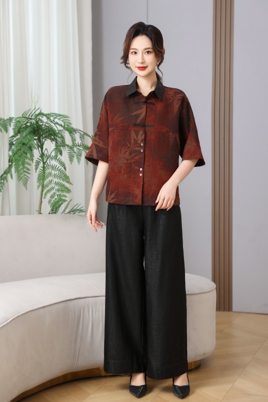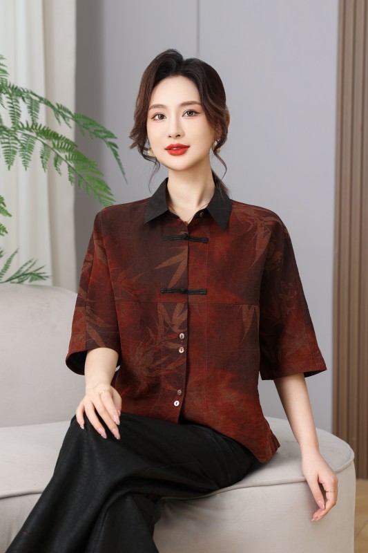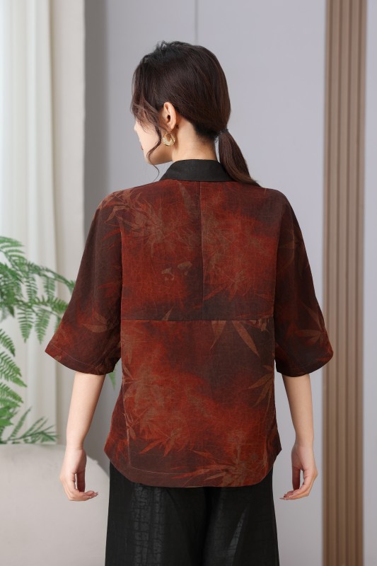 丁摩真丝香云纱春夏100桑蚕丝上衣复古时尚枫叶T恤透气圆领AL2580