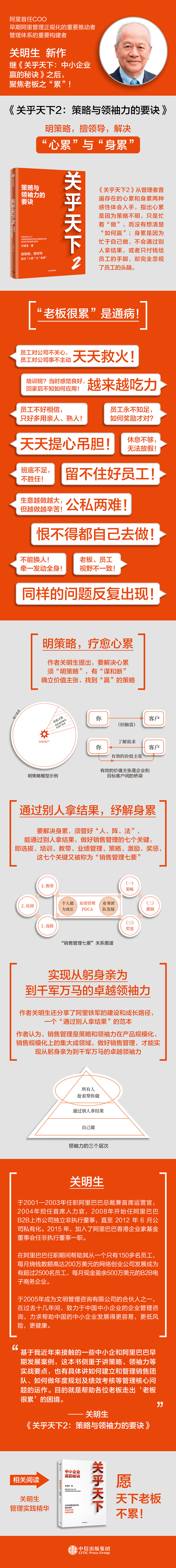 《关乎天下2》后分享了一些企业基业长青的秘籍,主要涉及两个方面,一是企业文化建设,二人才梯队建设。同时在《关乎天下:中小企业赢的秘诀》之“企业有道”的基础之上,作者详尽地分享了阿里文化建设初期的故事,分享从“独孤九剑”到“六脉神剑”的阿里企业价值观演进历程。附录部分是作者近几年来的三篇重要演讲。