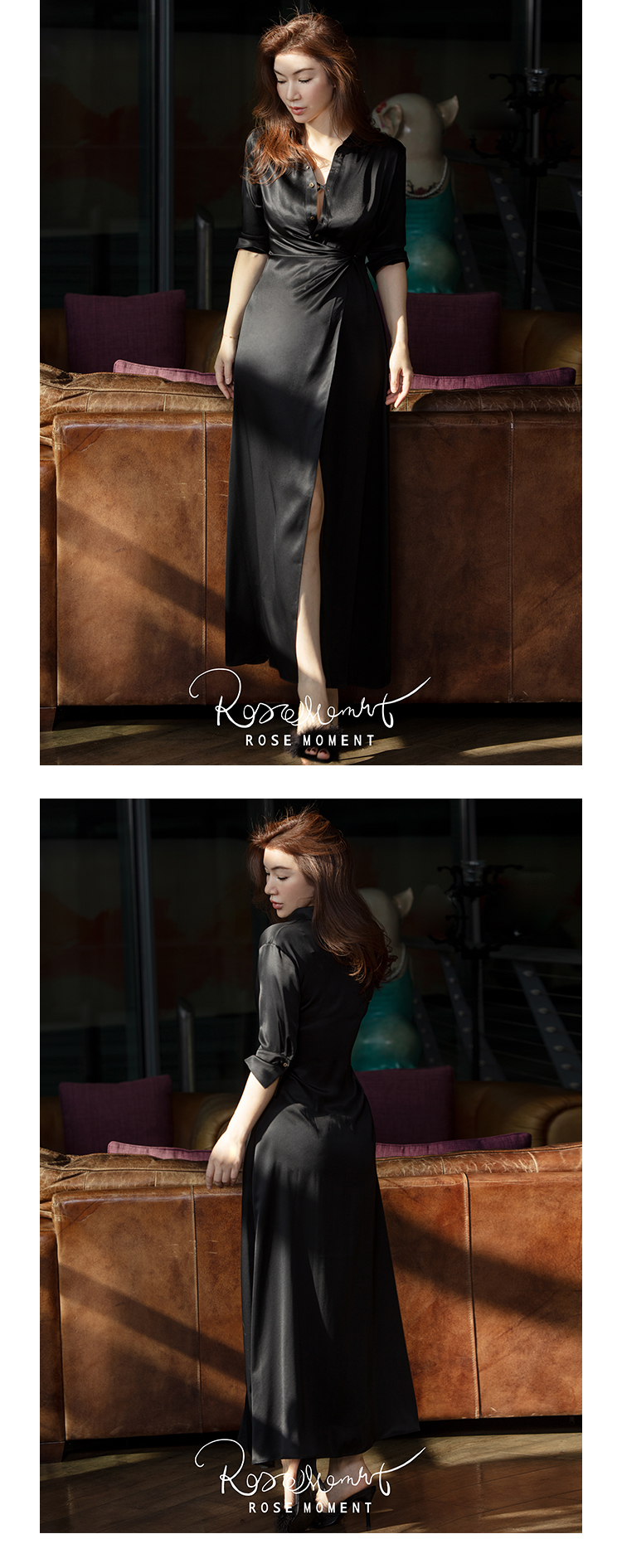 衬衫领纽结掐腰侧开叉长裙长袍 G240936