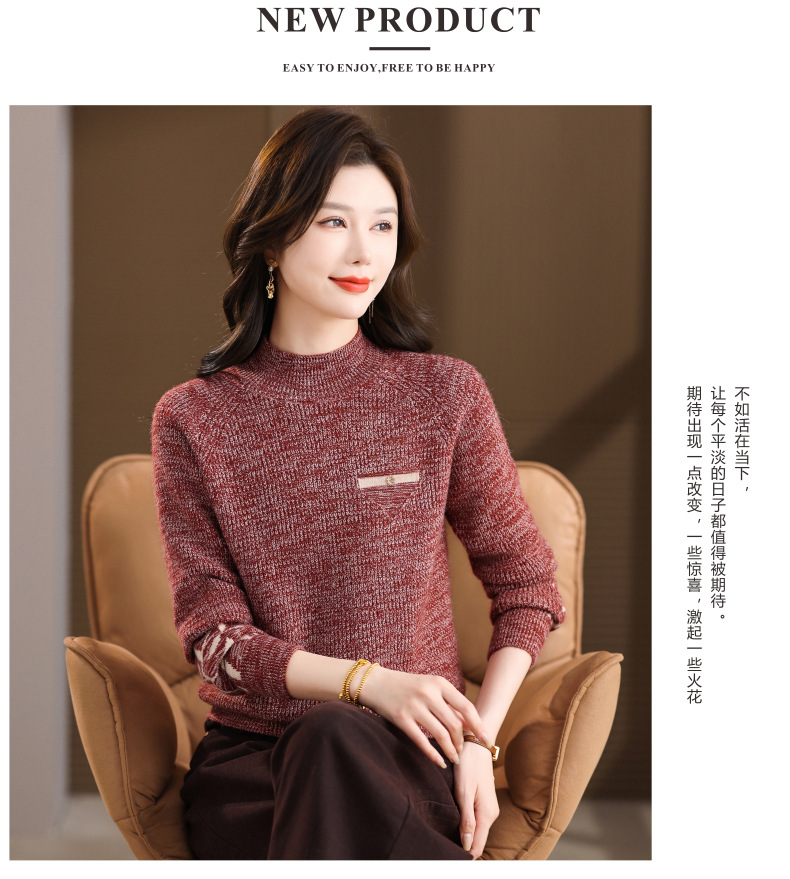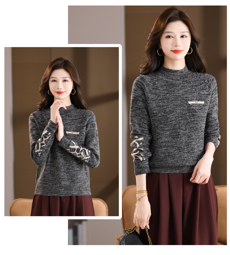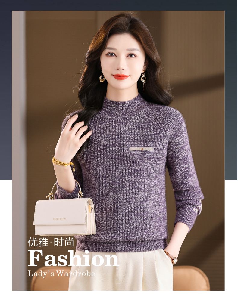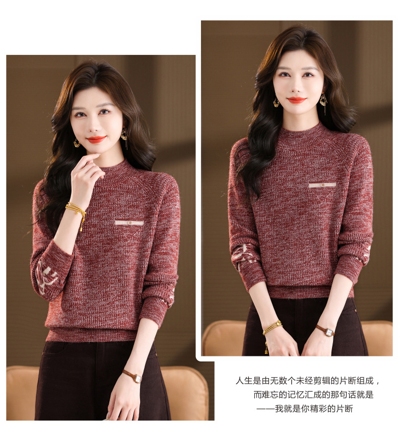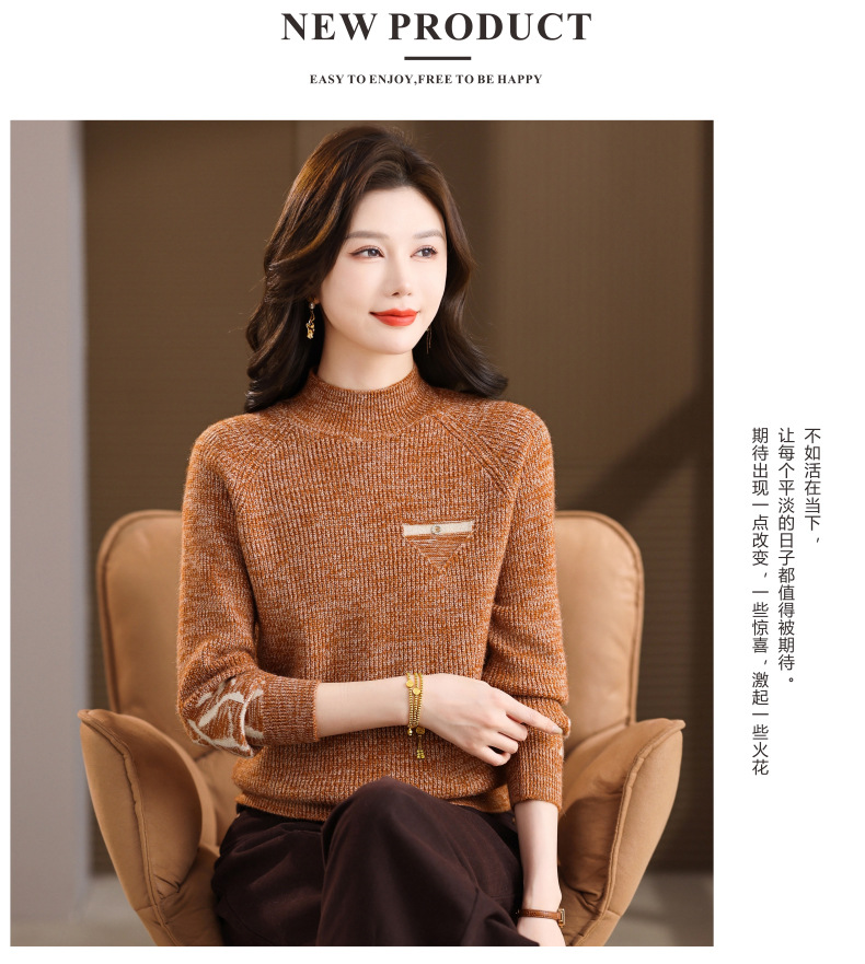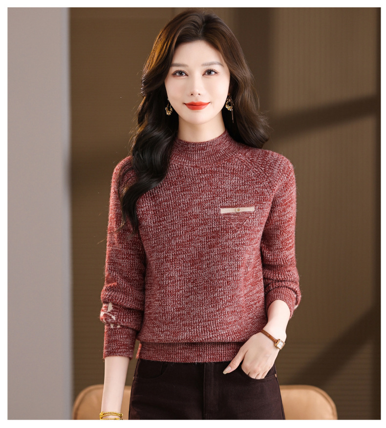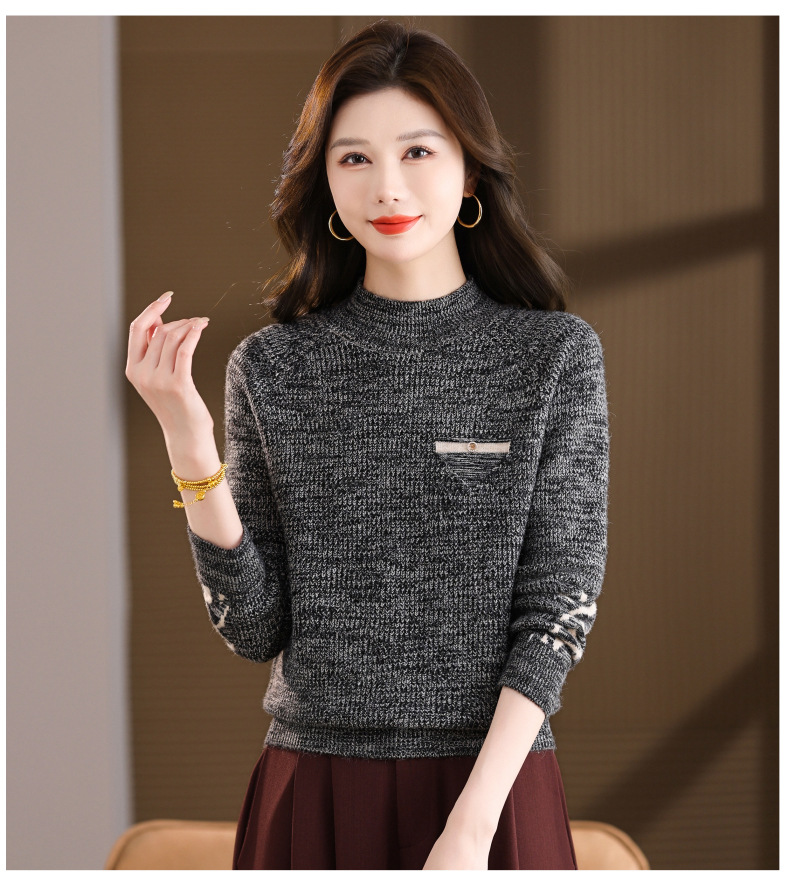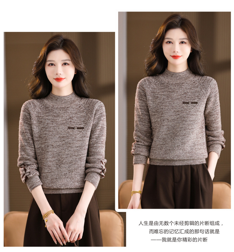 CC2025秋冬新款混色半高领毛衣女针织拼接口袋长袖显瘦内搭短款上衣