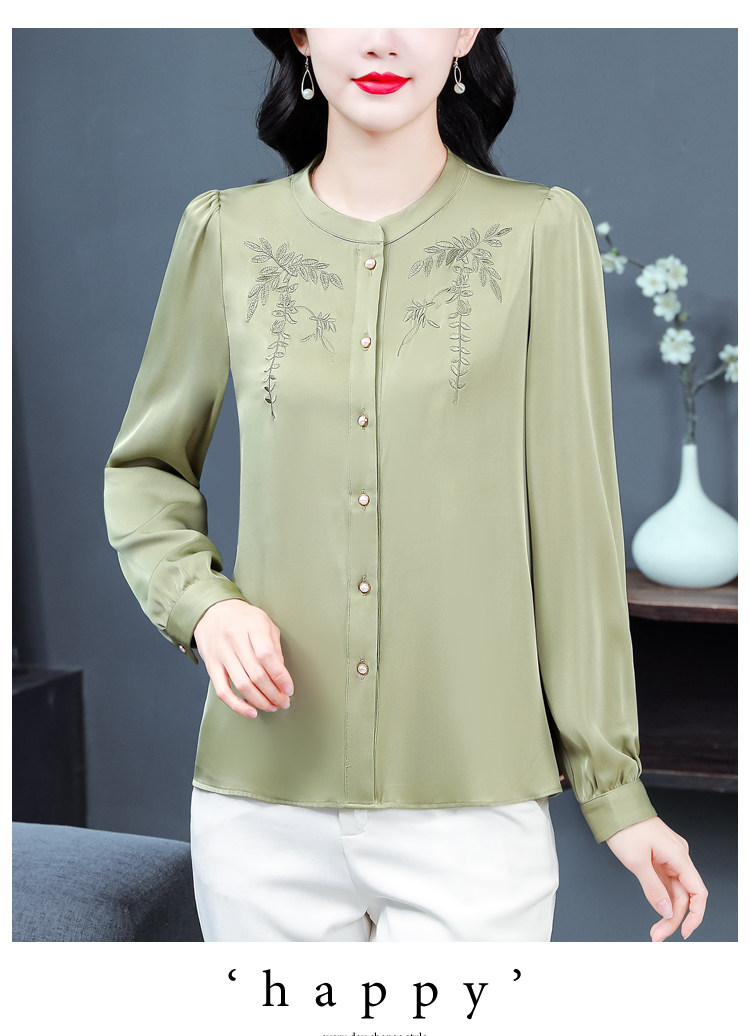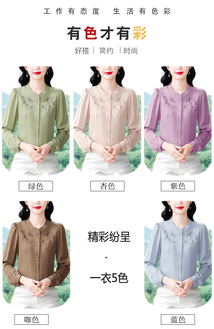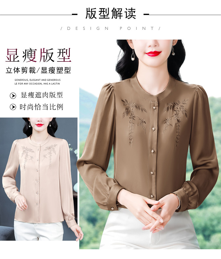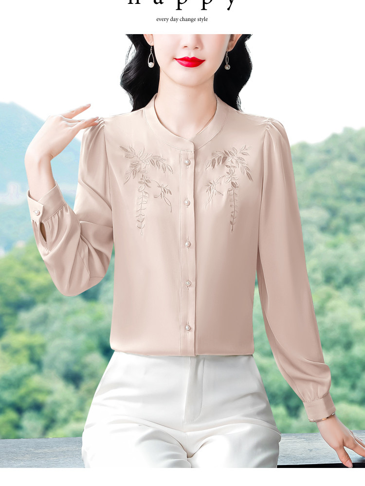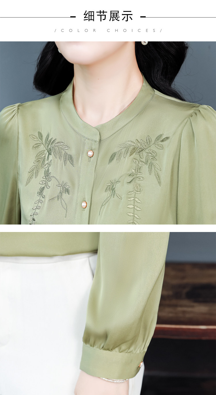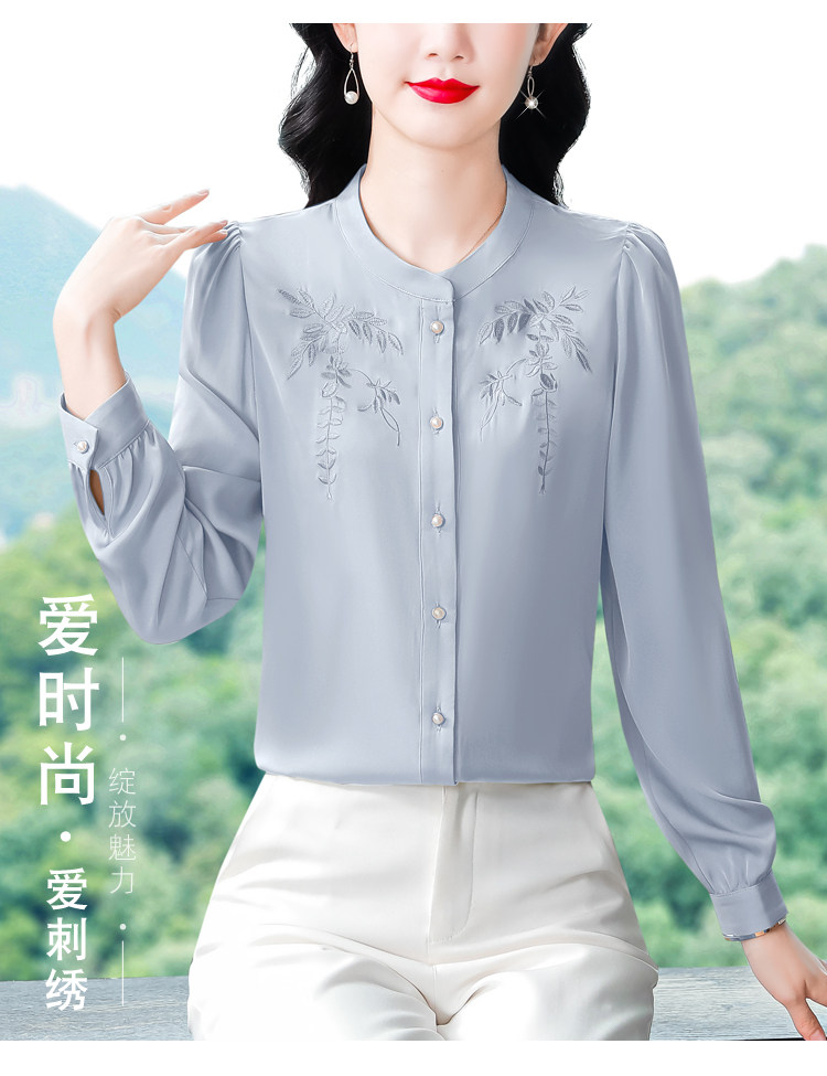 中国风真丝衬衫女妈妈装2025春秋刺绣立领杭州桑蚕丝缎面长袖上衣