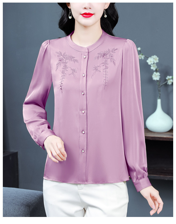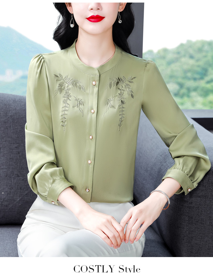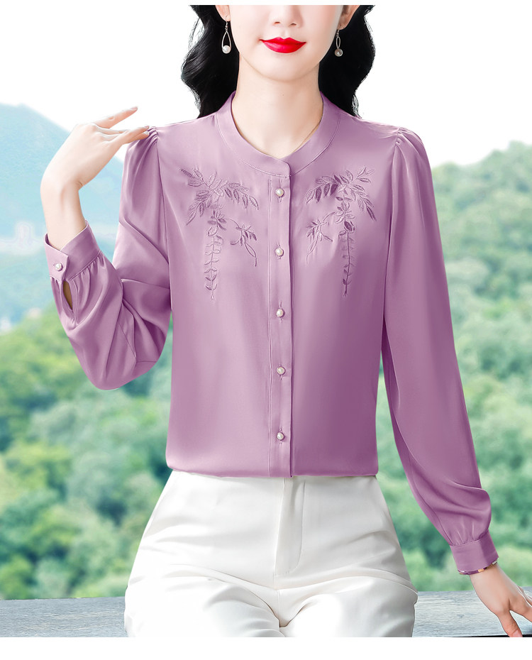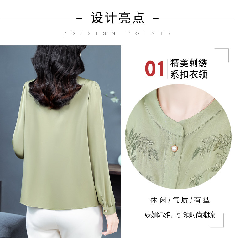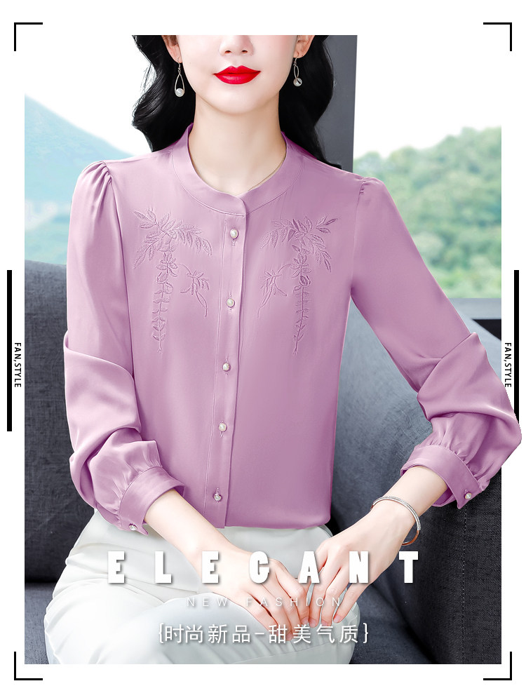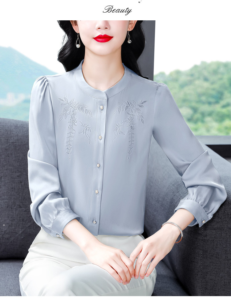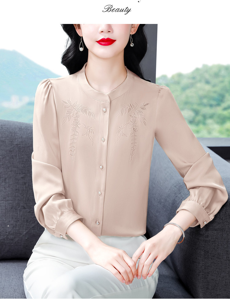 中国风真丝衬衫女妈妈装2025春秋刺绣立领杭州桑蚕丝缎面长袖上衣