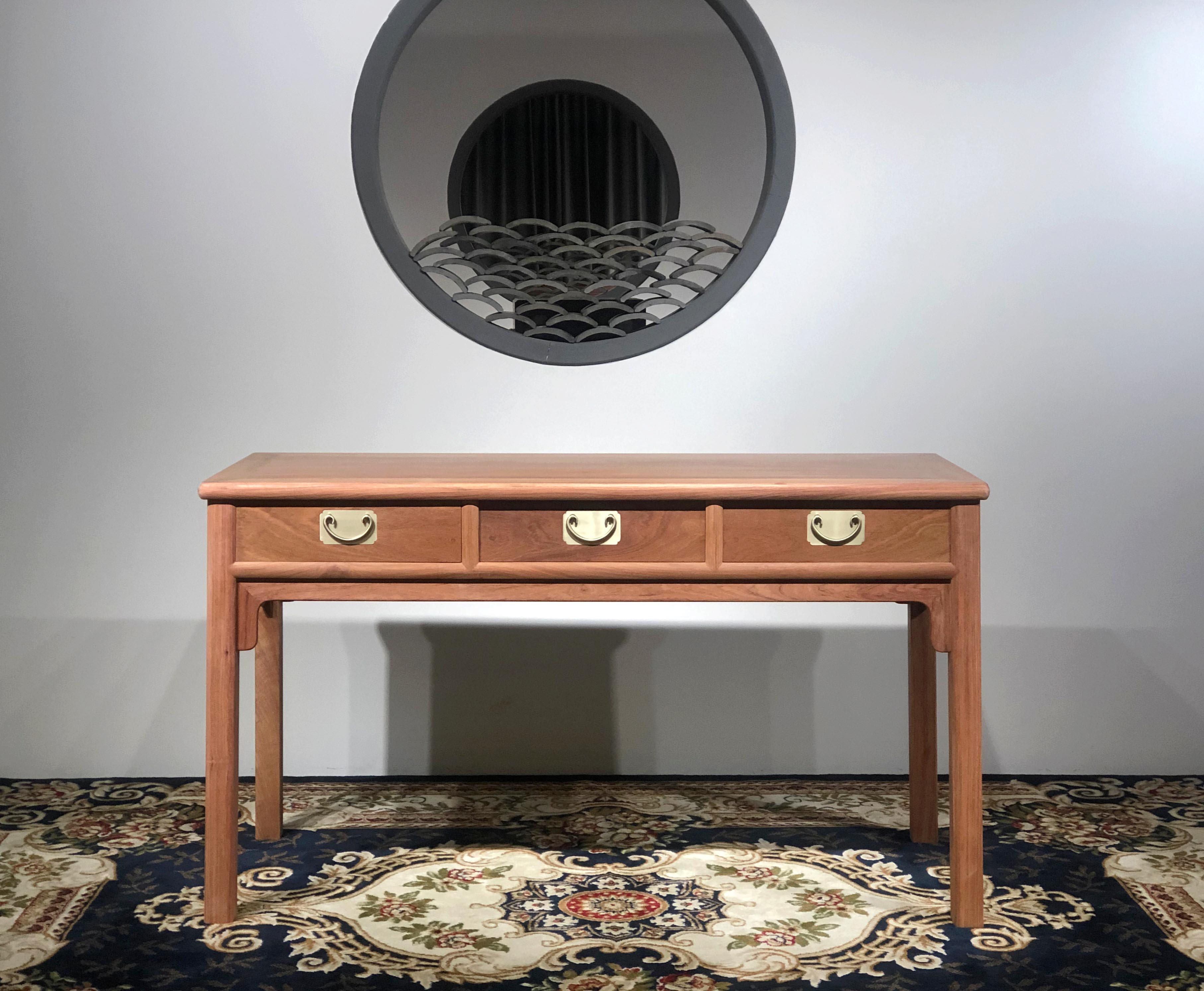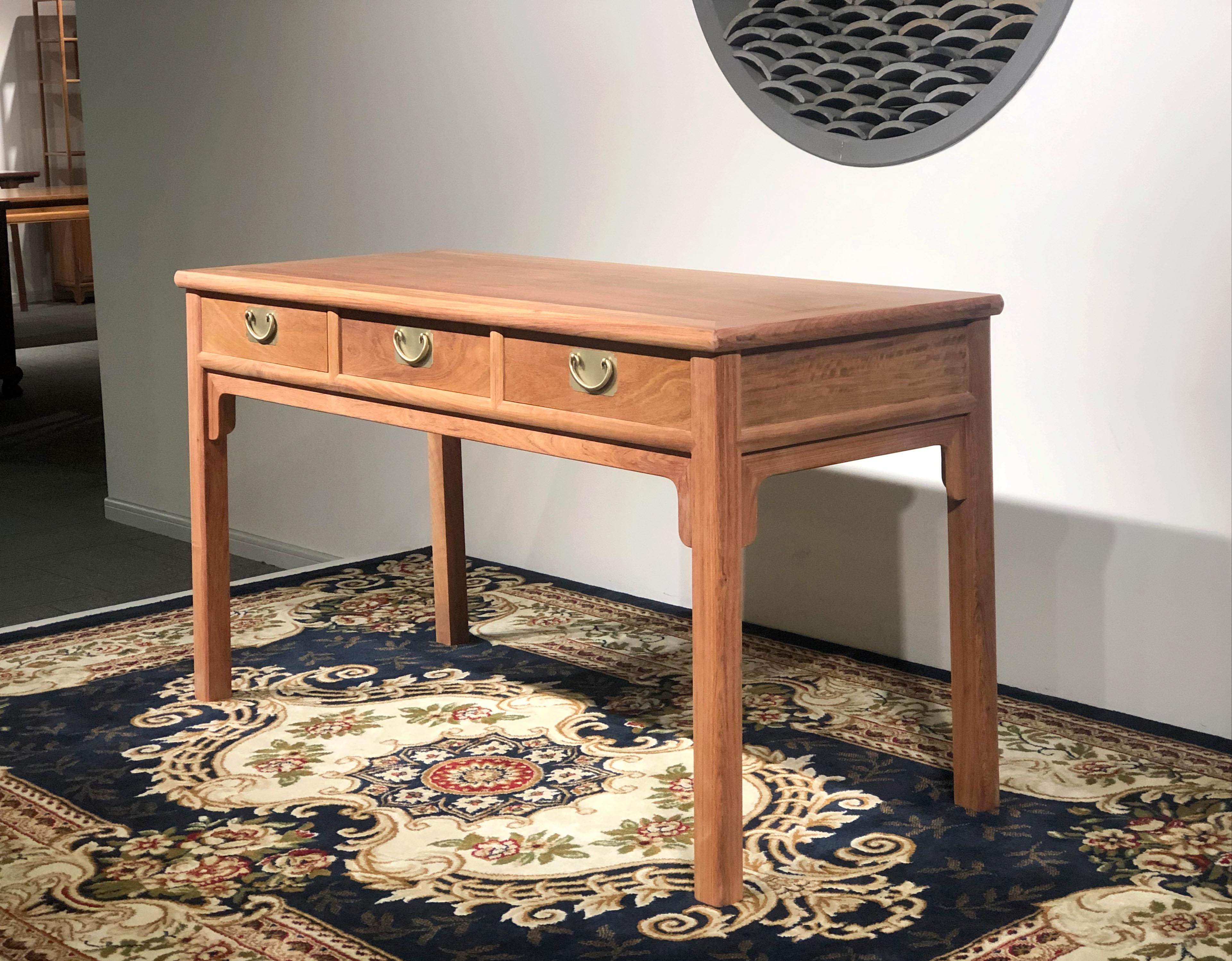 小课桌 原型来自《明式家具研究》P145三屉抽屉桌,桌子腿足外圆内方,边抹及横顺枨均用素混面压边线,枨子以下,四面施素牙条、素牙头,抽屉采用铜件拉手,这些造法和装置,使它具备浓郁的明代气息,和清中期以来所制的抽屉桌,大异其趣。
