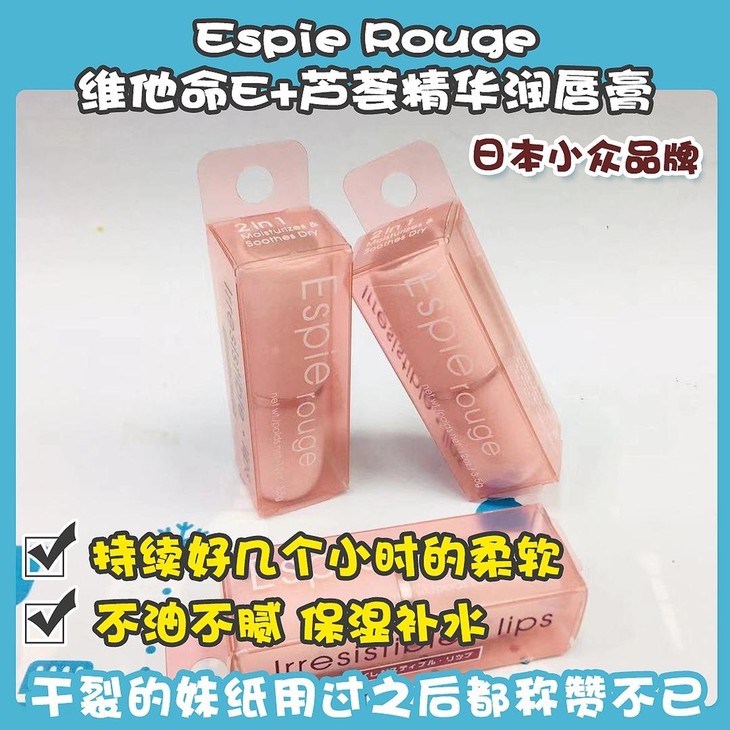 Espie Rouge维他命E+芦荟精华润唇膏👍这个牌子是日本🇯🇵一个小众的品牌,凭借自身过硬的质量和非常良心的价格💖,赢得大众的一致好评😊~嘴唇常年干裂的妹纸用过之后都称赞不已👏,蕴含VE和芦荟精华成分🌱,不油不腻,保湿补水💦,淡化唇纹。完全可以作为日常早晚唇部护理和口红打底前使用💄,睡前也能涂哦🎇,水润不粘腻,🍃清爽的使用感也很适合夏天用,持续好几个小时的柔软,随时随地么么哒💋