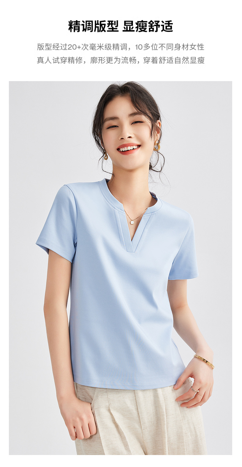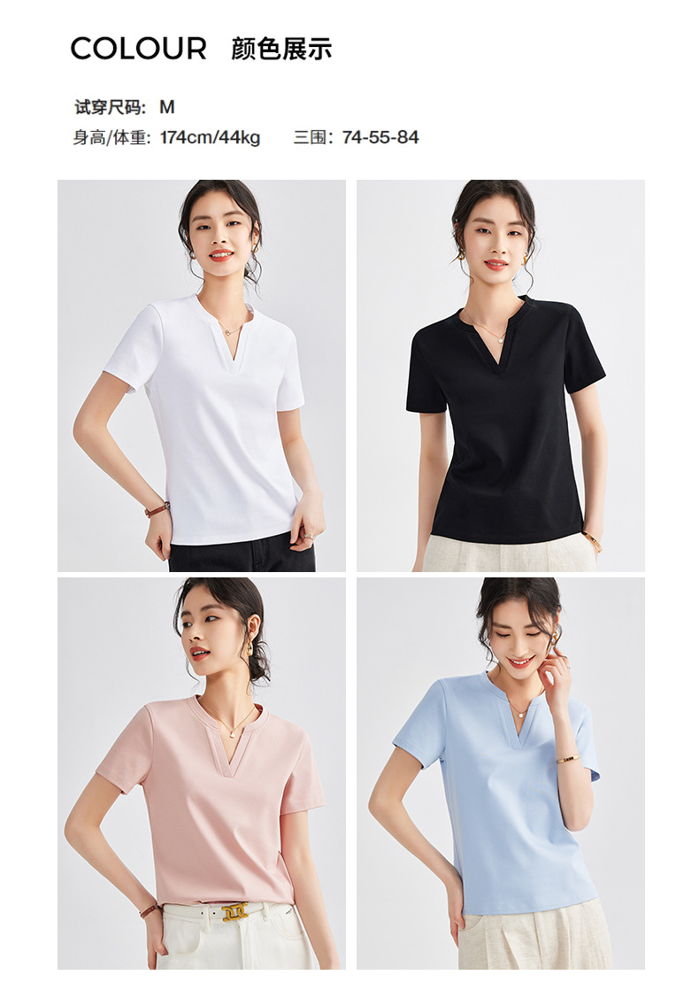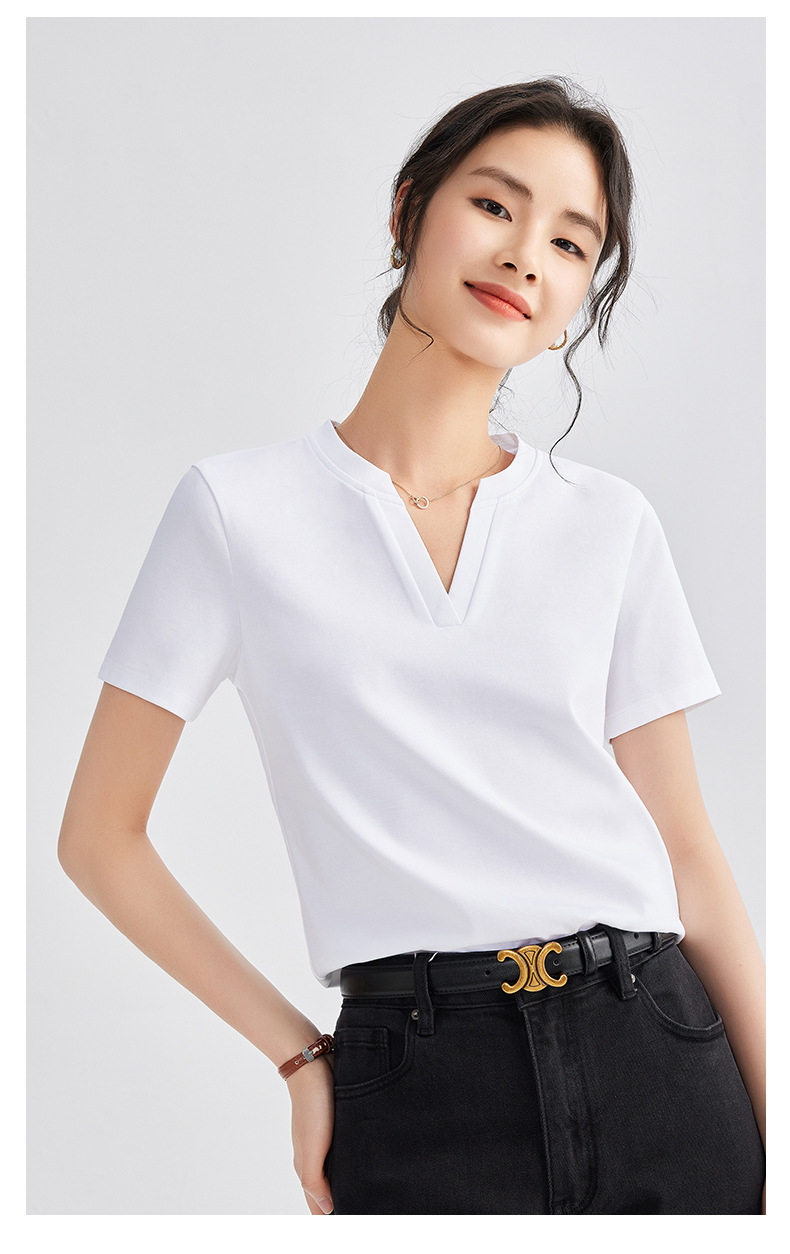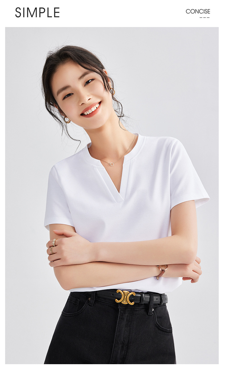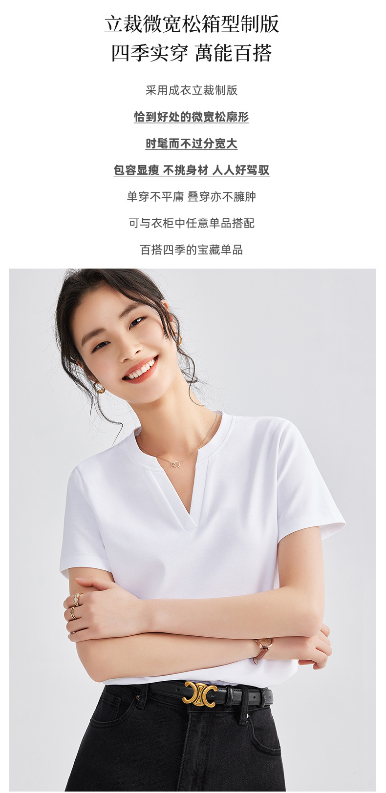 丁摩 80s双面丝光棉T设计感短袖T恤女夏季正肩合身V领纯色上衣挺括体恤5ZF- M674