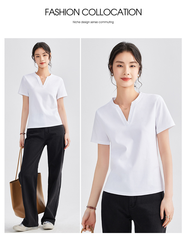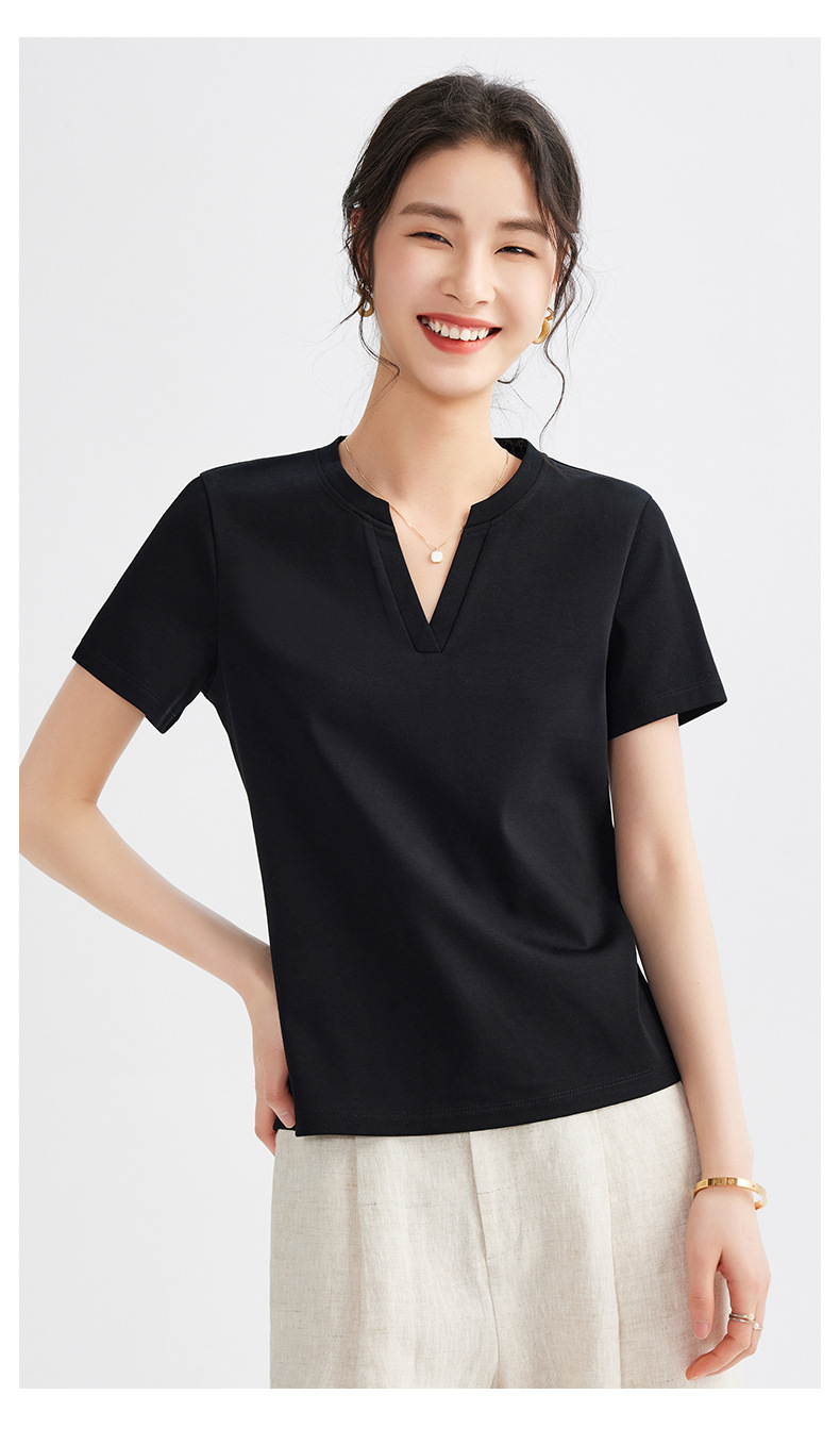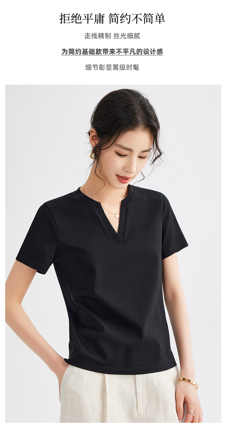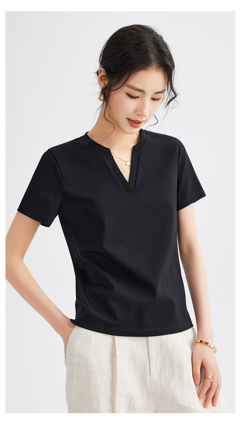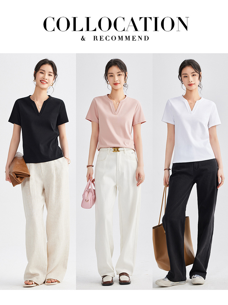丁摩 80s双面丝光棉T设计感短袖T恤女夏季正肩合身V领纯色上衣挺括体恤5ZF- M674
