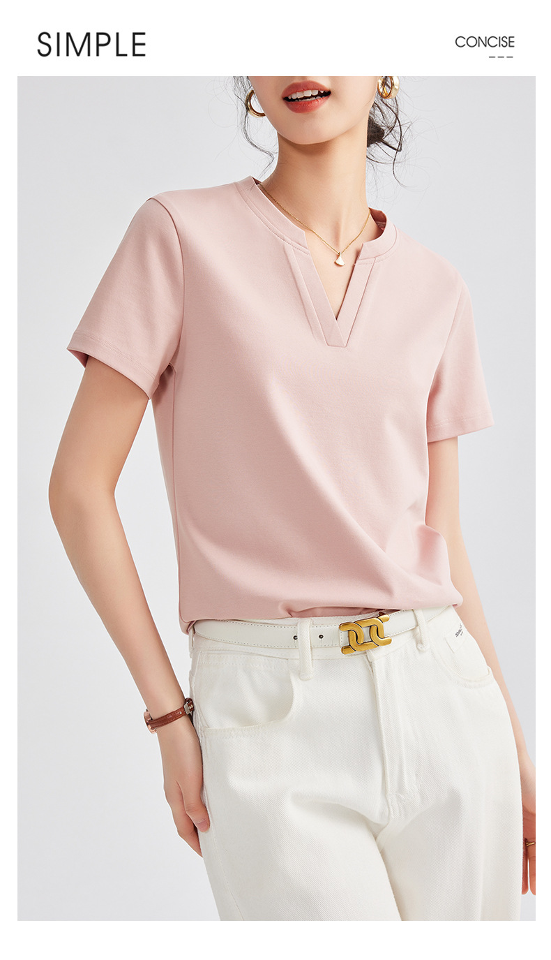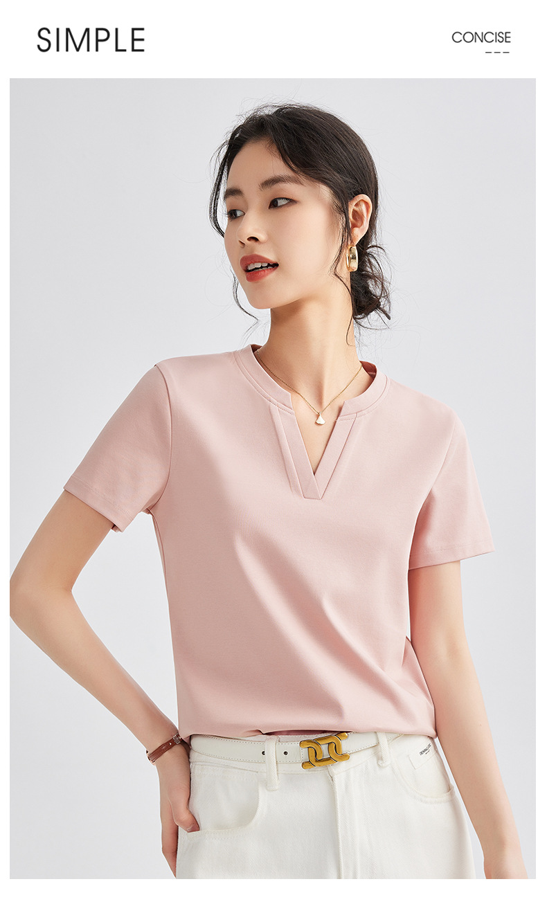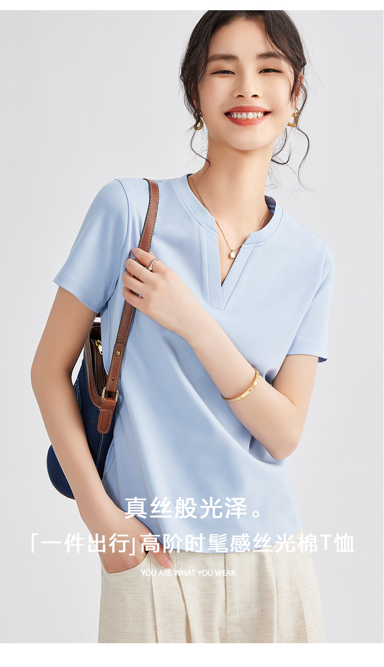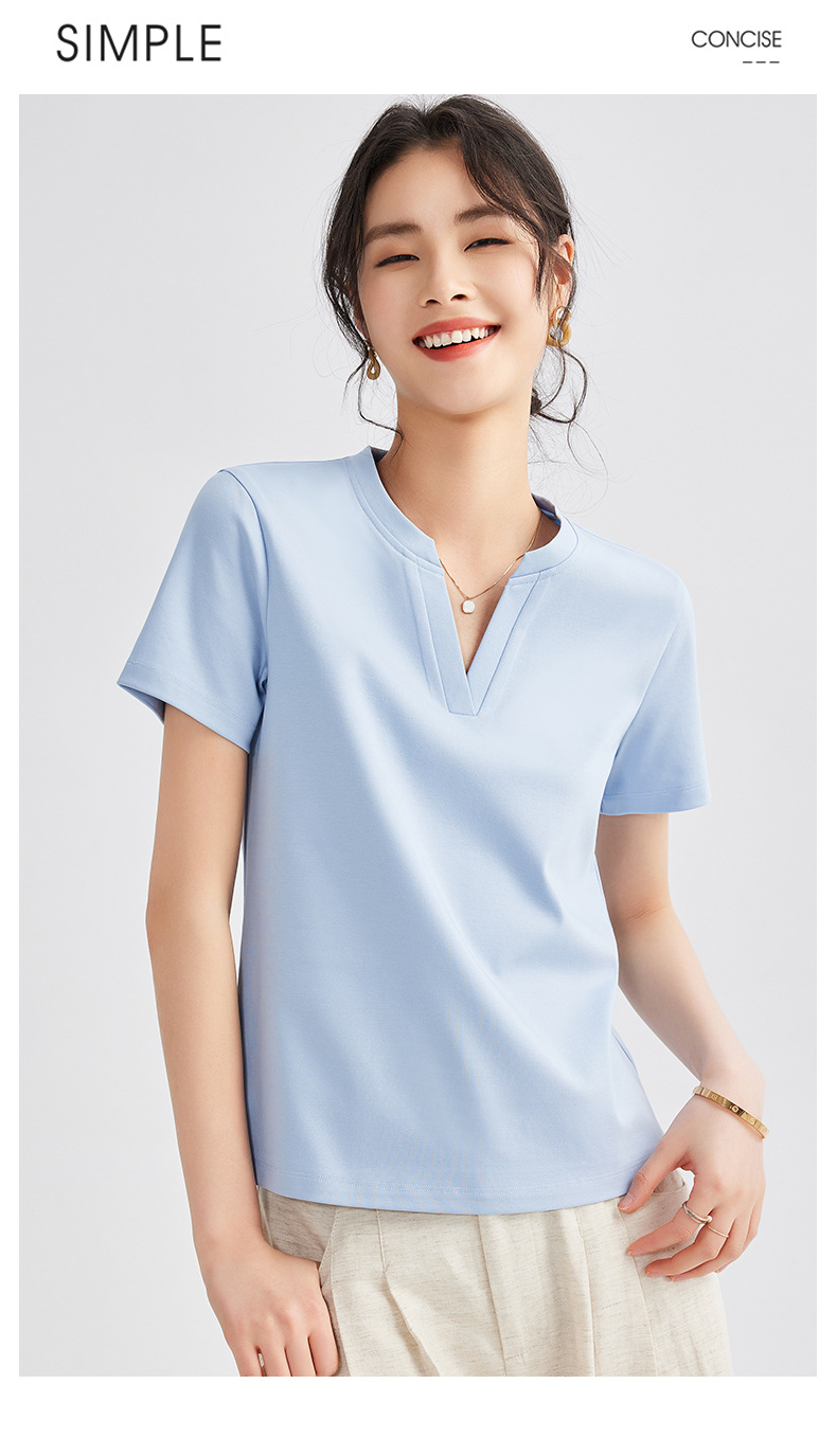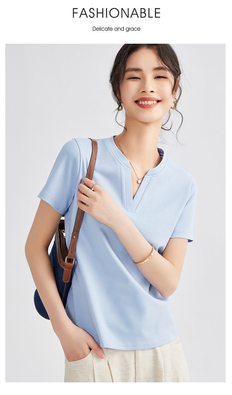 丁摩 80s双面丝光棉T设计感短袖T恤女夏季正肩合身V领纯色上衣挺括体恤5ZF- M674