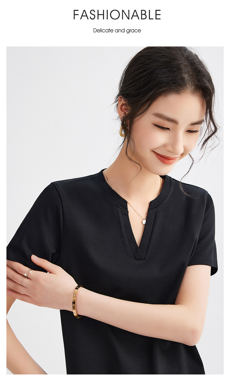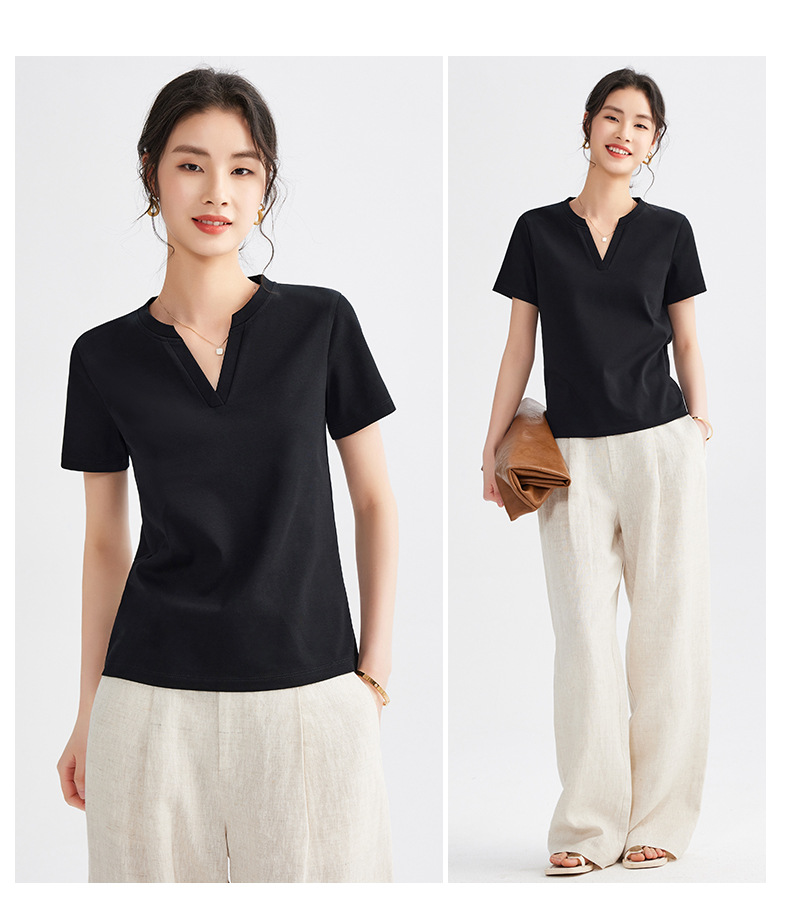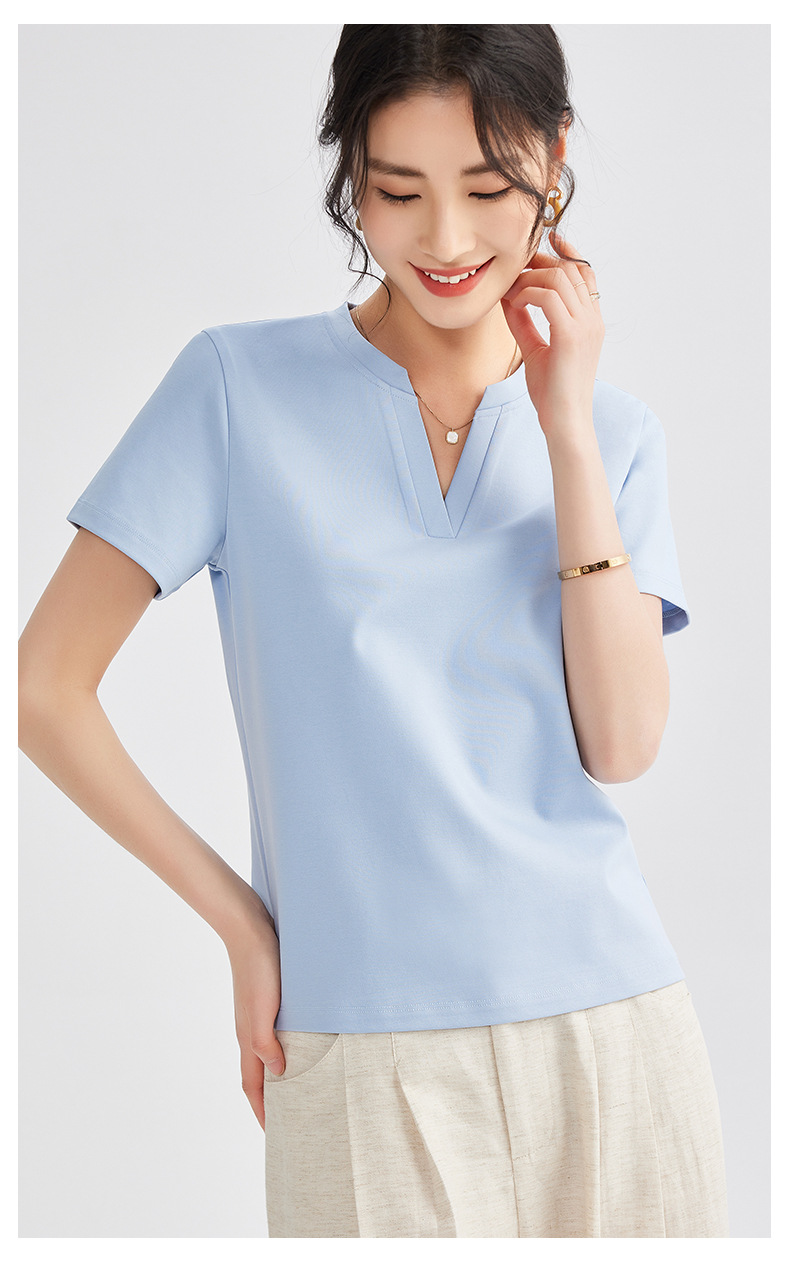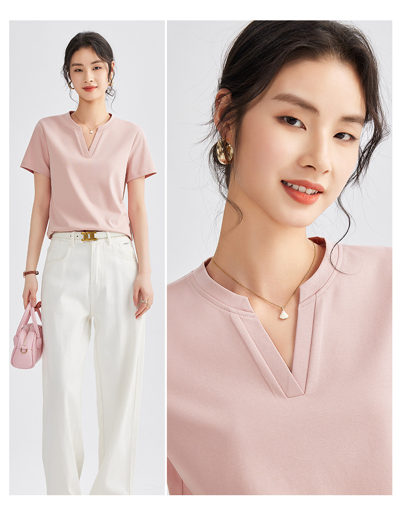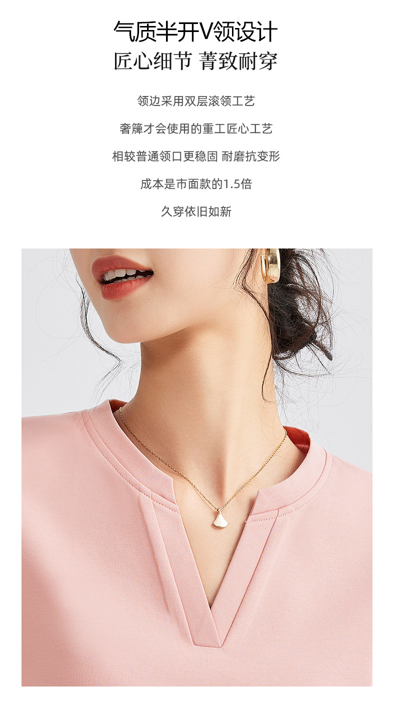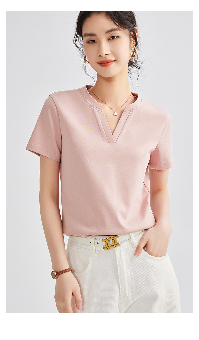 丁摩 80s双面丝光棉T设计感短袖T恤女夏季正肩合身V领纯色上衣挺括体恤5ZF- M674