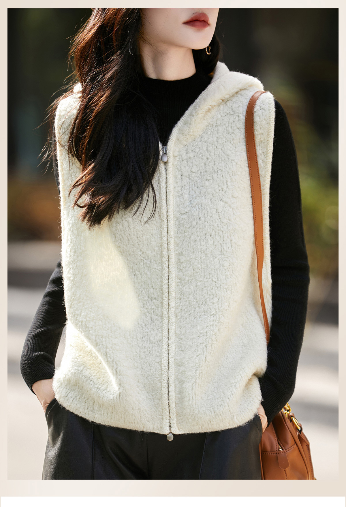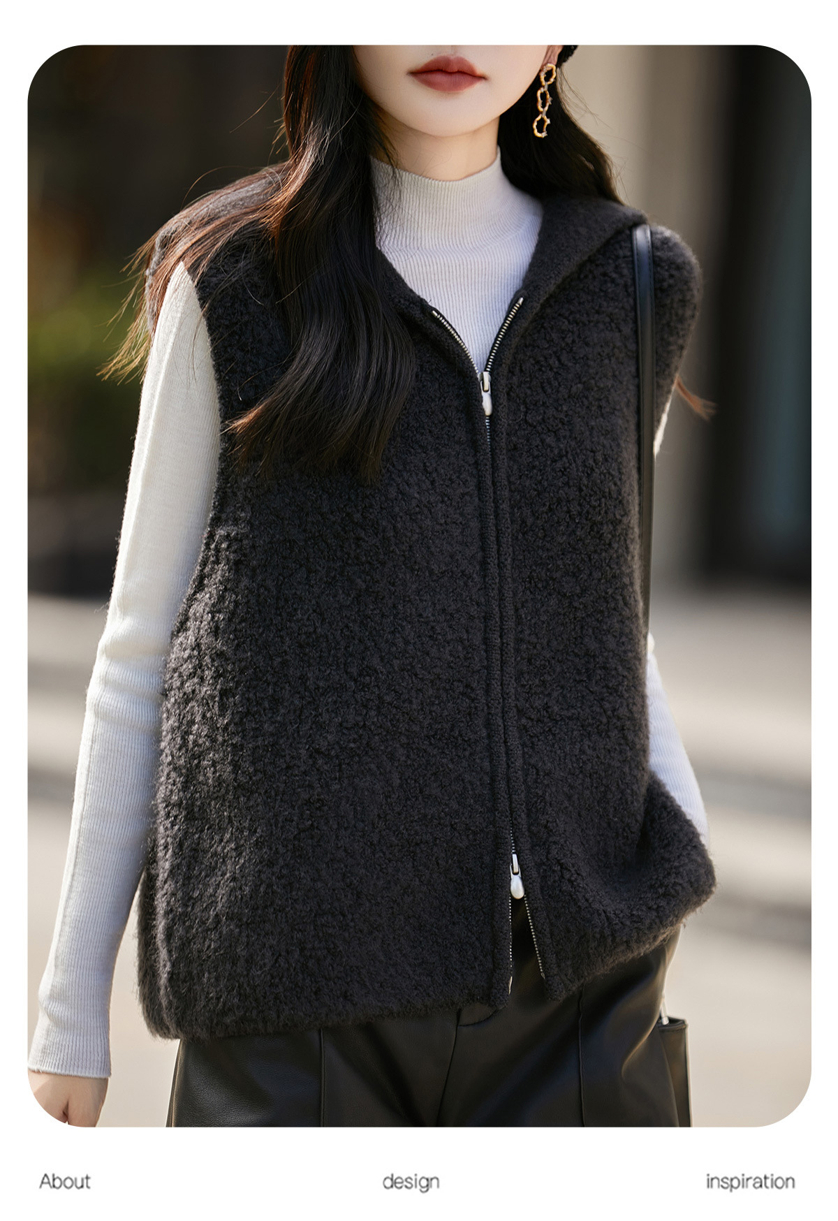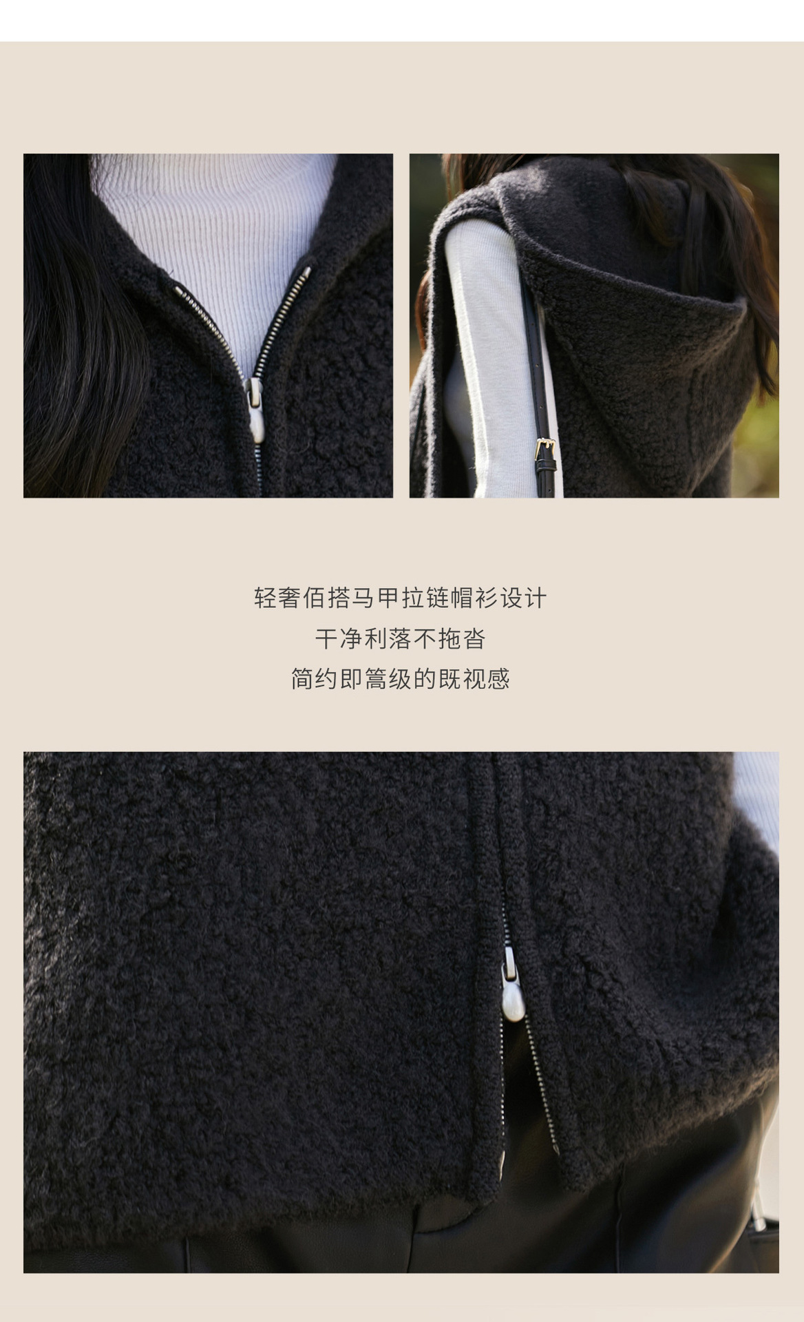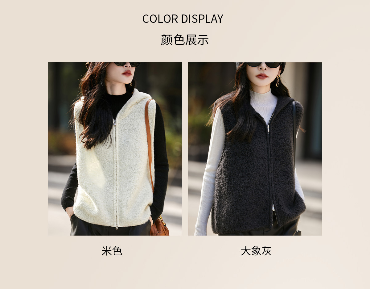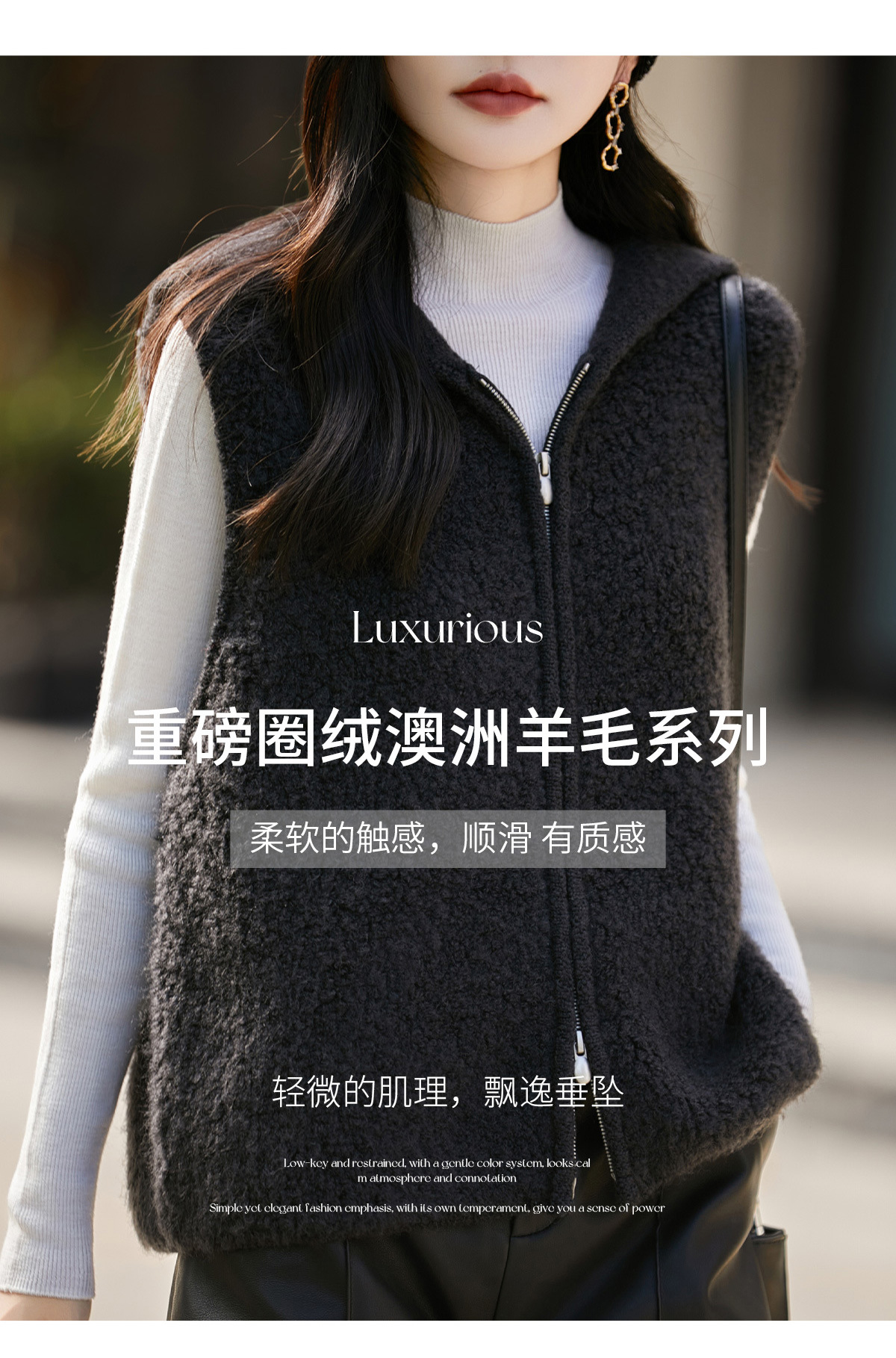 丁摩 100%纯羊毛马甲女外搭拉链连帽背心 PY-5158