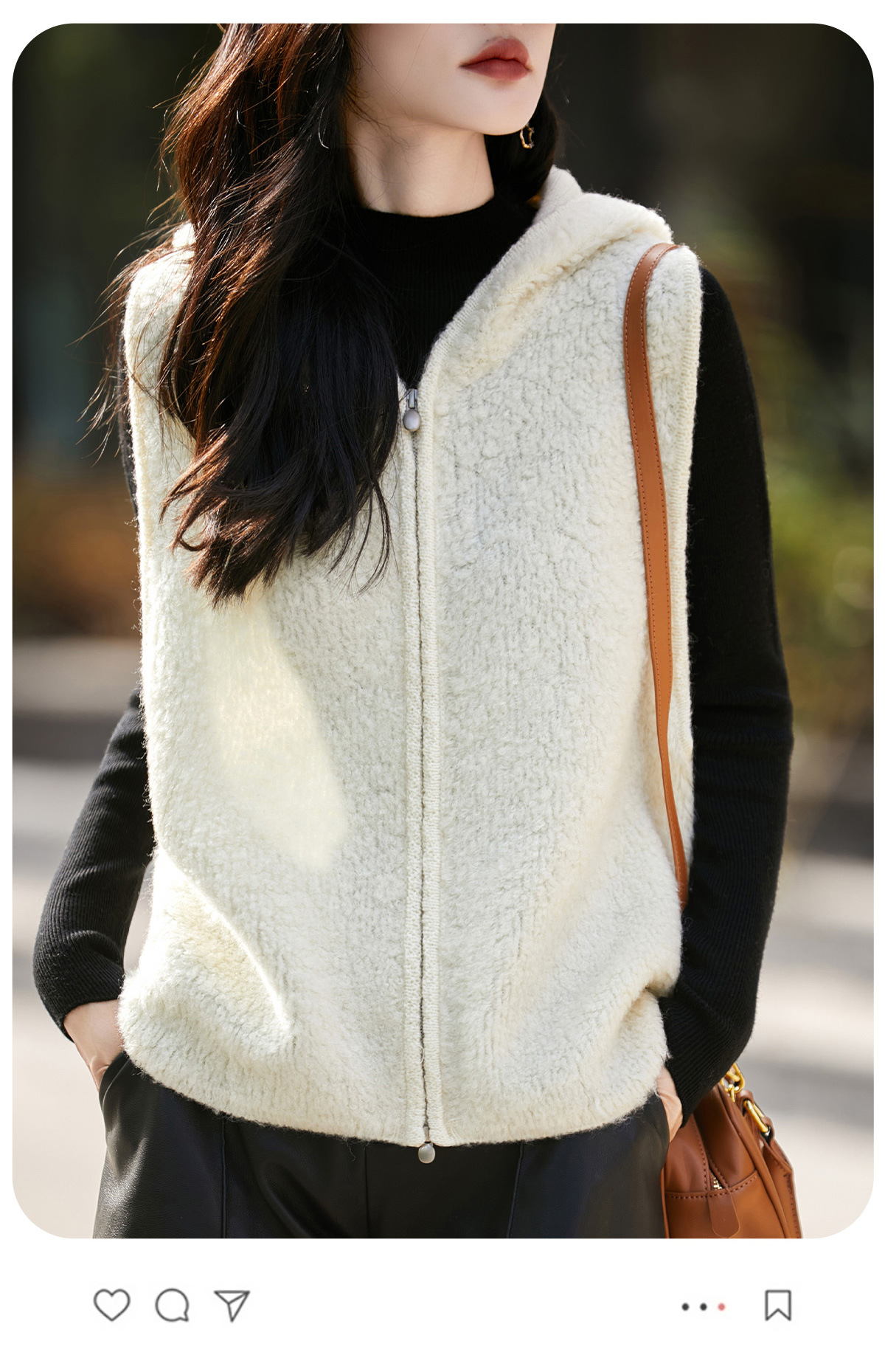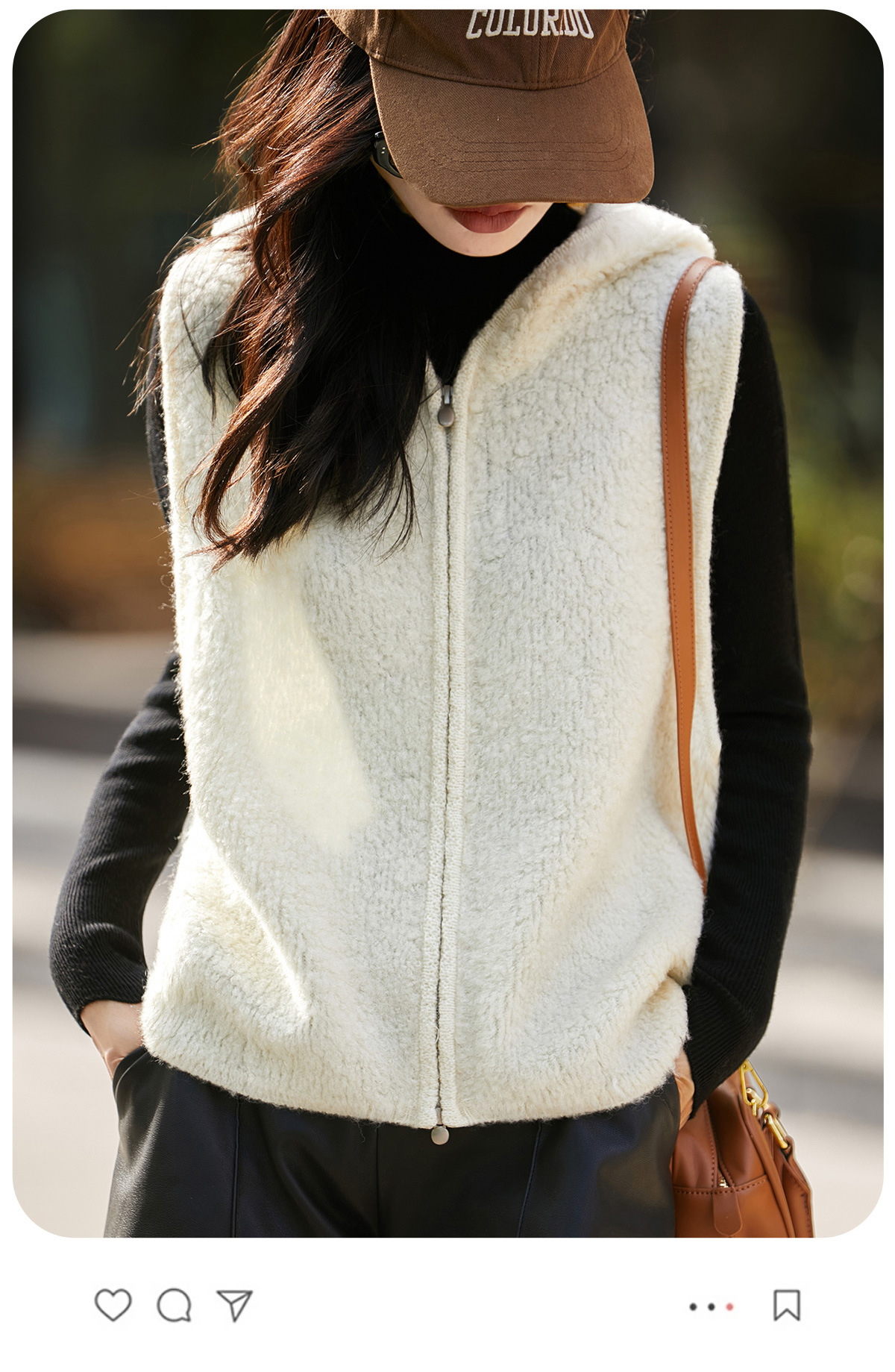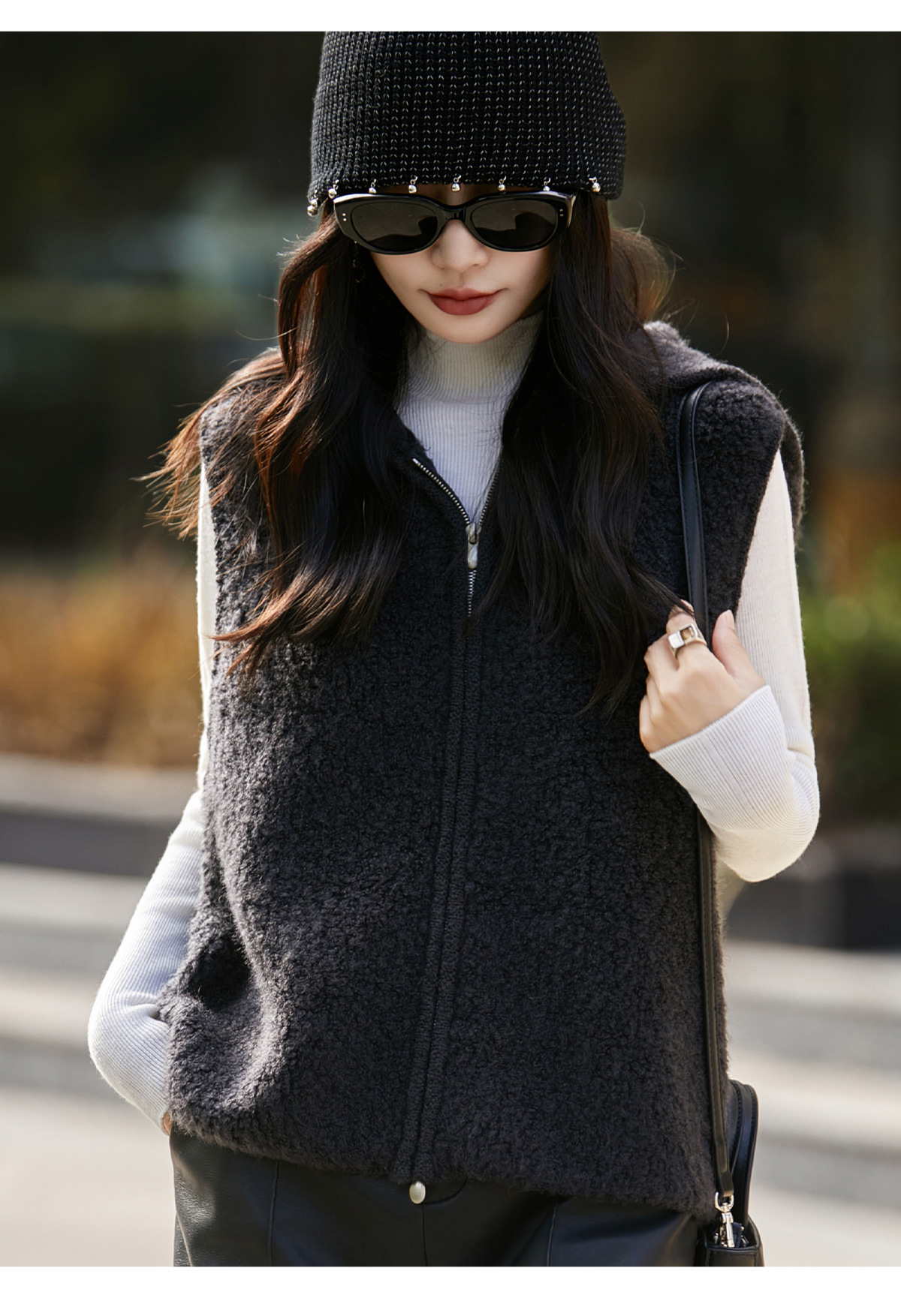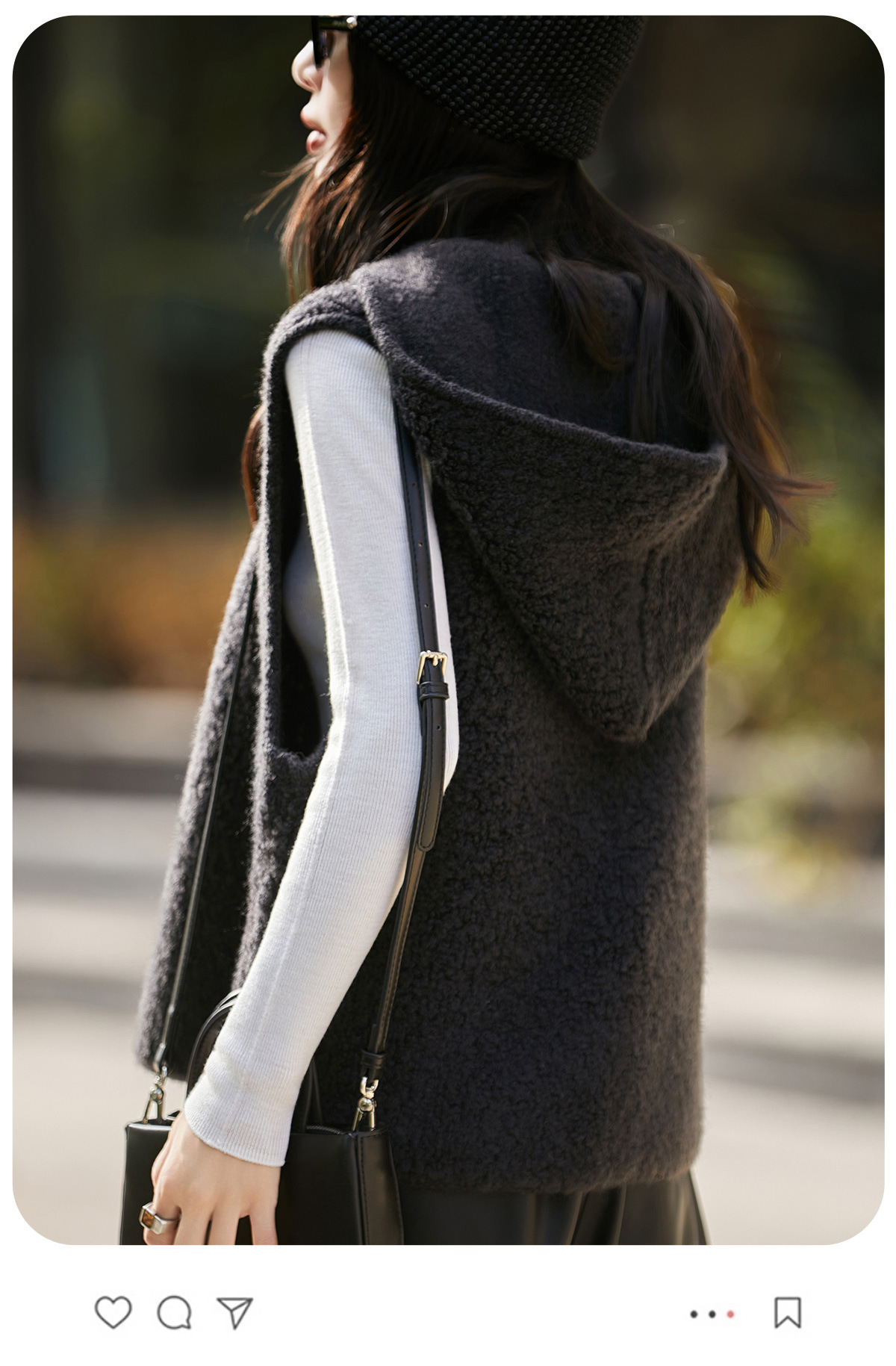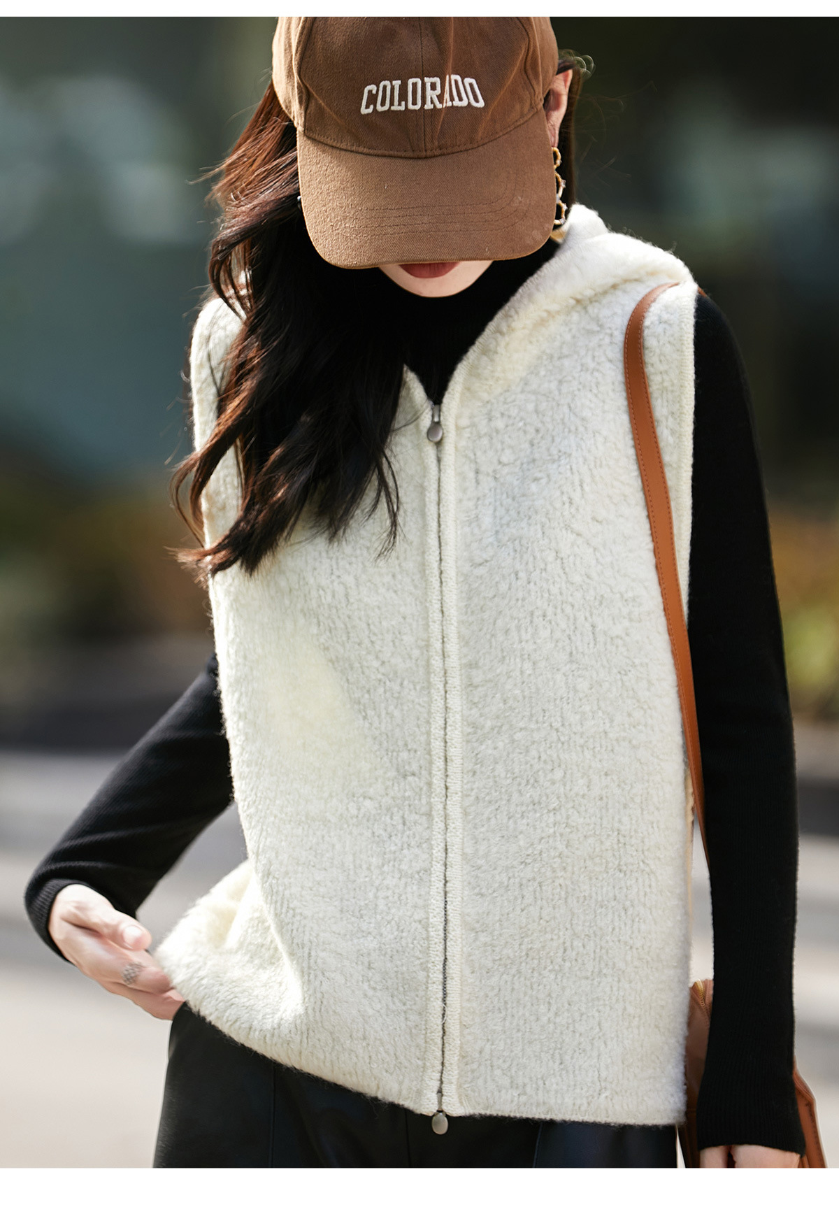 丁摩 100%纯羊毛马甲女外搭拉链连帽背心 PY-5158