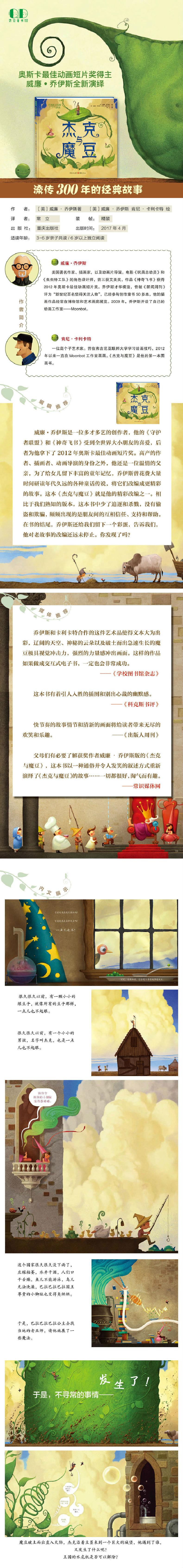 威廉·乔伊斯是一位多才多艺的创作者,他的《守护者联盟》和《神奇飞书》受到全世界大小朋友的喜爱。高产的作者、插画者、动画导演的身份之外,他还是一位温情的父亲,为了给女儿留下丰富的童年记忆,乔伊斯曾花费大量时间研读年代久远的各种童话传说,将它们改编成更精彩的故事。这本《杰克与魔豆》就是他的精彩改编之一。相比于我们熟知的版本,这本书中少了追逐和杀戮,没有偷盗和欺骗,频频出现的是朋友间的互相信任、支持和帮助。