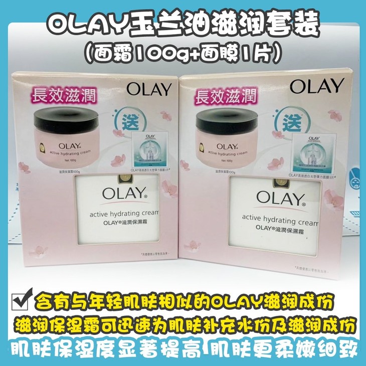 OLAY玉兰油滋润套裝(面霜100g+面膜1片) 👍滋润保湿霜可迅速为肌肤补充水份及滋润成份💦,完全不油腻哒☺。含有与年轻肌肤相似的OLAY滋润成份💧,能立即被肌肤吸收👏,可紧致柔嫩肌肤⬆,使肌肤更光滑✨,让你看起来更年轻呀👯。使用后真的会发现👀,肌肤保湿度显著提高, 肌肤更柔嫩细致☁,更加有光泽。还有附有一片面膜哦,好值呀!