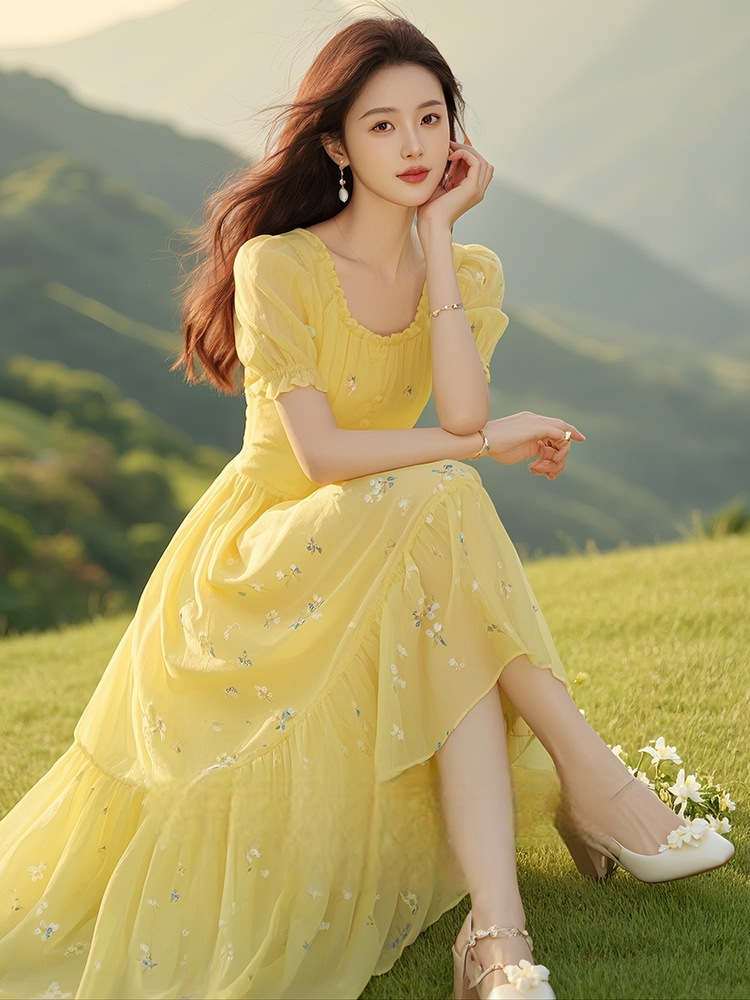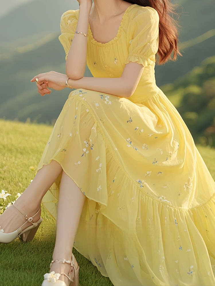 xln3109桔梗法式黄色碎花连衣裙女2025夏季新款森系温柔风减龄雪纺裙子