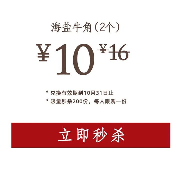 【6折秒杀】海盐牛角2个 门店兑换券 · 线下门店通用 · 10月31日开始兑换