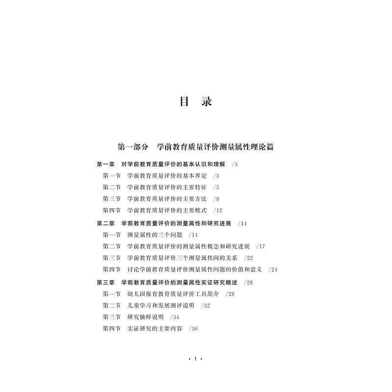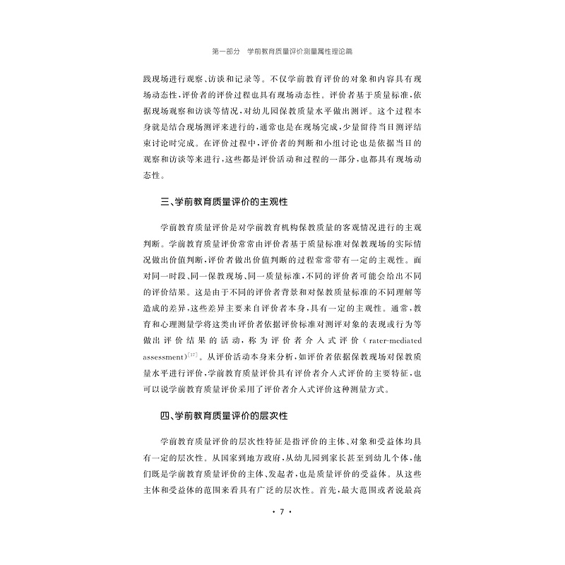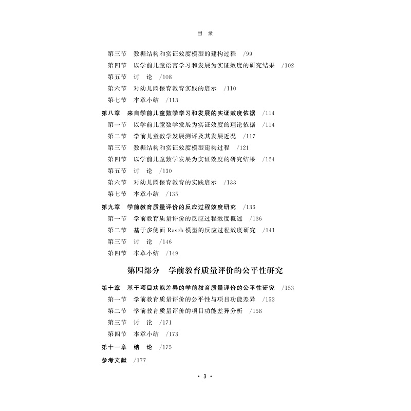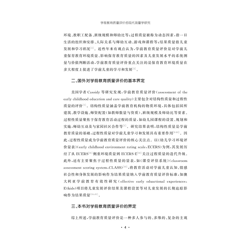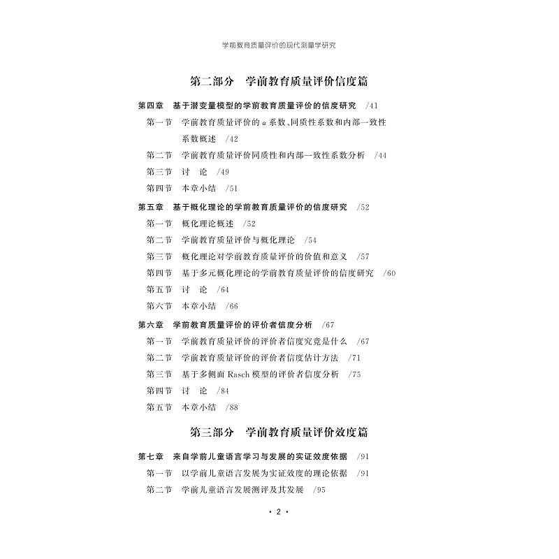 本书稿以《走向优质--中国幼儿园教育质量评价标准》(以下简称《优质标准》)在全国抽样测评数据为例,讨论学前教育质量评价的三个测量属性即信度、效度和公平性。首先,基于现代信度估计方法,包括基于潜变量的同质性和内部一致性系数估计方法、概化理论方法和项目反应理论模型等,估计学前教育质量评价的内容信度和评价者信度,并据此提出最优评价方案。其次,采用现代教育、心理统计方法,如多水平线性模型和多水平中介效应模型等,讨论学前教育质量评价的实证效度,并运用项目反应理论模型分析学前教育质量评价的过程性效度。最后,基于倾向匹配法估计项目功能差异,据此探索学前教育质量评价的公平性。