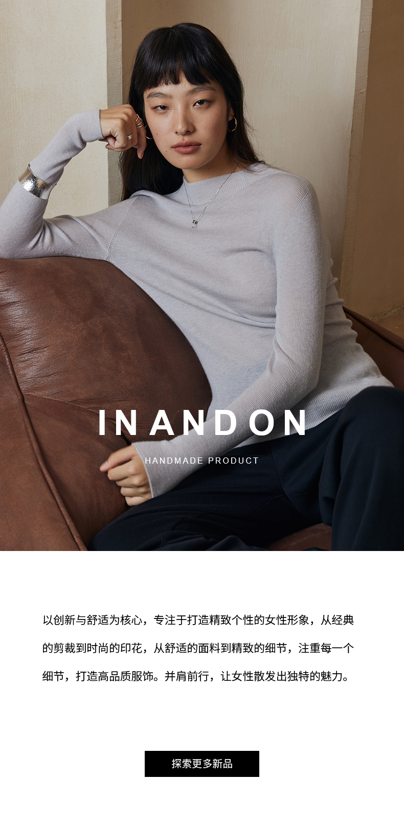 - IN AND ON—轻奢时尚品牌,以“致力于做你衣柜永远不肯丢掉的那一件”作为品牌理念,打造“轻奢时尚”的品牌定位。拥有时尚前沿的商品设计能力并将品质与价值进行完美平衡,致力为消费者提供舒适与奢华、创新与智能的完美购物体验。塑造独立自主的女性形象,让每个人都能拥有属于自己的时尚风格。