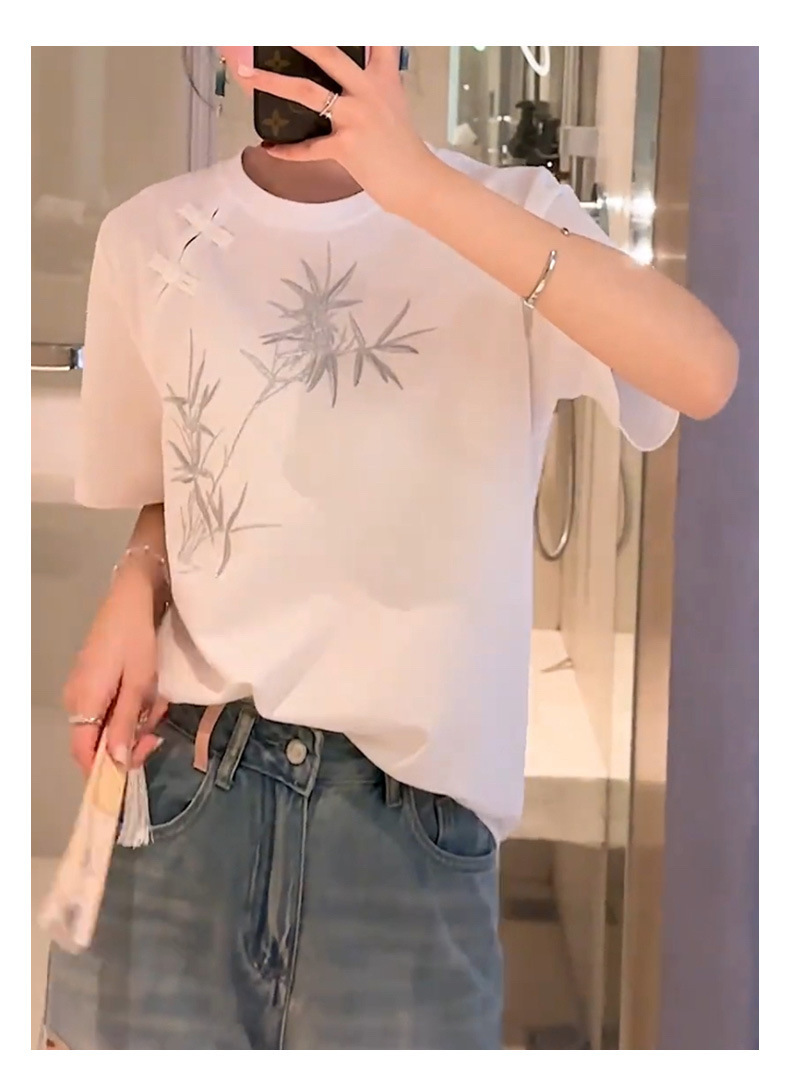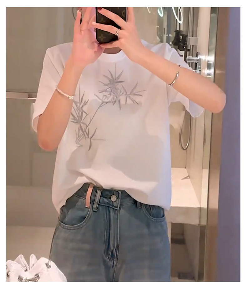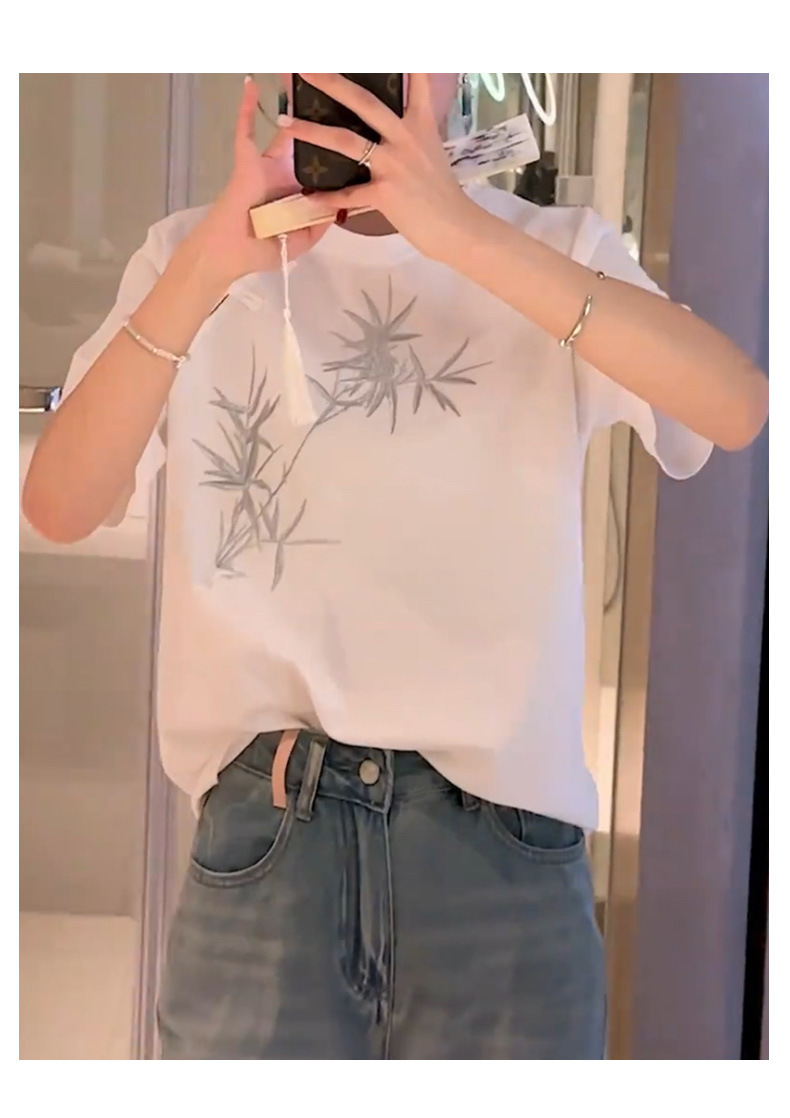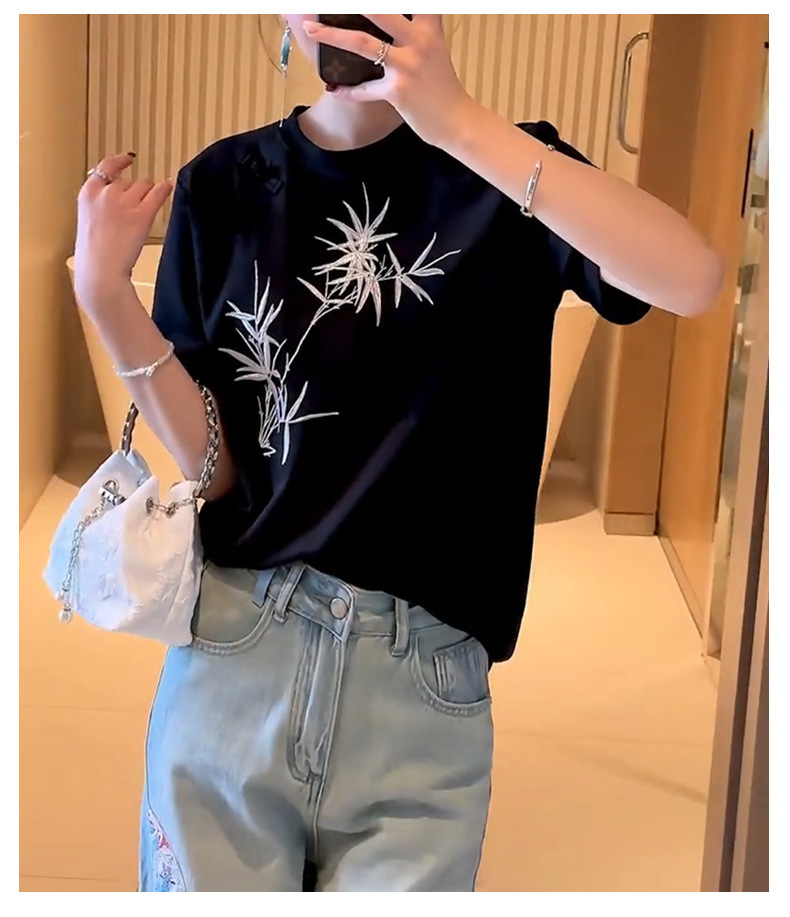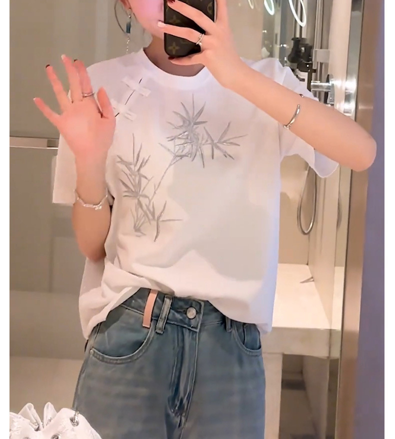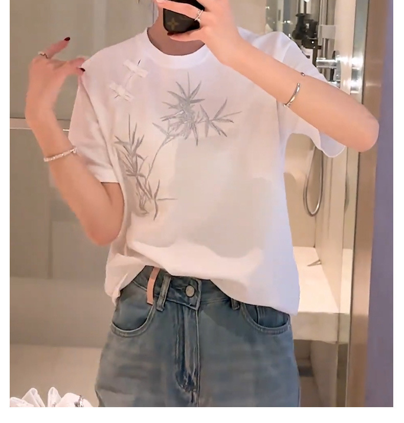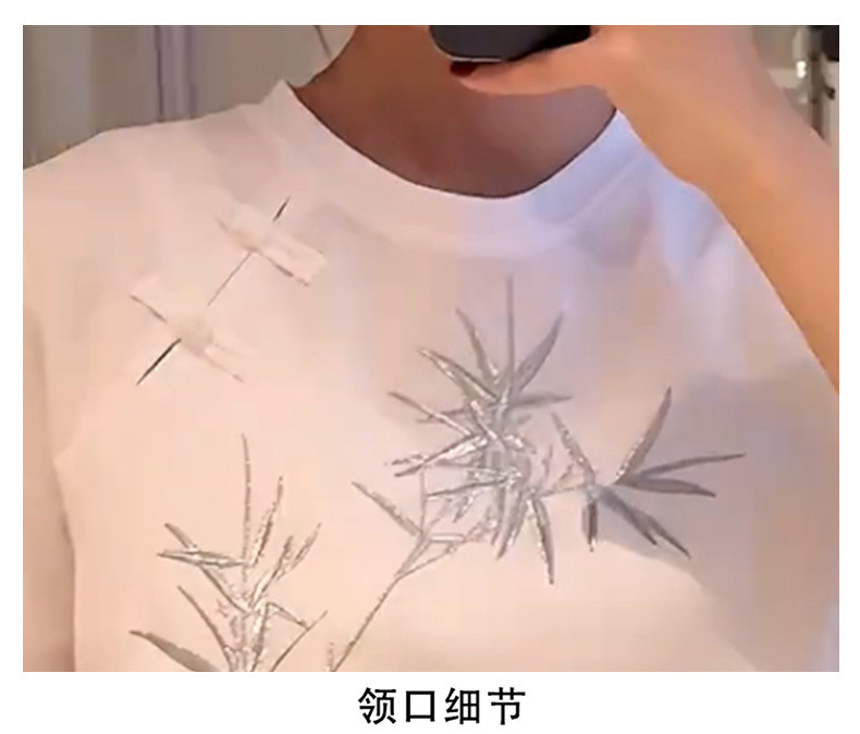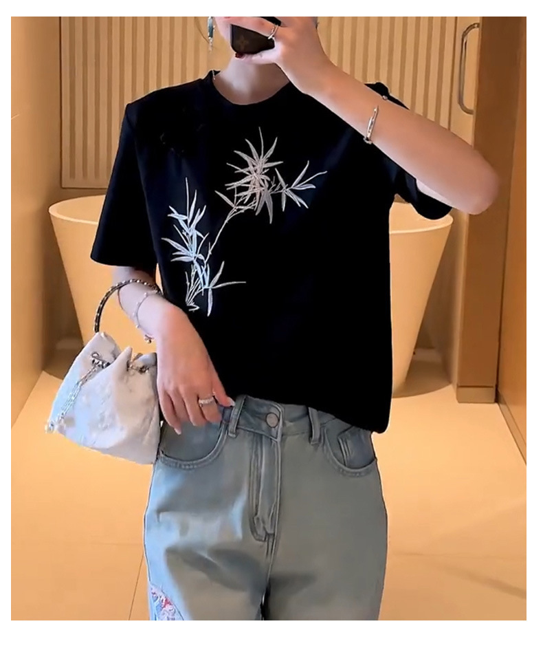 雀说国风刺绣T恤女圆领高级感漂亮上衣女韩版通勤宽松AL4052