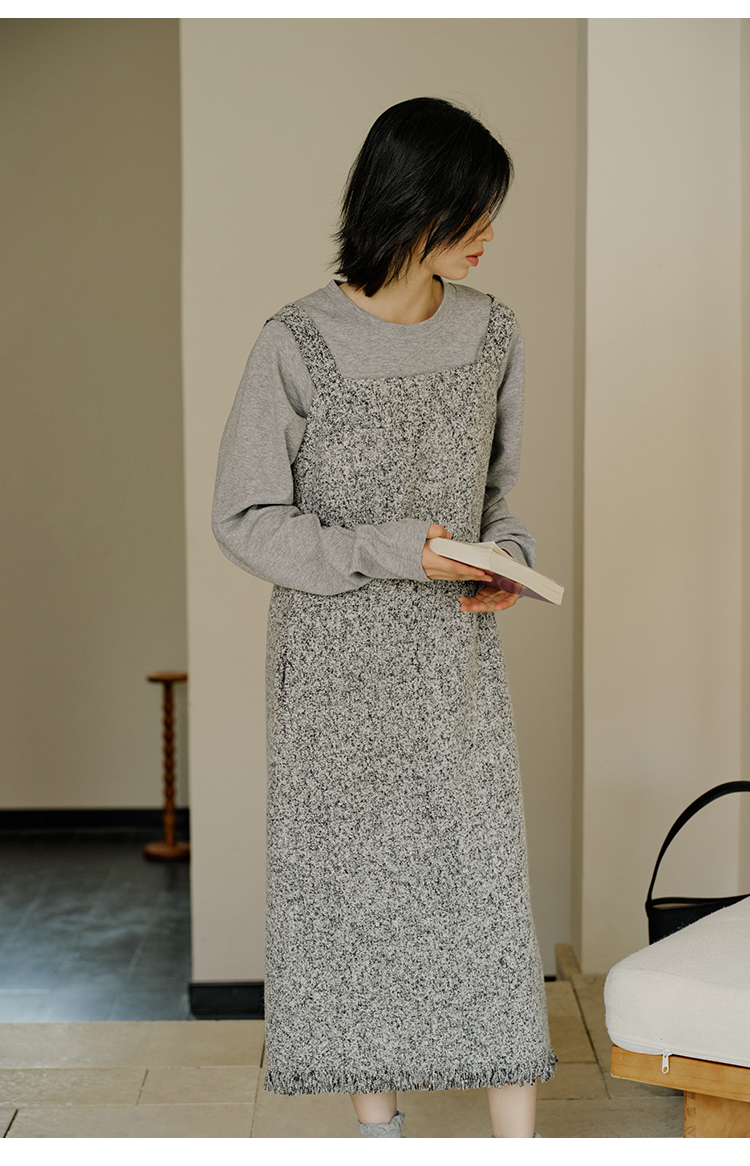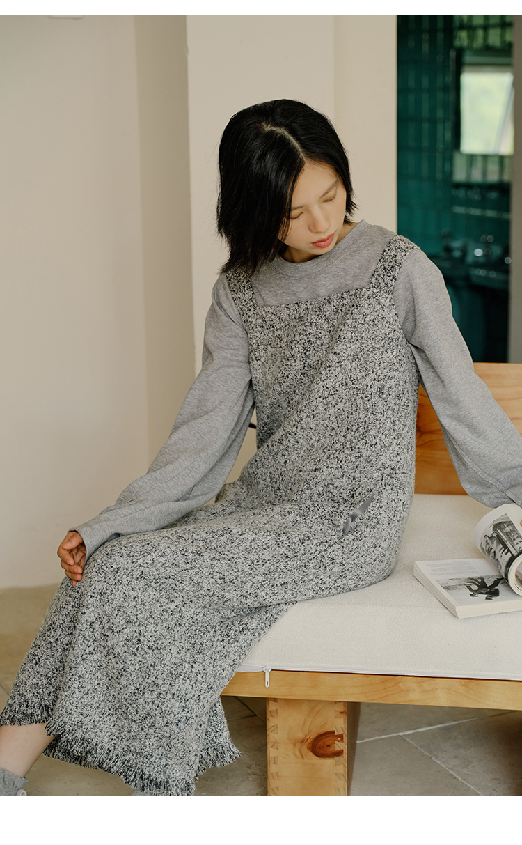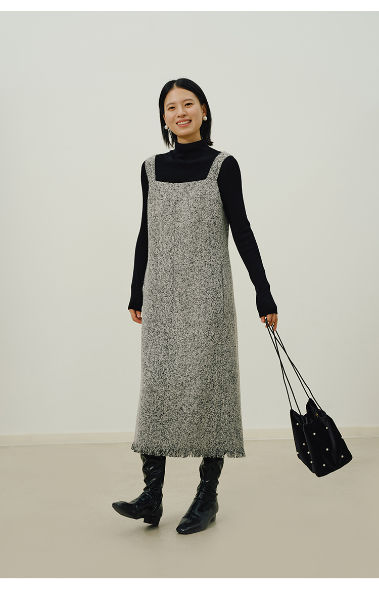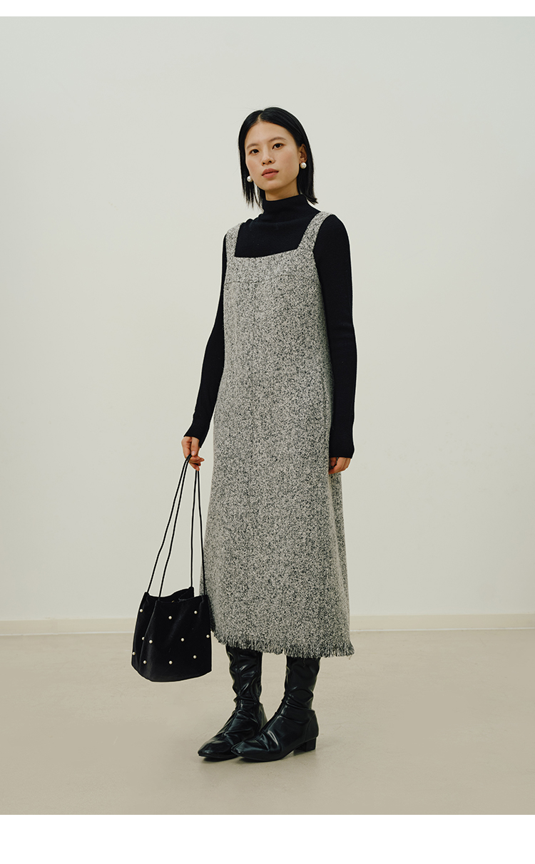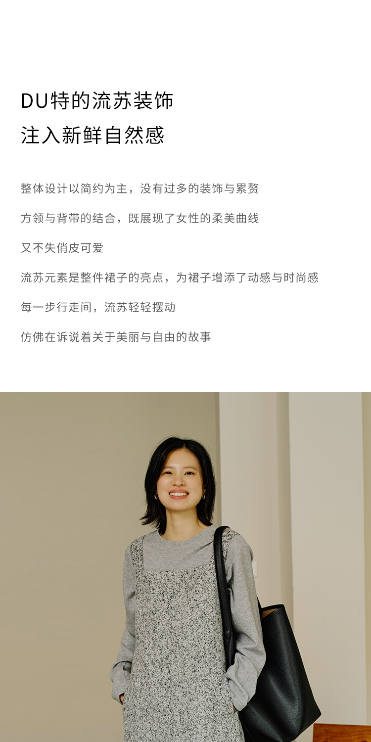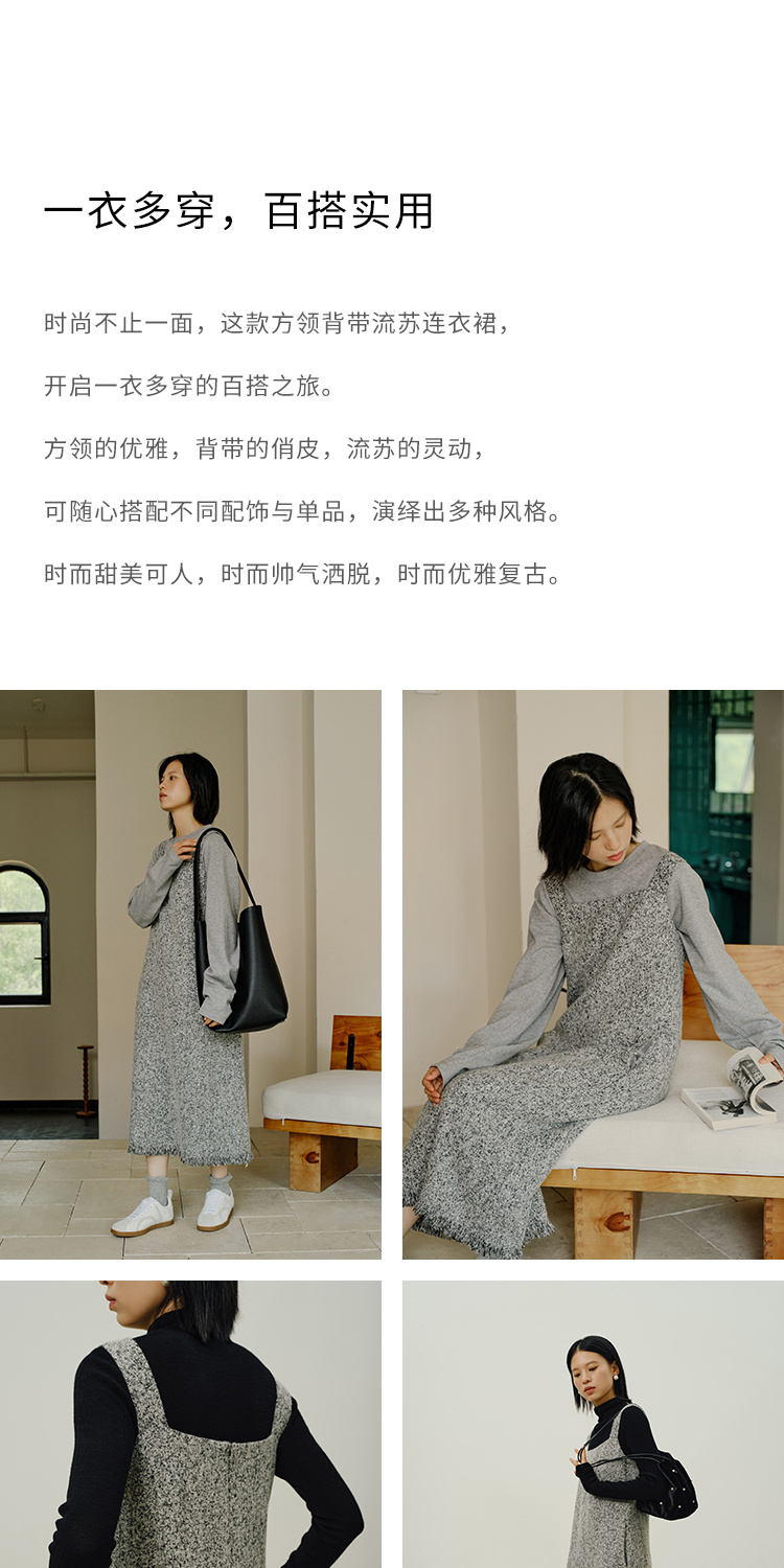 HeyDress法式流苏连衣裙女秋季收腰显瘦设计感直筒毛呢背带裙子