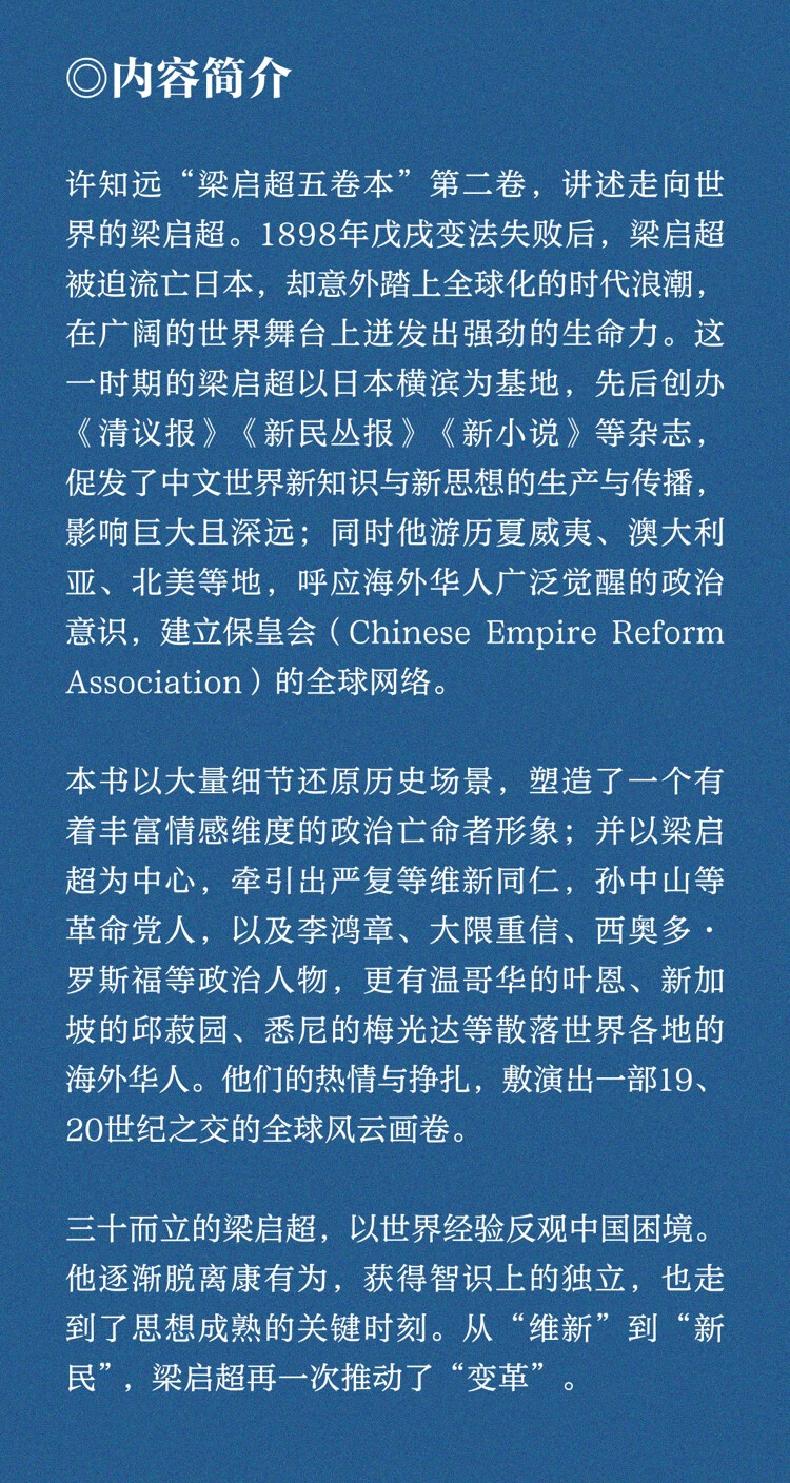 许知远“梁启超五卷本”第二卷,讲述走向世界的梁启超。1898年戊戌变法失败后,梁启超被迫流亡日本,却意外踏上全球化的时代浪潮,在广阔的世界舞台上迸发出强劲的生命力。这一时期的梁启超以日本横滨为基地,先后创办《清议报》《新民丛报》《新小说》等杂志,促发了中文世界新知识与新思想的生产与传播,影响巨大且深远;同时他游历夏威夷、澳大利亚、北美等地,呼应海外华人广泛觉醒的政治意识,建立保皇会(Chinese Empire Reform Association)的全球网络。