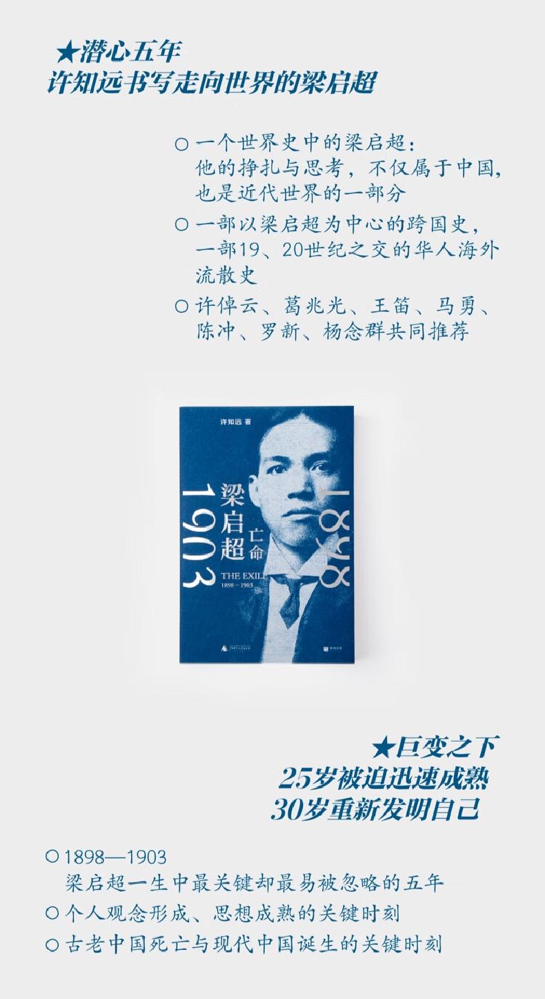 1898—1903年是梁启超走向独立成熟的关键时刻。他逐渐摆脱康有为的阴影,也从孙中山的吸引中清醒过来,走向了对中国前途的独立思考。他不再打算倚靠朝廷“维新”,也不愿投身激烈的“革命”,而将热情倾注于启发民智的“新民”。期间种种冒险、挣扎、奇思异想与谬误,皆标志着一个新时代的到来。