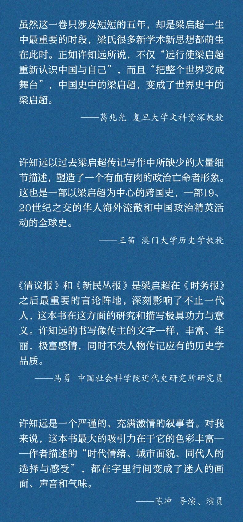 梁启超的广阔交游,串联起国内的维新同仁和江湖会党,日本的亚洲主义者和中国留学生,以及孙中山的革命力量;他的世界旅行,联结起散落各地的华人,织成一张人、金钱、信息的世界网络。透过梁启超,可以看到一个更广大的世界,和一个更广大的中国。