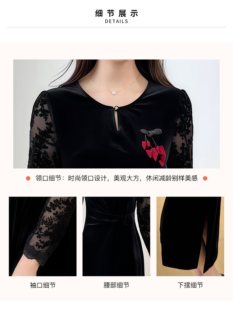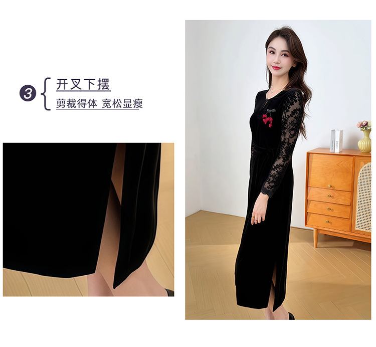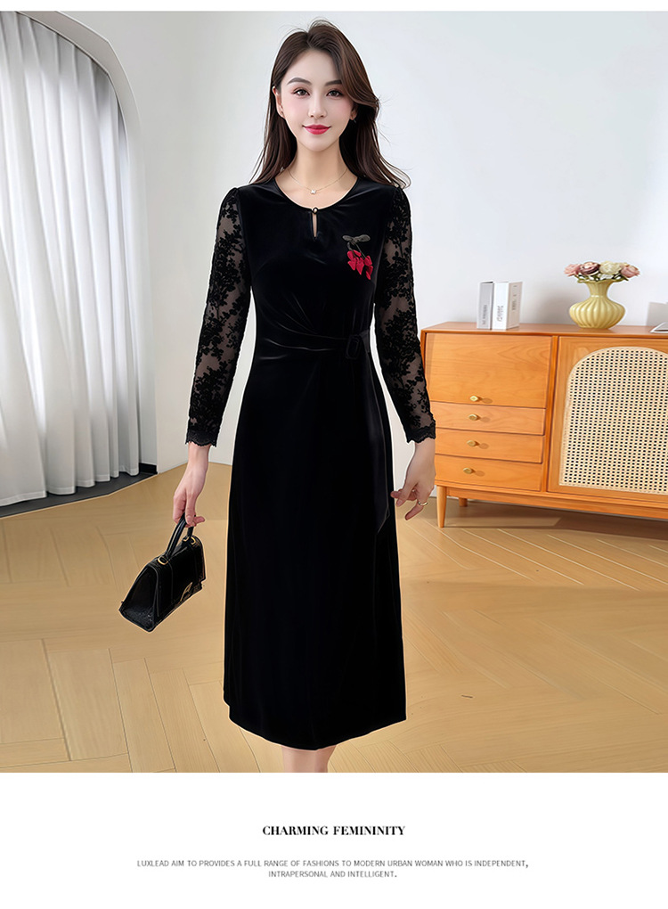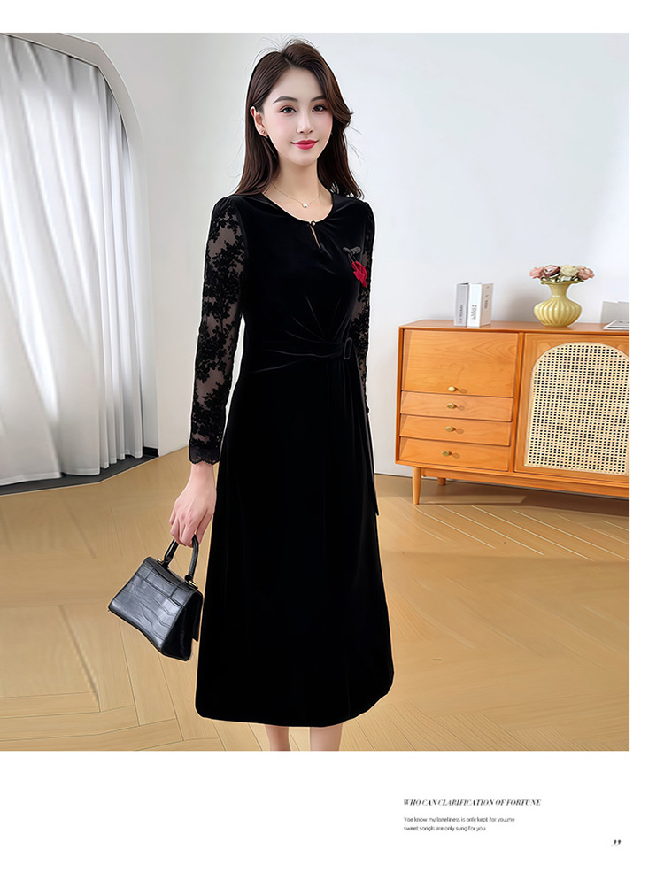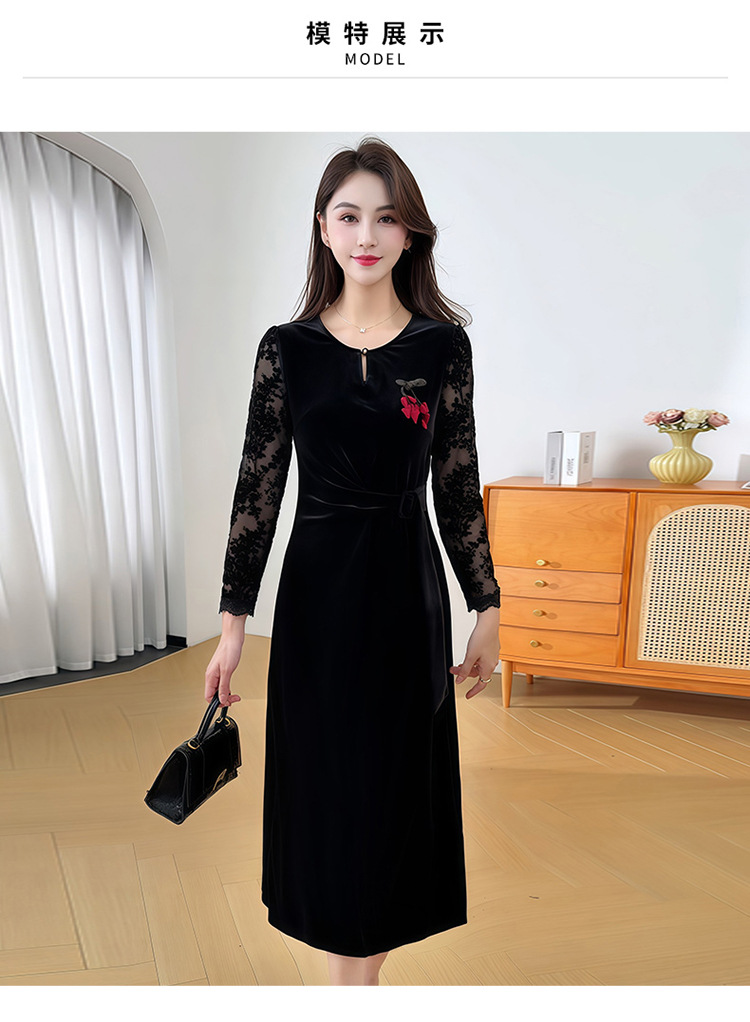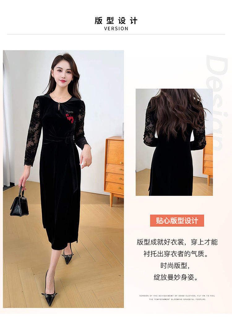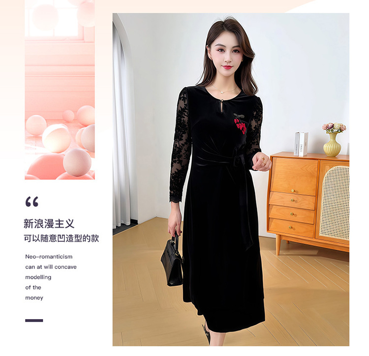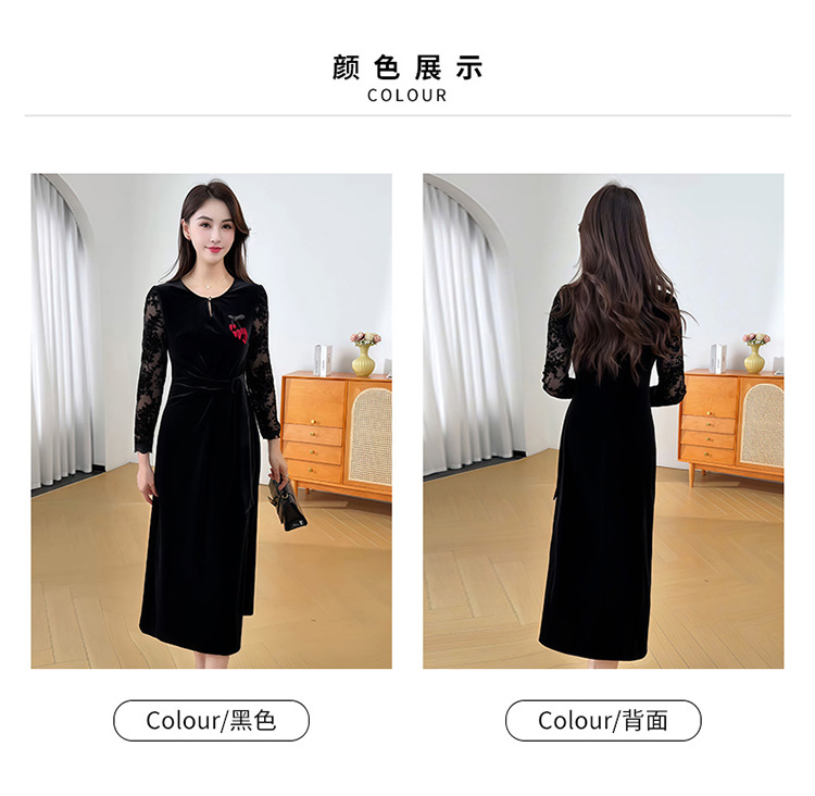 QYM LZ25B2515-Y优雅风金丝绒连衣裙洋气蕾丝拼结网纱裙