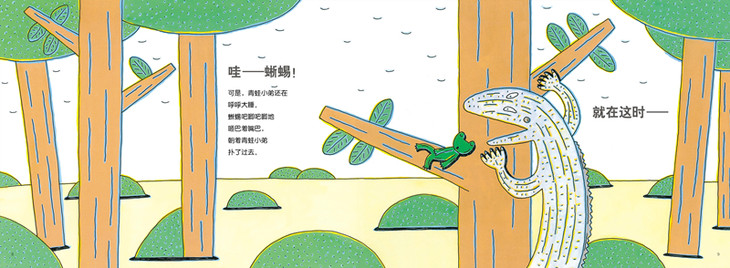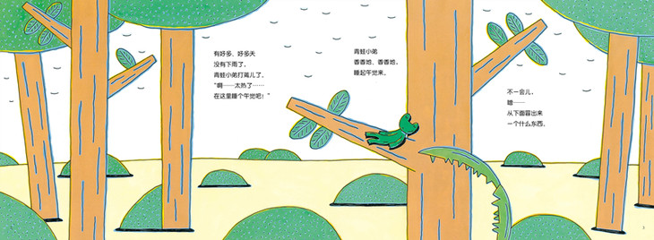 ★ 《青蛙小弟睡午觉》的故事讲得***巧妙。宫西达也用重复的叙事手法推动故事发展,通过设置大量悬念来展现戏剧张力。敌人一次次靠近,青蛙小弟一次次侥幸逃生,随着情节推进,孩子们会跟着青蛙小弟一起紧张、激动、窃喜,体验到酣畅淋漓的游戏乐趣。