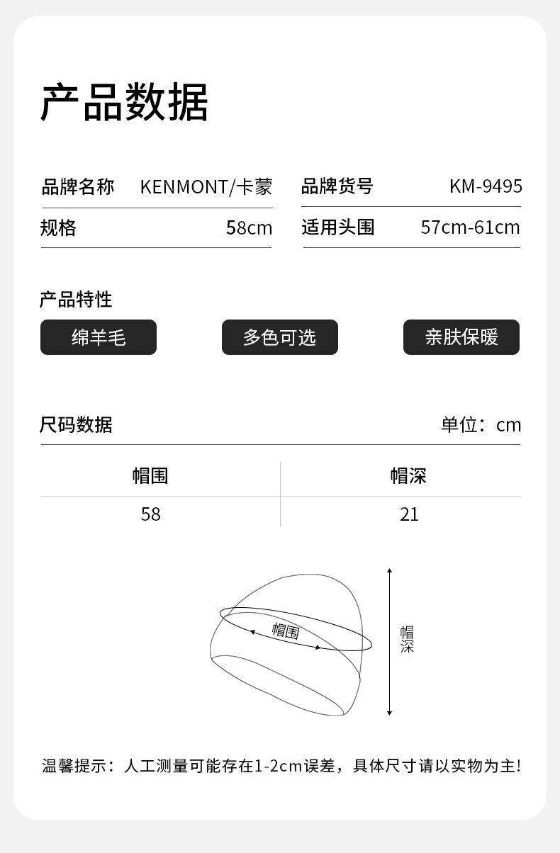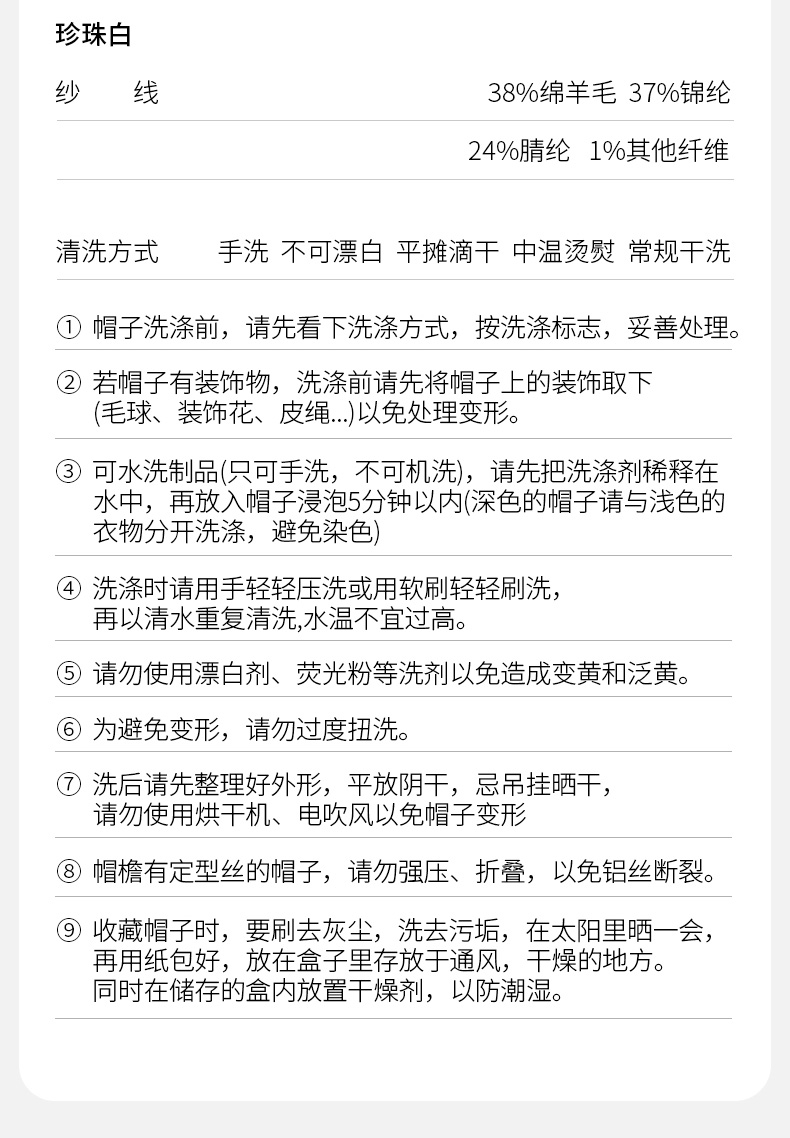【其他注意事项】注意帽子的洗涤方式,每顶帽子都有吊牌