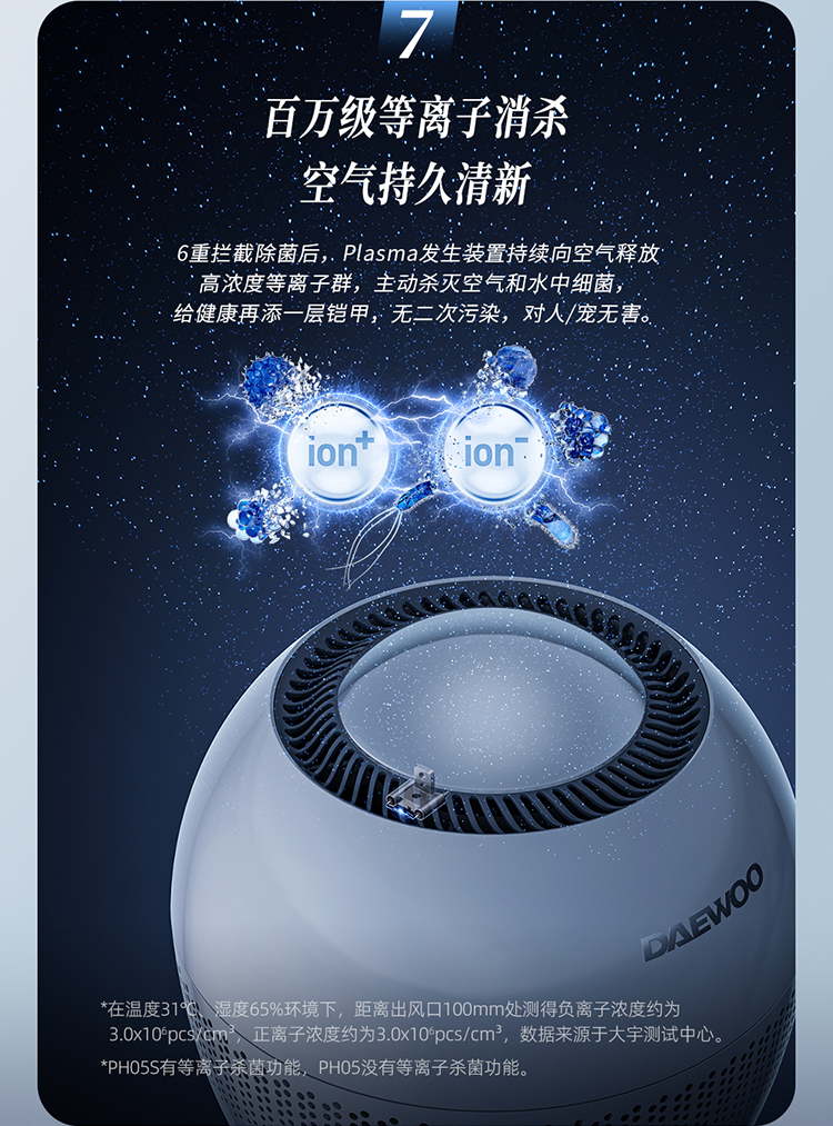 3、【百万级等离子】:8重除菌后,Plasma装置释放高浓度等离子群,主动消杀空气和水中细菌