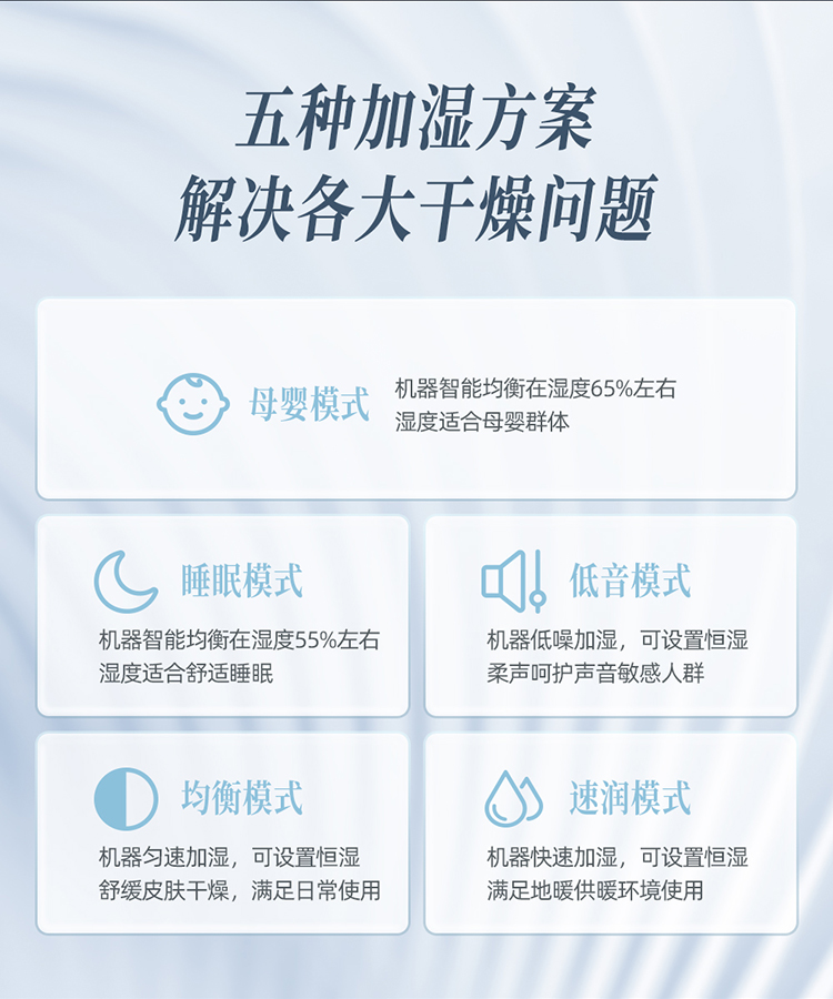 5、【五大模式】:五种加湿方案,解决各大干燥问题,呵护易敏人群