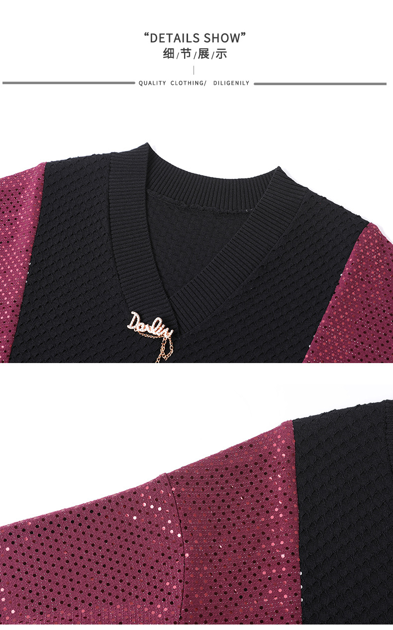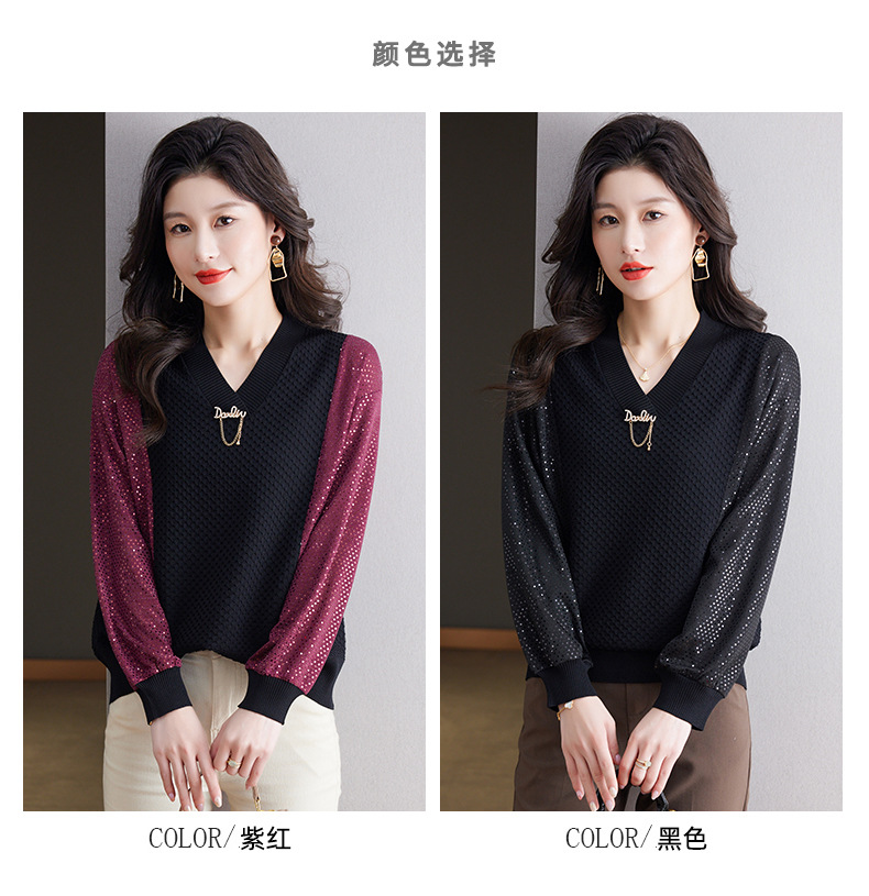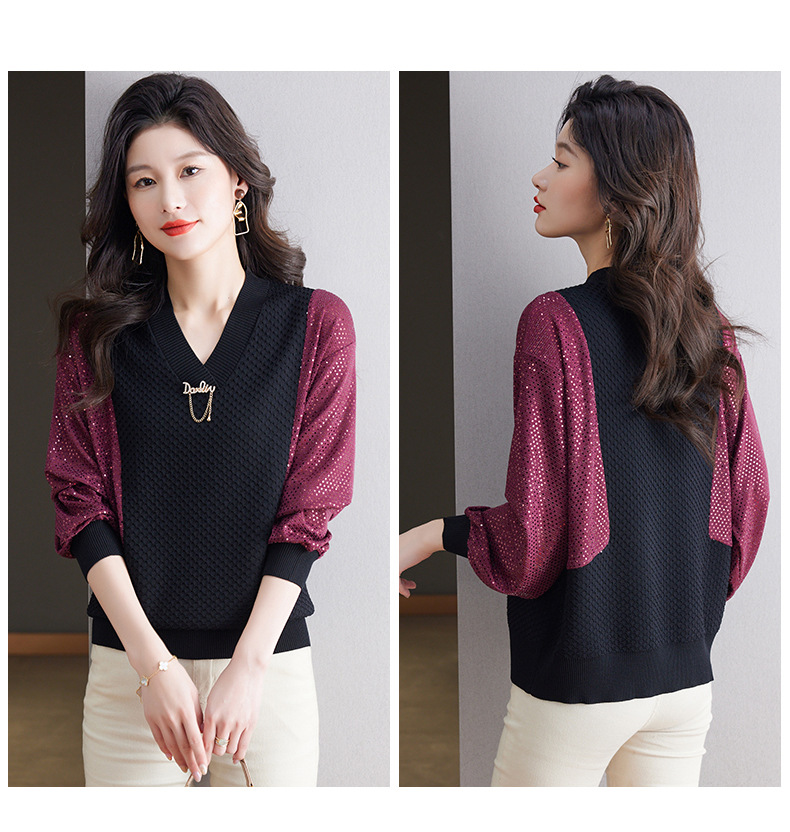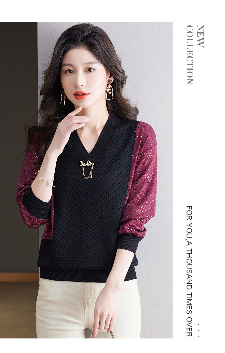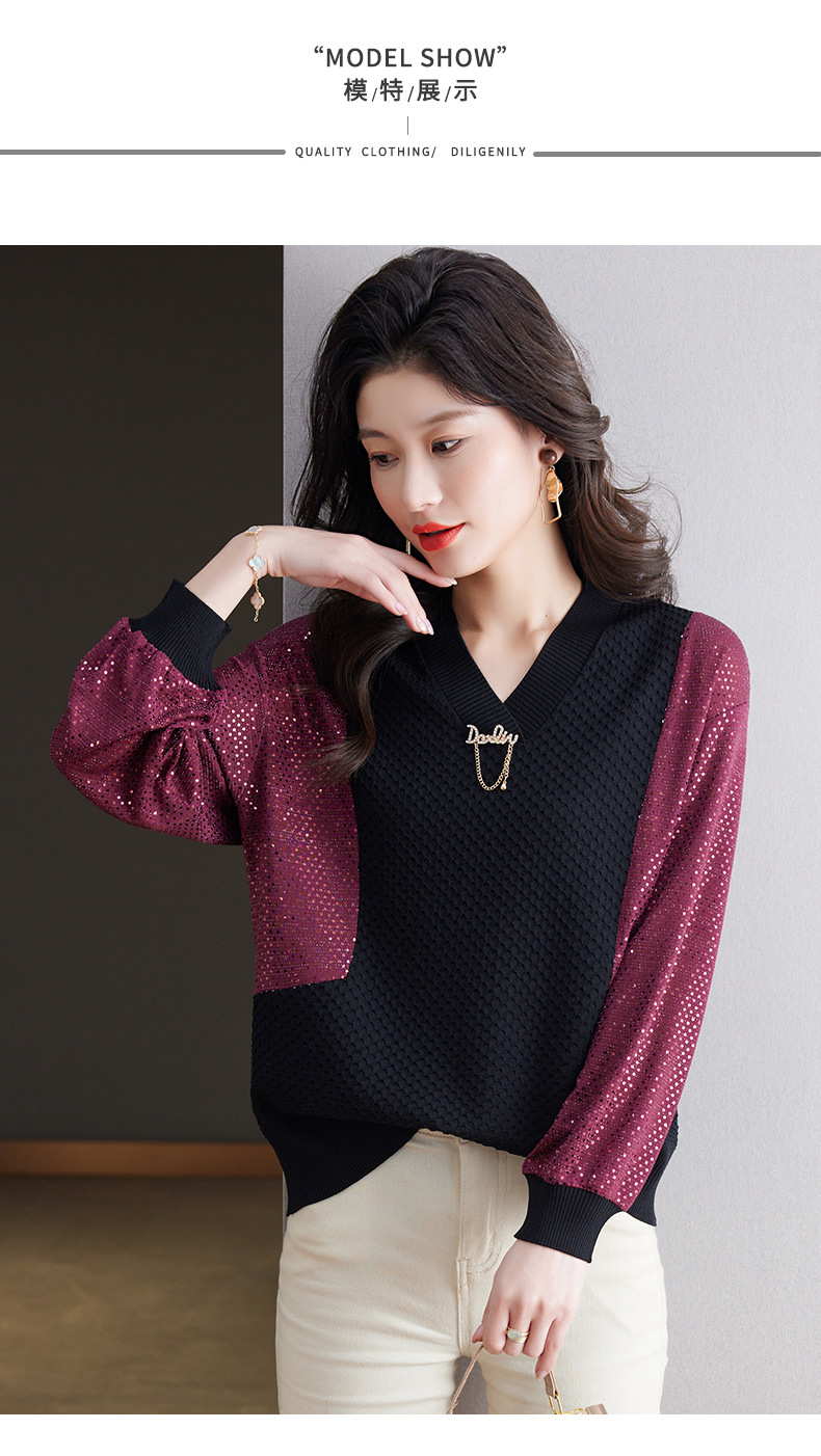 E3983 V领重工亮片长袖拼接上衣女2024年春秋洋气套头宽松针织打底毛衣