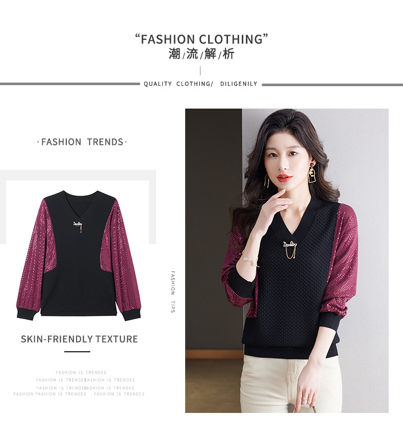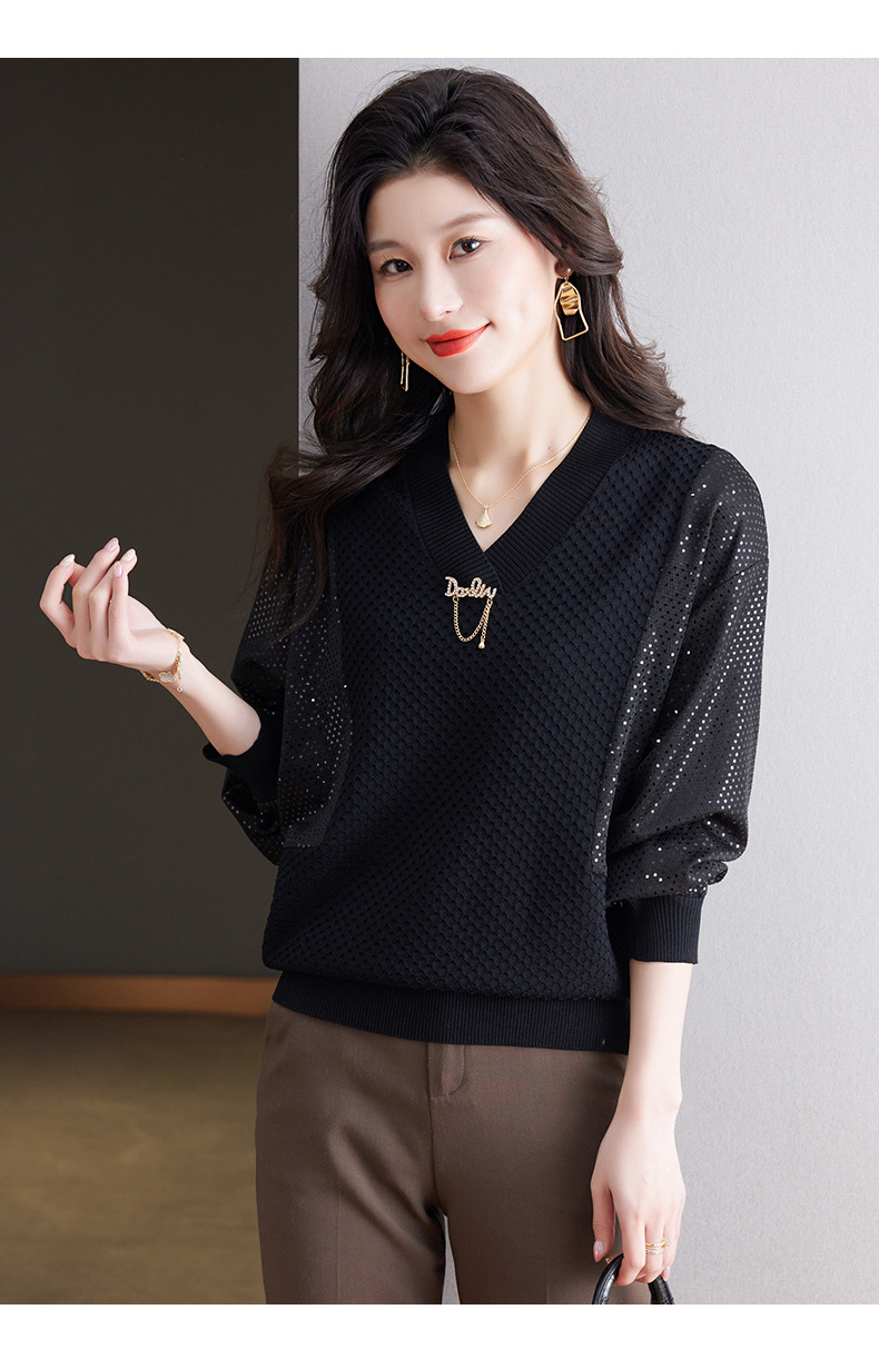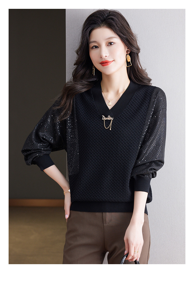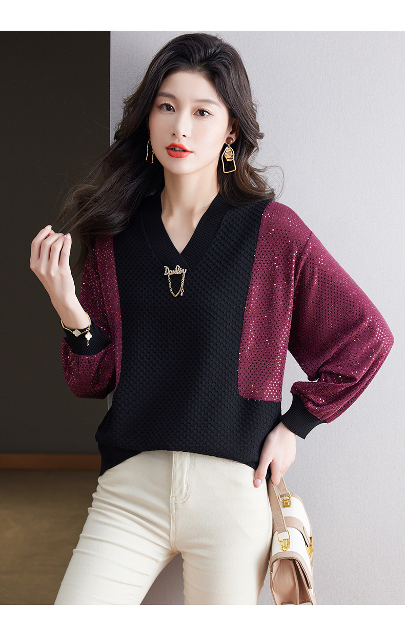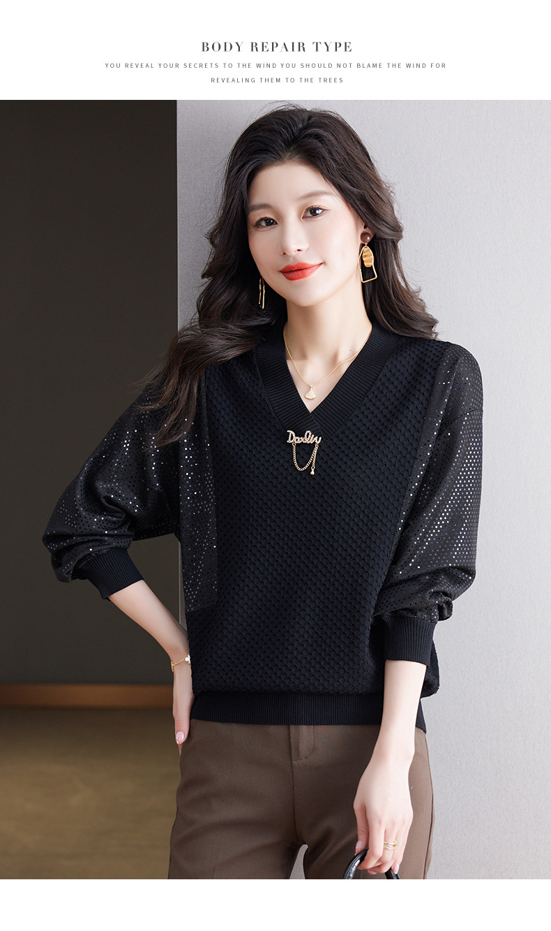 E3983 V领重工亮片长袖拼接上衣女2024年春秋洋气套头宽松针织打底毛衣
