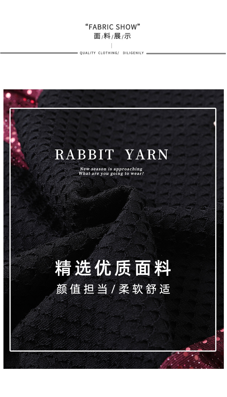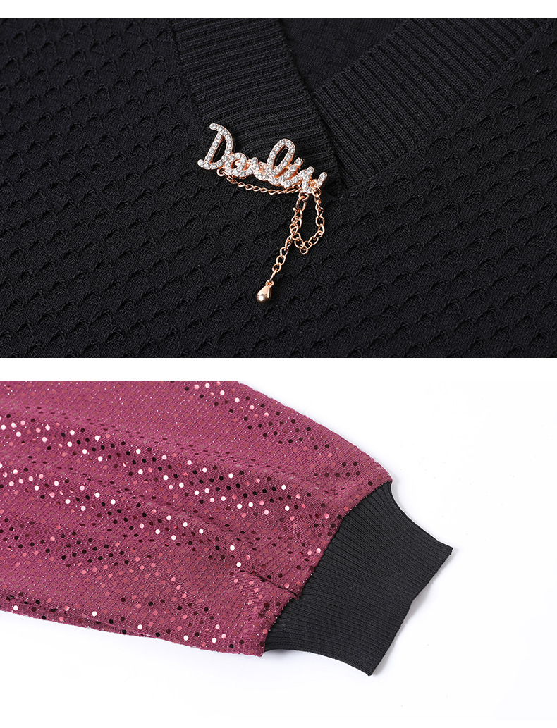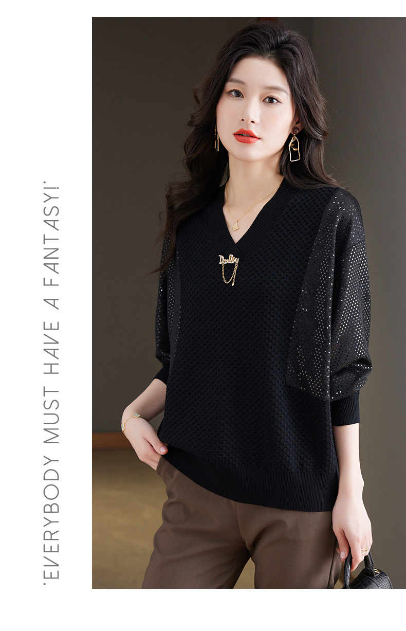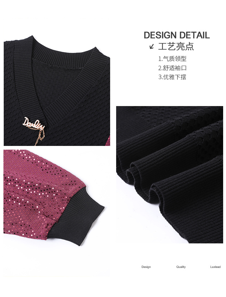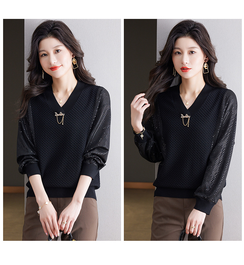 E3983 V领重工亮片长袖拼接上衣女2024年春秋洋气套头宽松针织打底毛衣