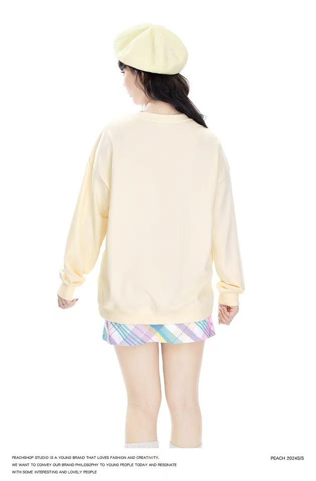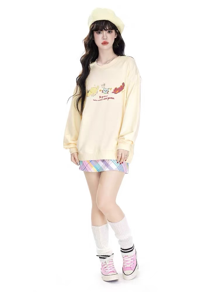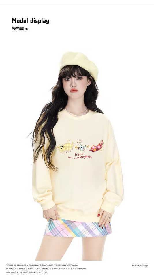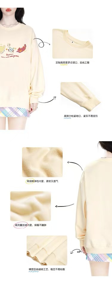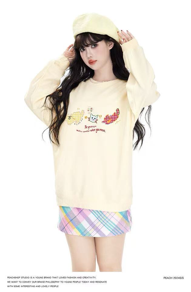 🔥🔥【潮牌卫衣】圆领牛奶绒~日系格子猫咪印花加绒牛奶绒卫衣-喜出