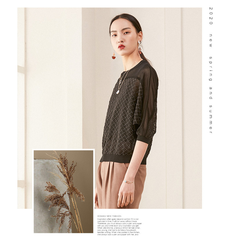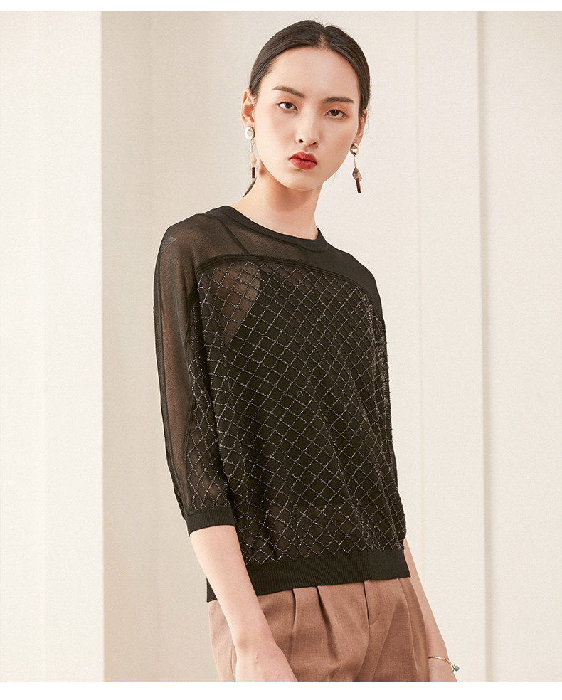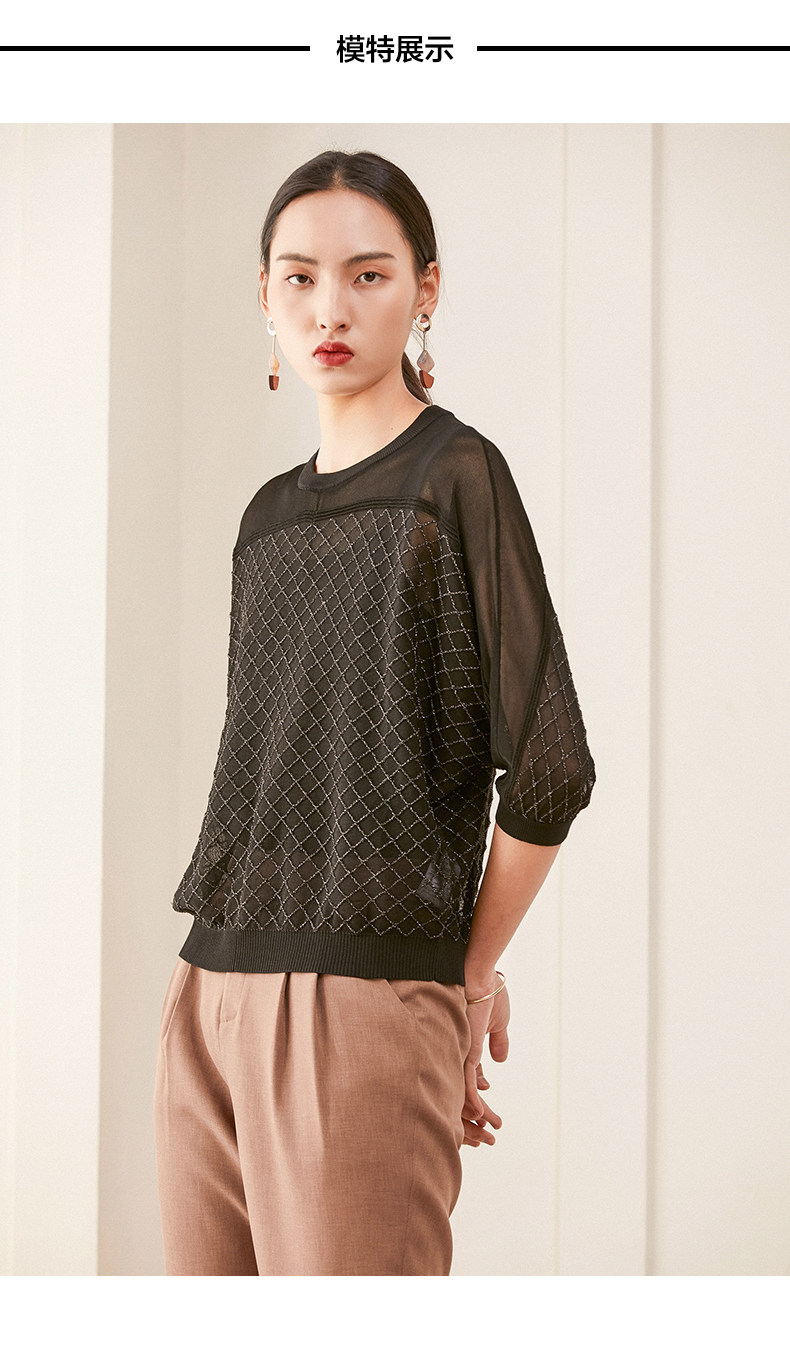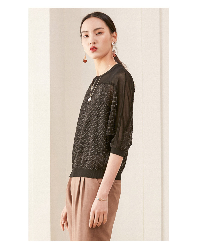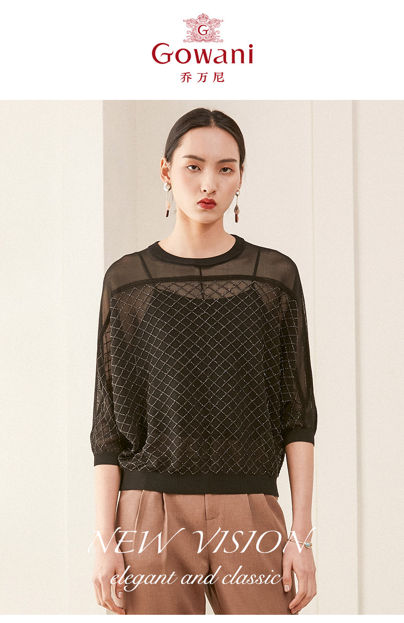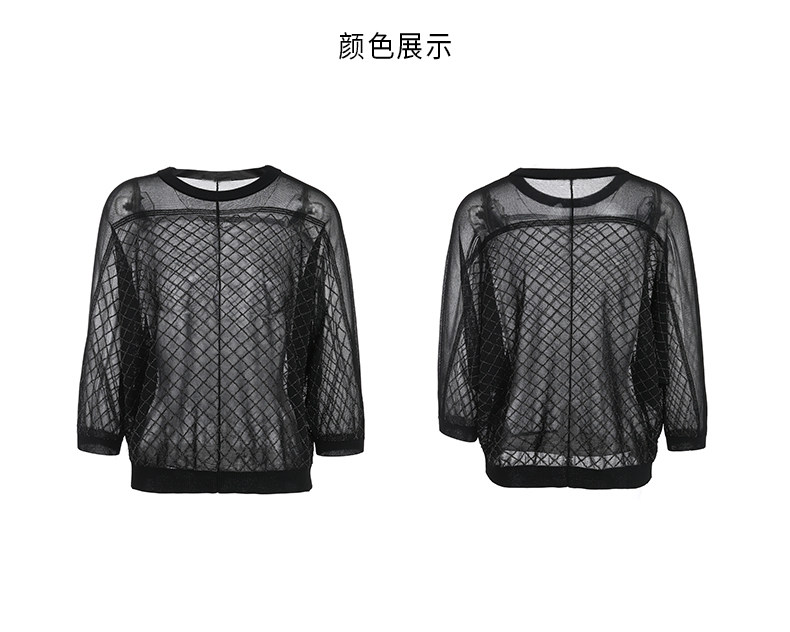 乔万尼夏季长袖薄款套头上衣宽松休闲黑色针织衫ES1M011