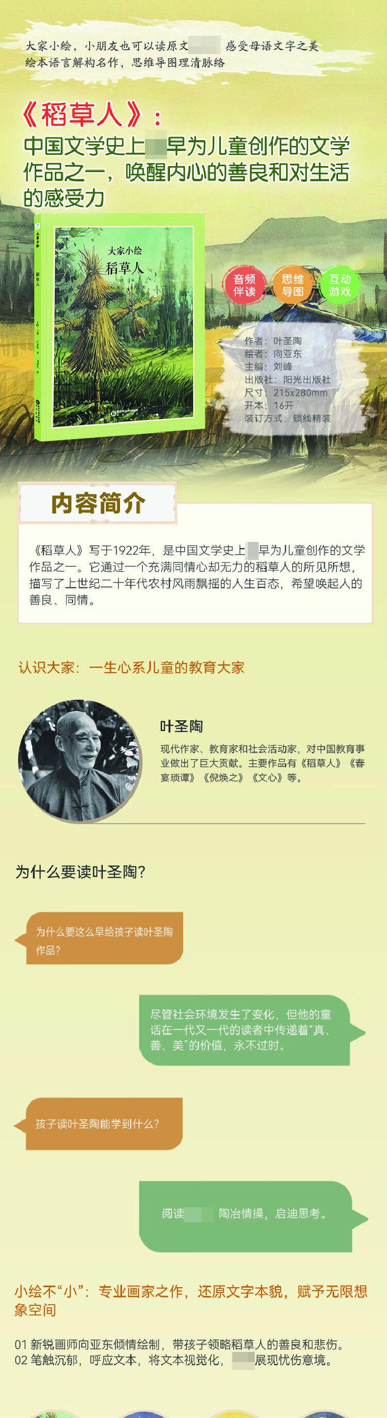 叶圣陶在中国儿童文学领域,尤其是童话领域具有突出贡献。他创作了中国现代专为儿童而写的童话集《稻草人/**文学名著》,被鲁迅称赞为“给中国童话开了一条自己创作的路”。他的作品《古代英雄的石像》《爬山虎的脚》《稻草人/**文学名著》《光明的世界》《小小的船》等被选入中小学生语文课本。