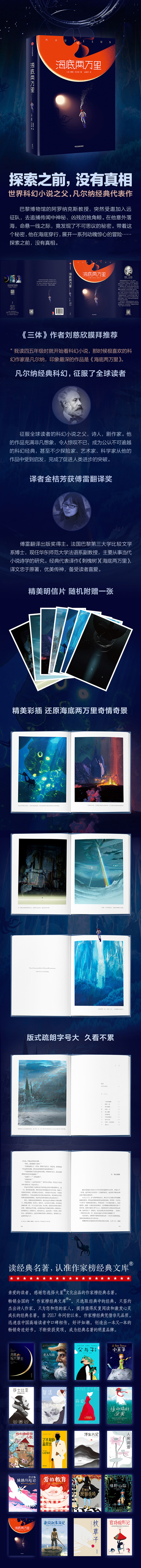 4.获奖译者、华东师范大学法语系副金桔芳,特别撰写5300多字精彩导读,讲透《海底两万里》背后的传奇故事、文学地位、作者经历;全书新增7幅精美彩插,突破性还原海底两万里奇情奇景,增加阅读乐趣。