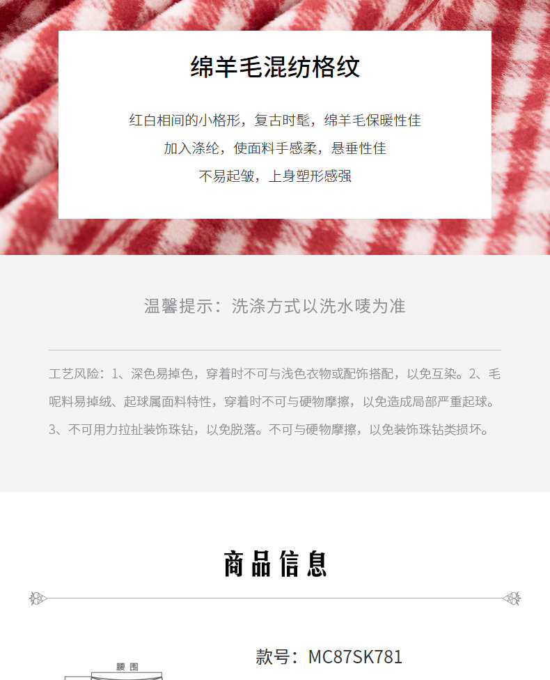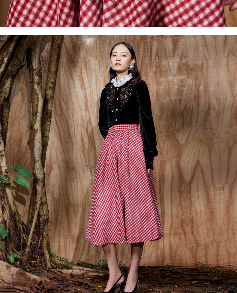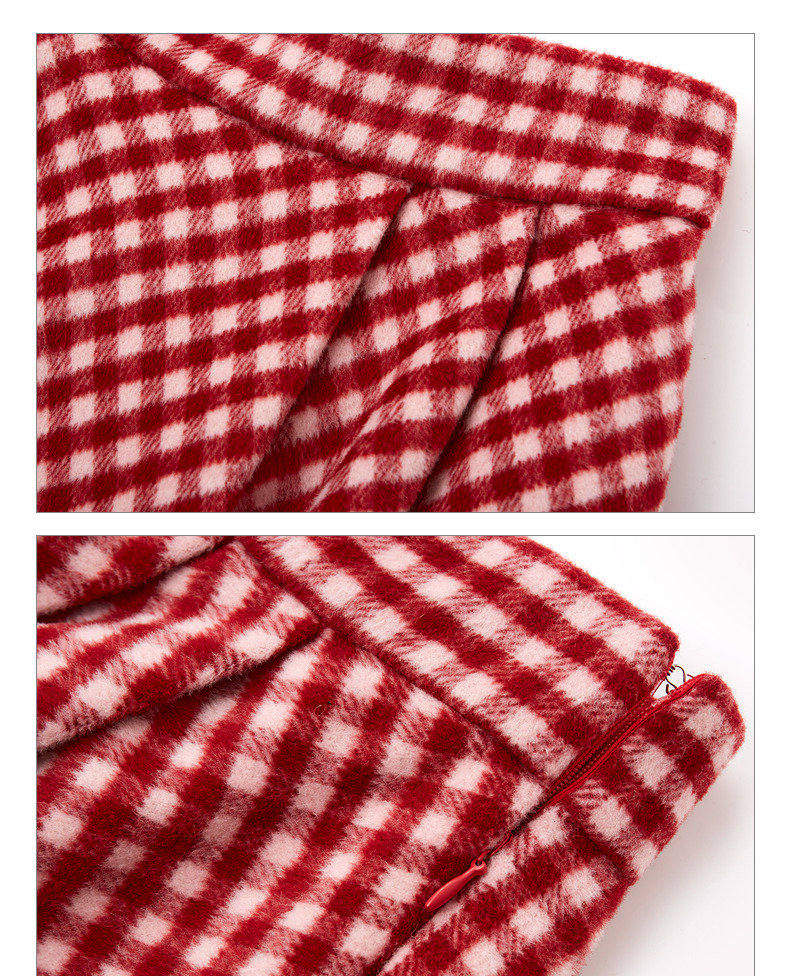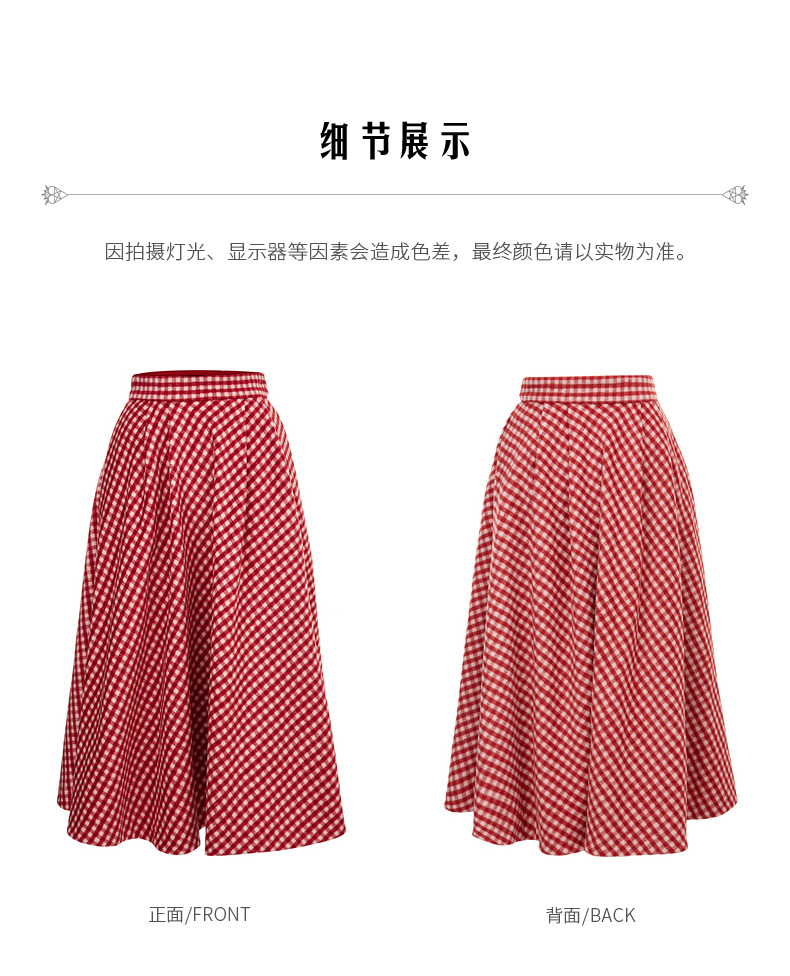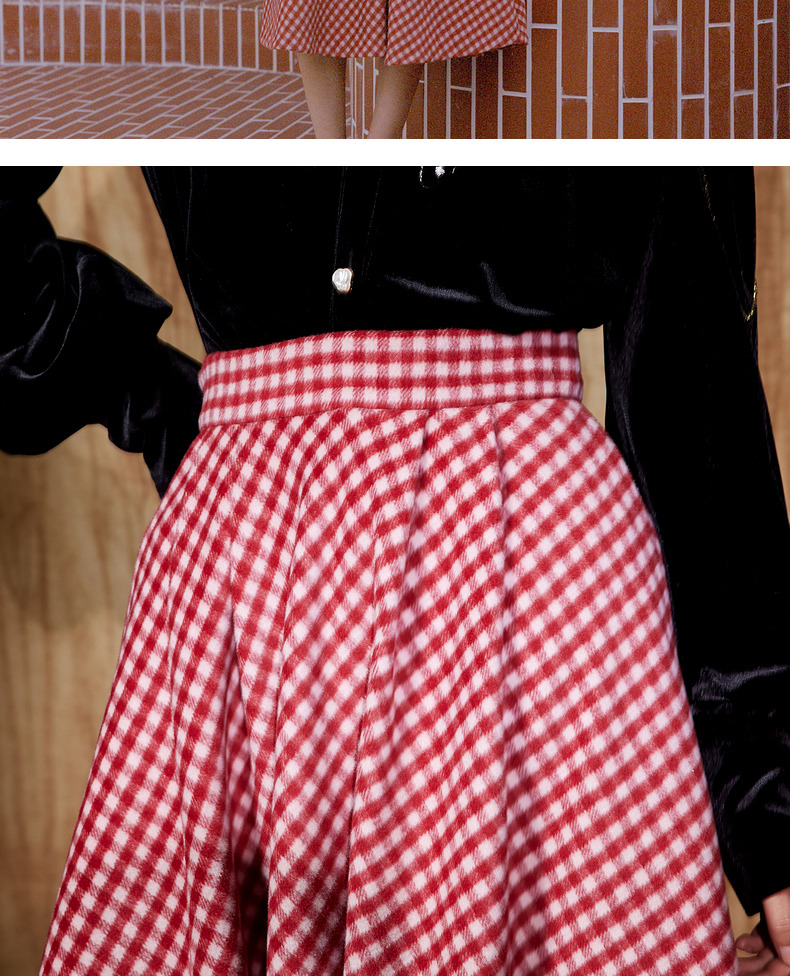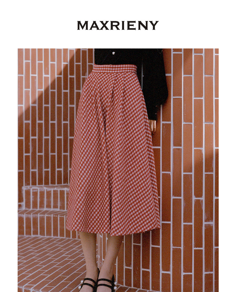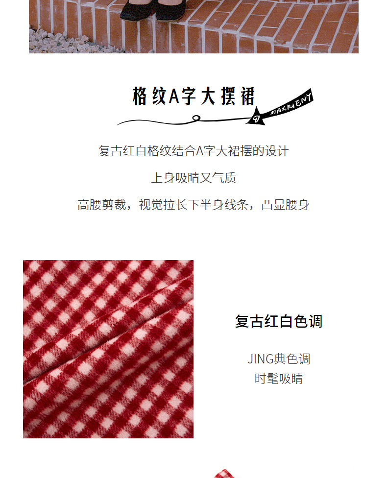MAXRIENY复古红白格纹长裙秋冬法式高腰A字裙大摆裙春节新年穿搭(货号:MC87SK781)
